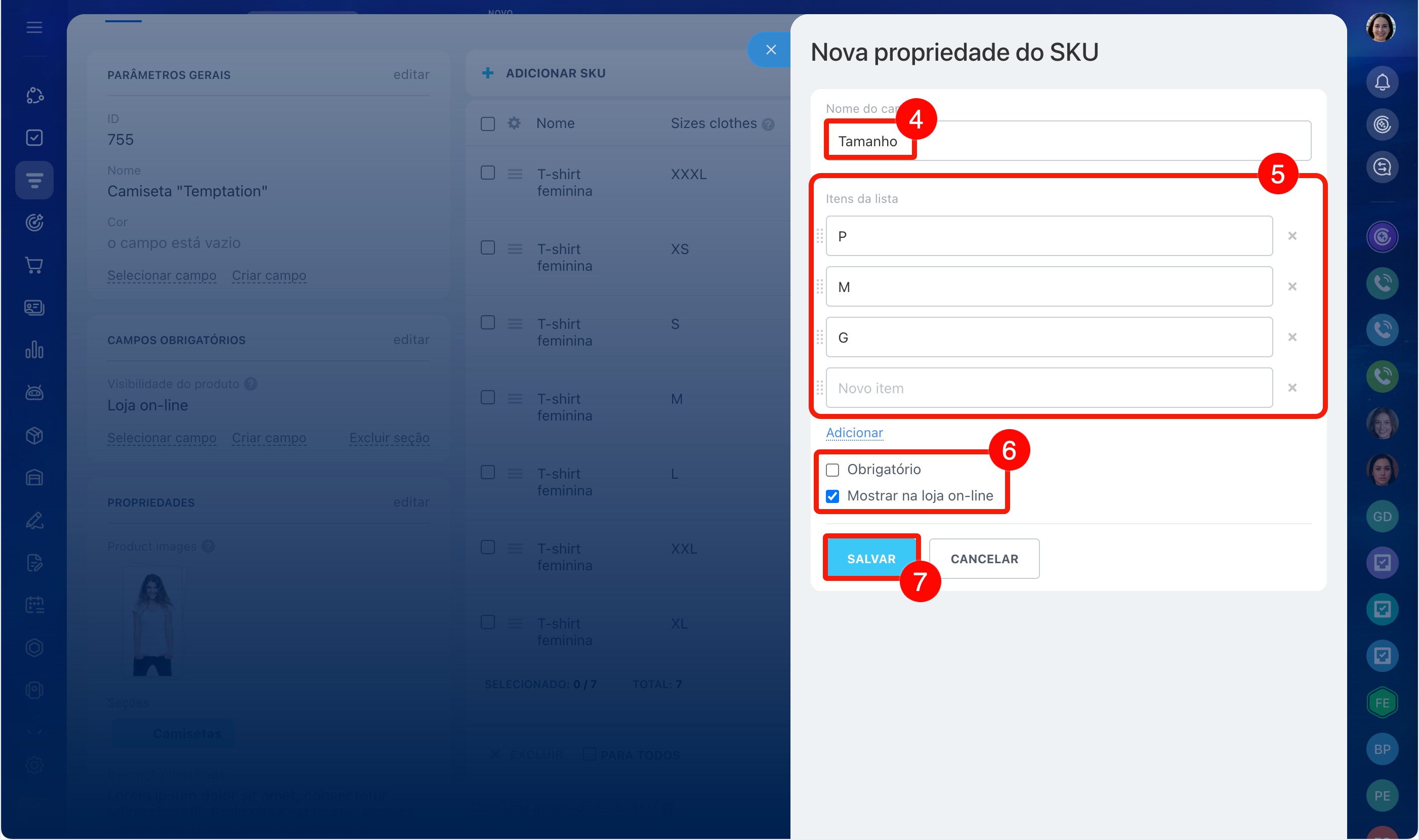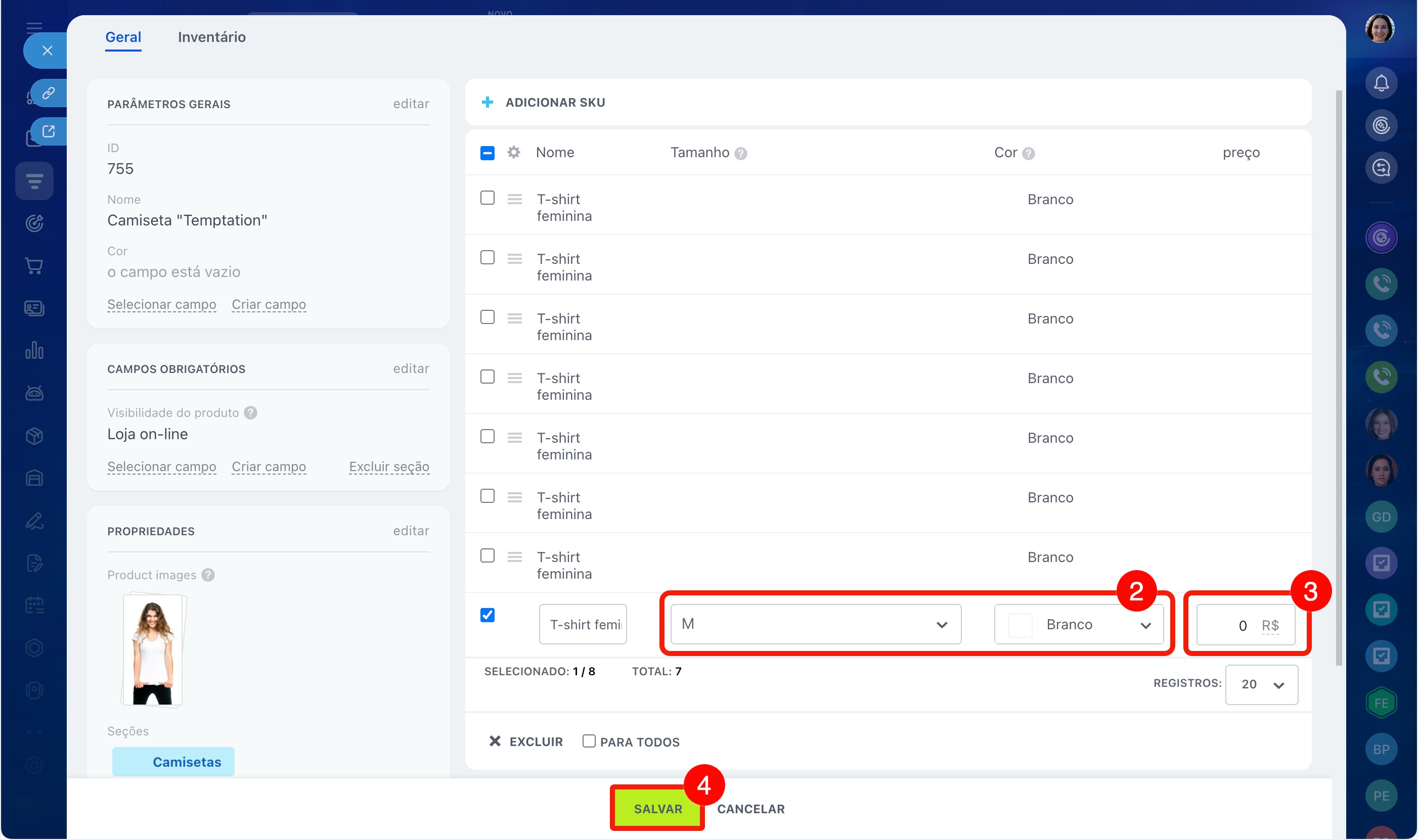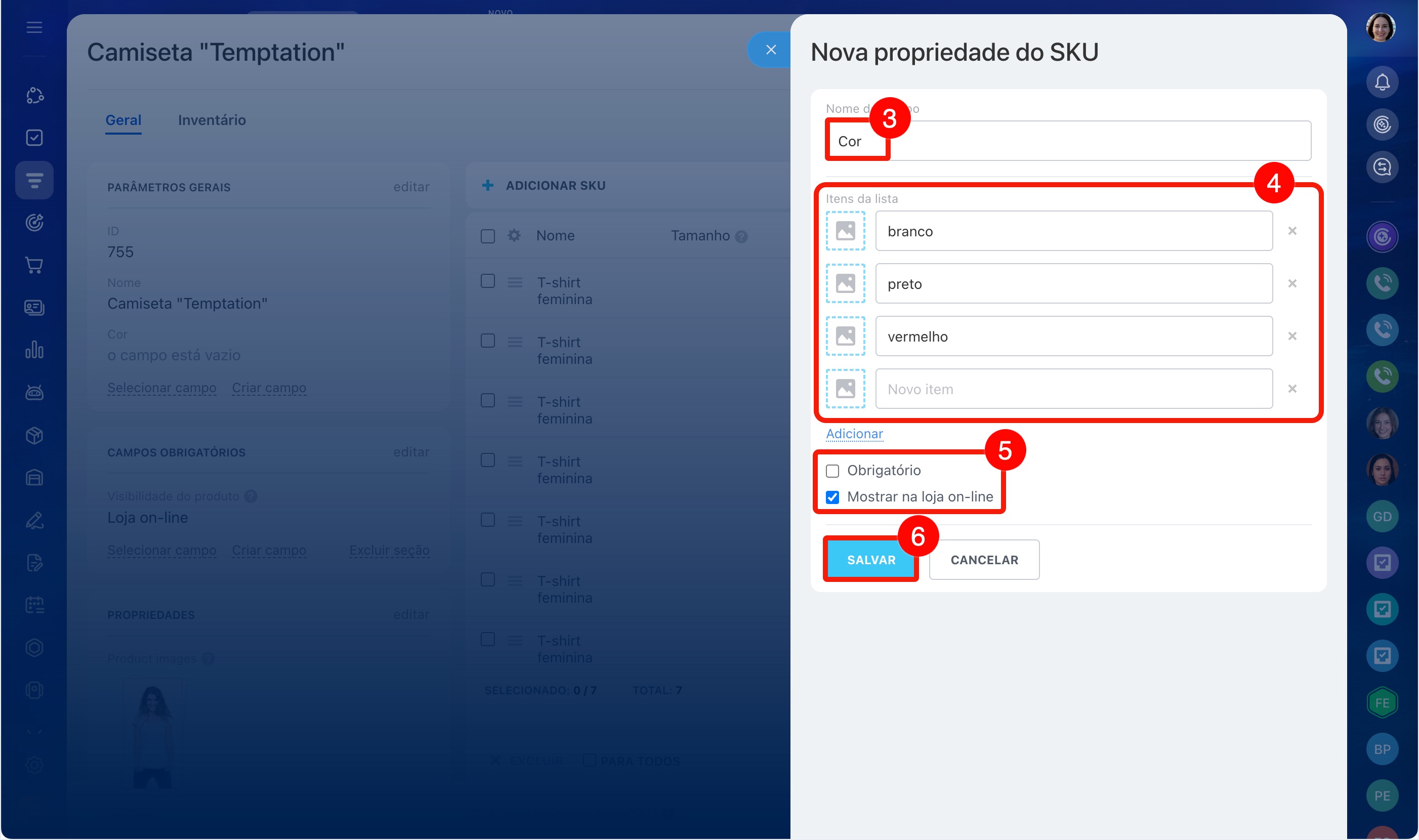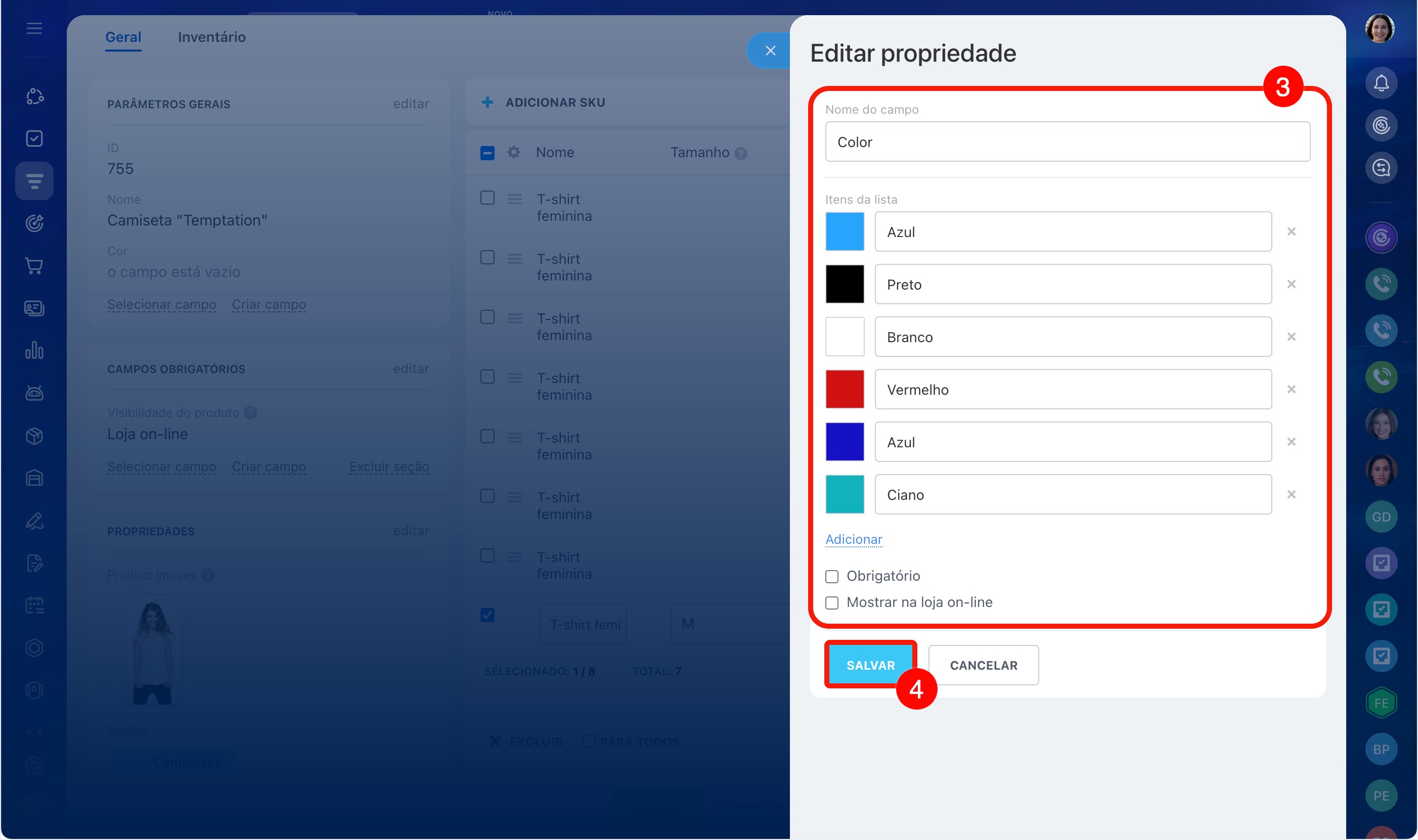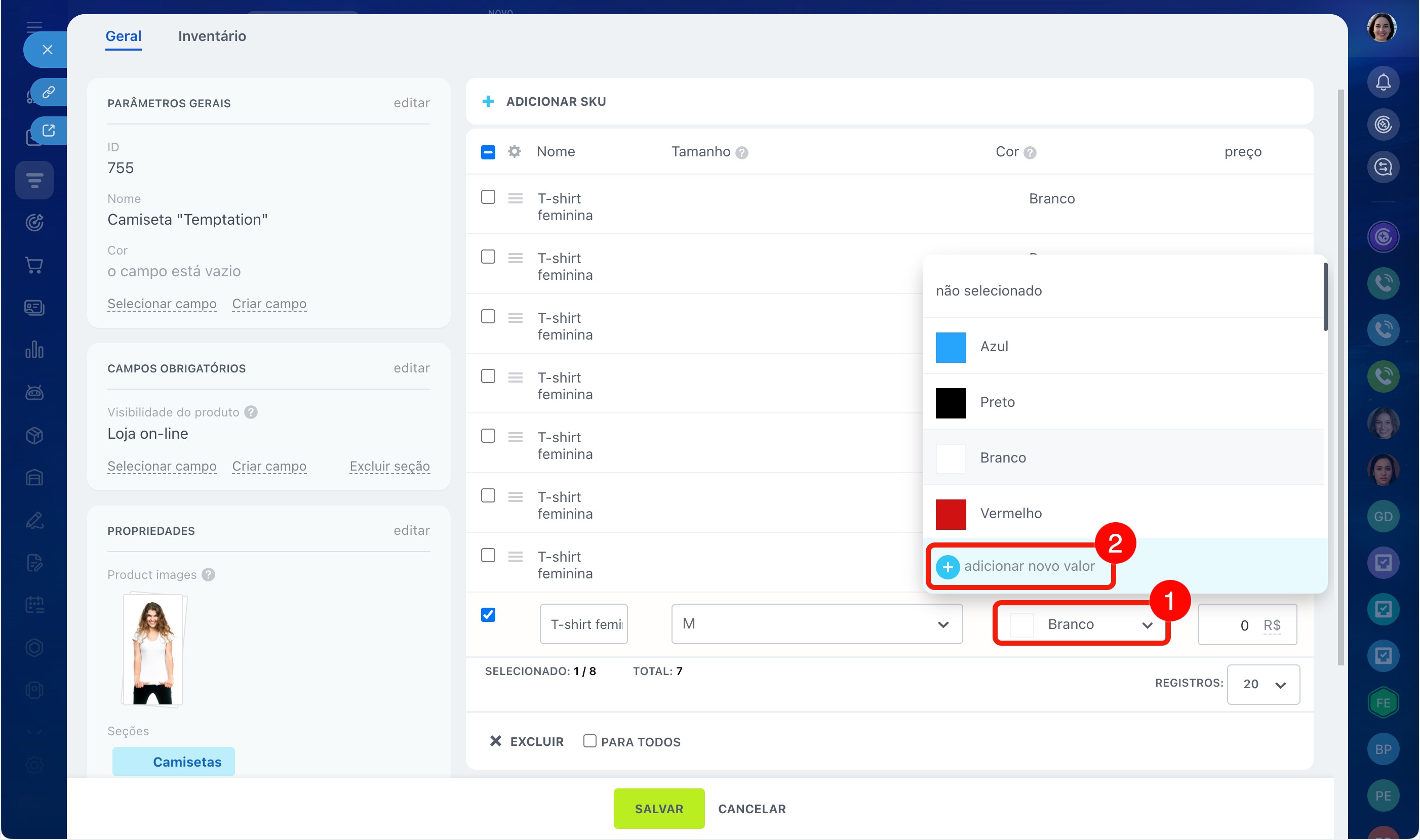 Por exemplo, você vende uma camiseta em três cores e cinco tamanhos. Para não criar 15 produtos separados, você pode configurar as propriedades Cor e Tamanho e adicionar as variações: o vendedor poderá escolher a opção desejada diretamente no cartão do CRM.