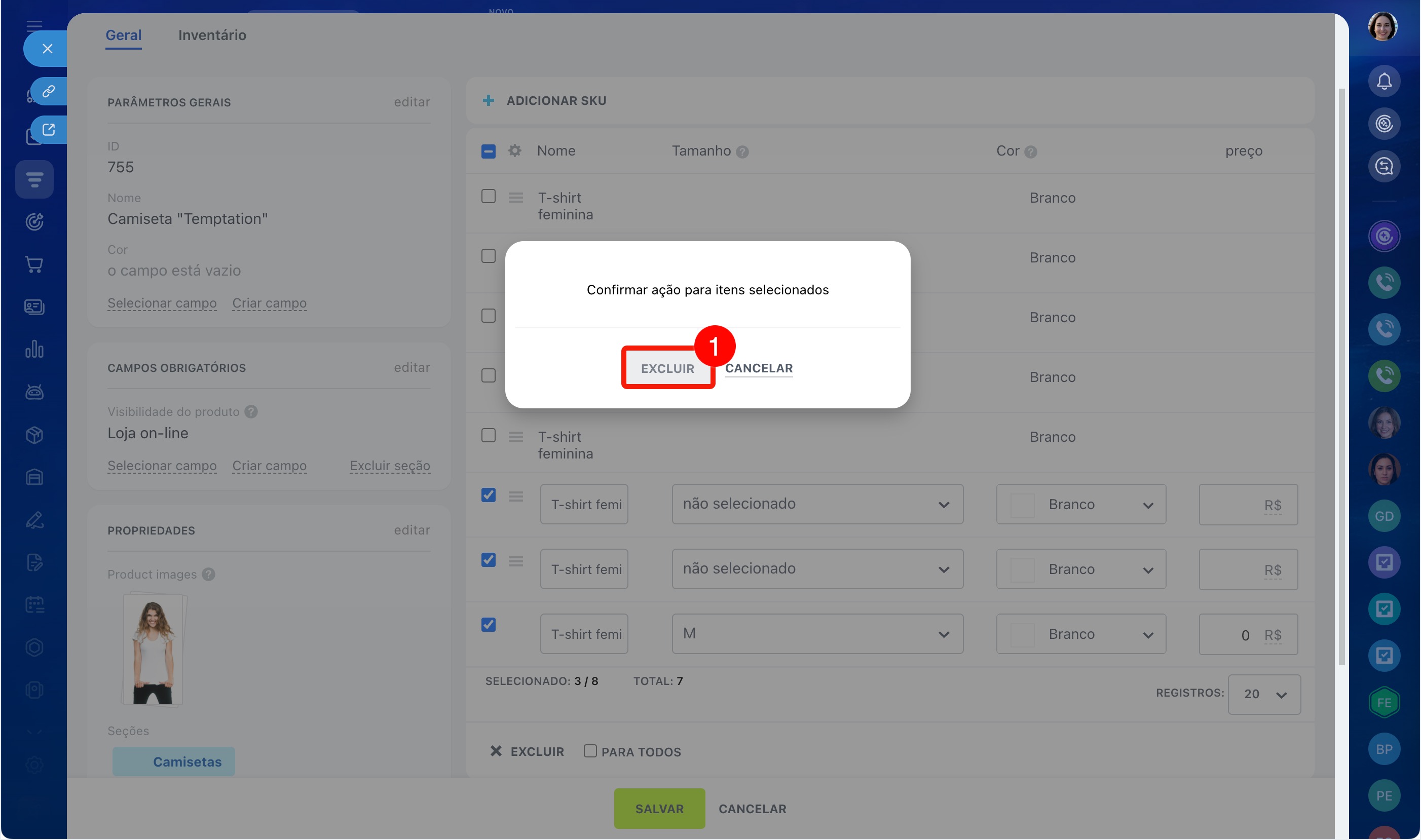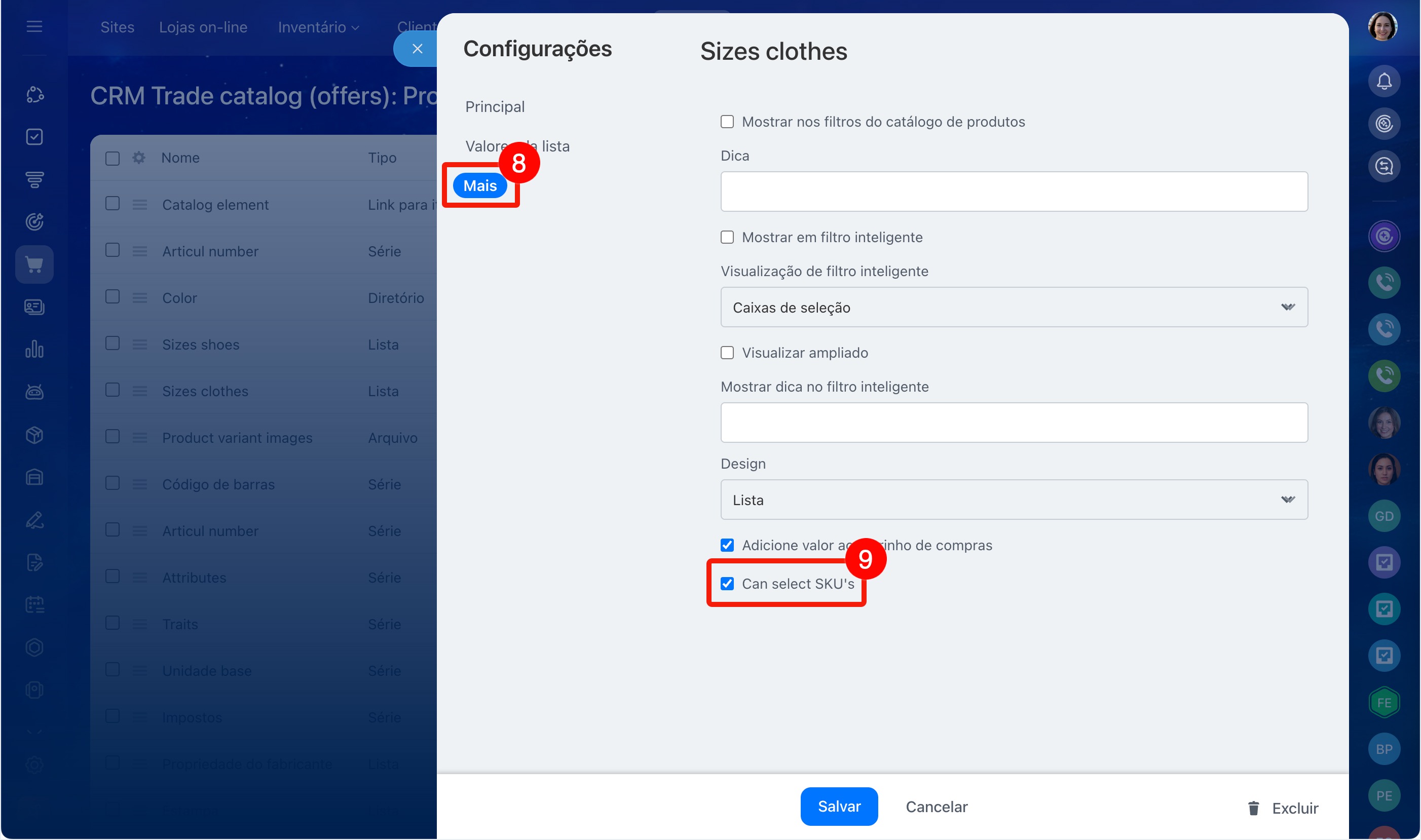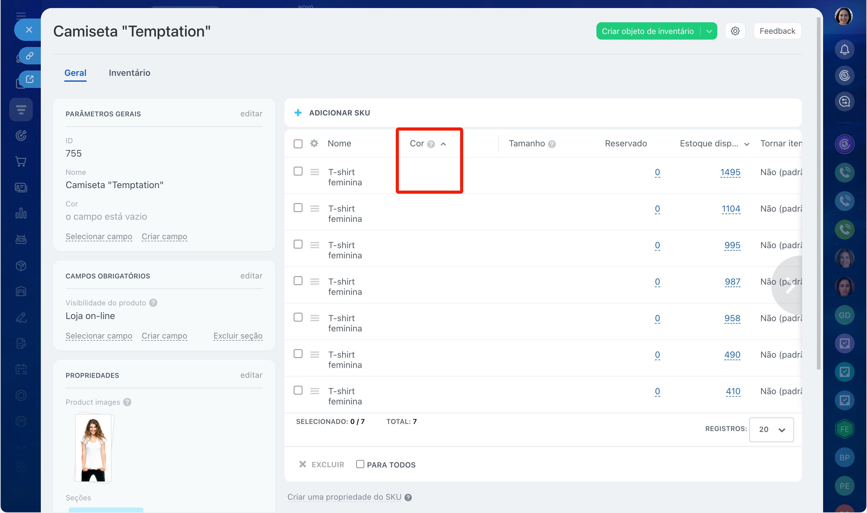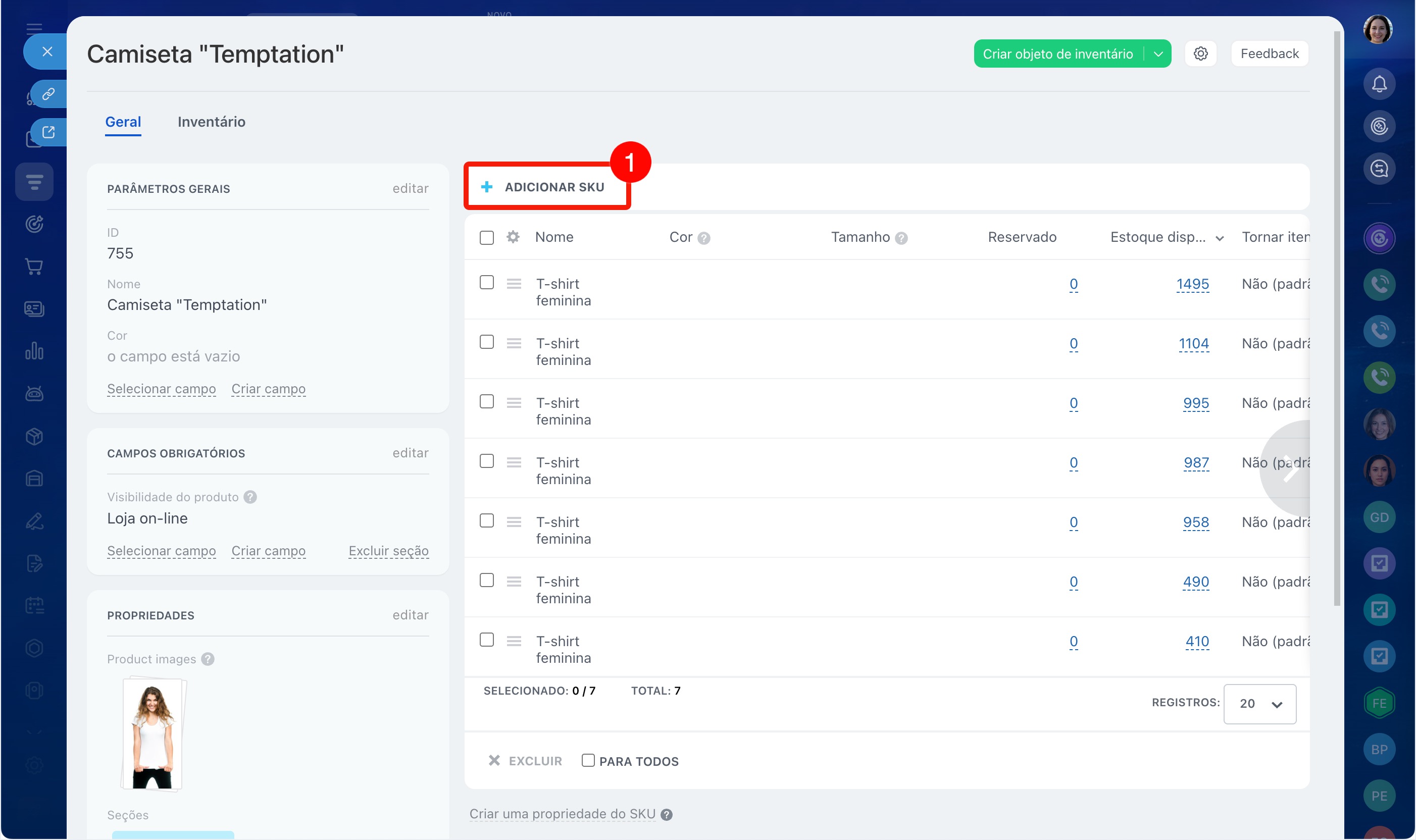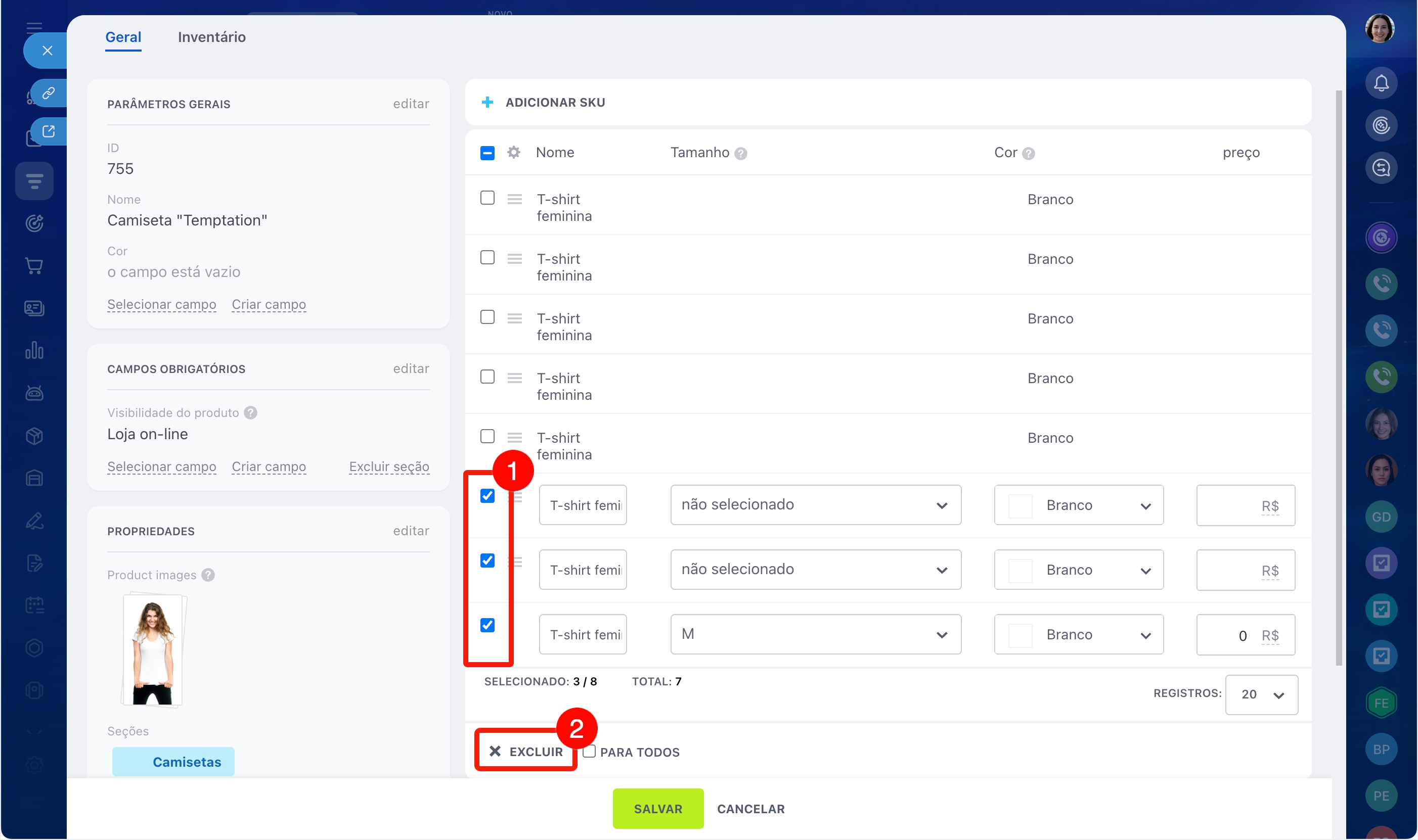 Por exemplo, você vende uma camiseta em três cores e cinco tamanhos. Para não criar 15 produtos separados, você pode configurar as propriedades Cor e Tamanho e adicionar as variações: o vendedor poderá escolher a opção desejada diretamente no cartão do CRM.