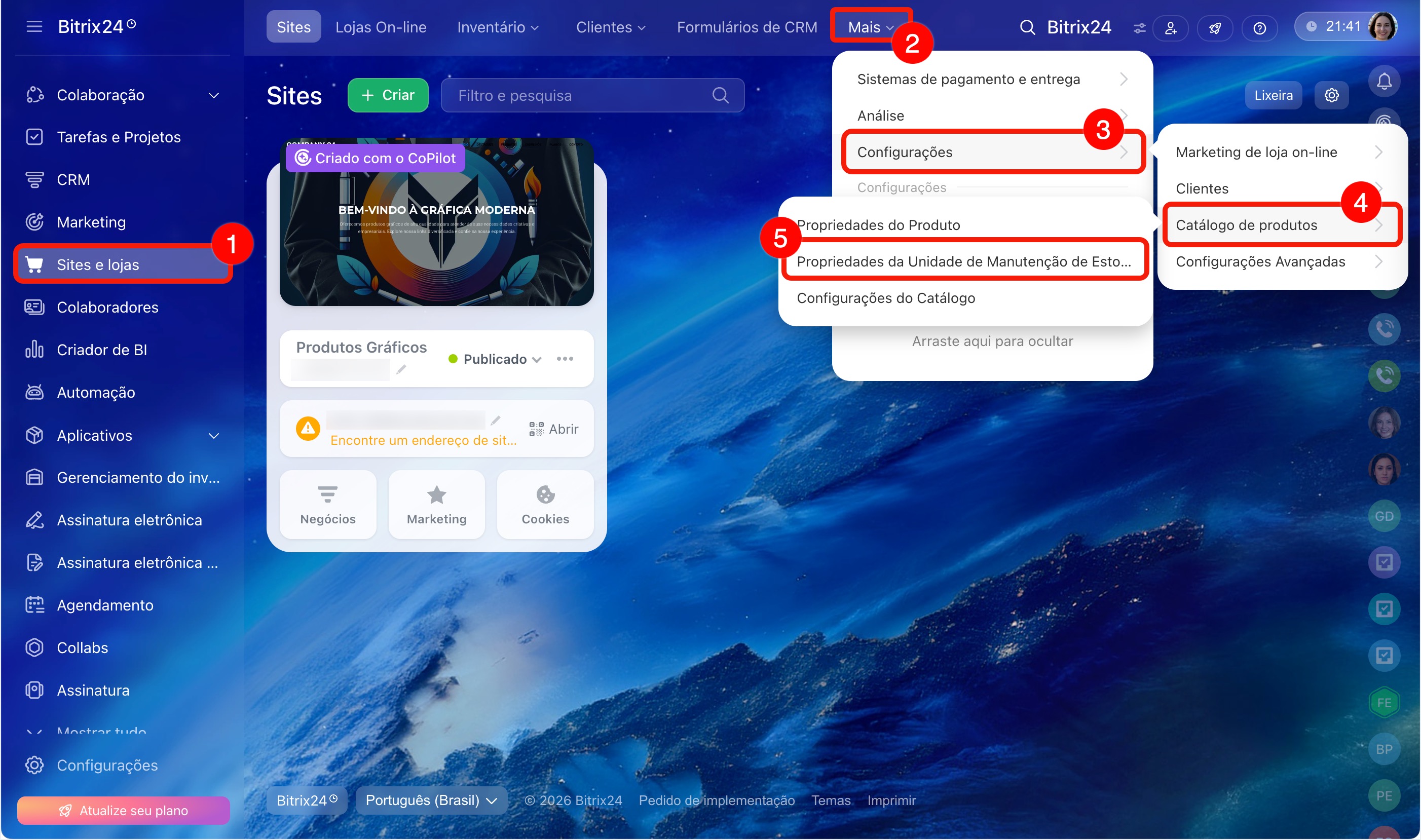 1–5. Acesse a seção Sites e Lojas > Mais > Configurações > Catálogo Comercial > Propriedades das ofertas comerciais.
