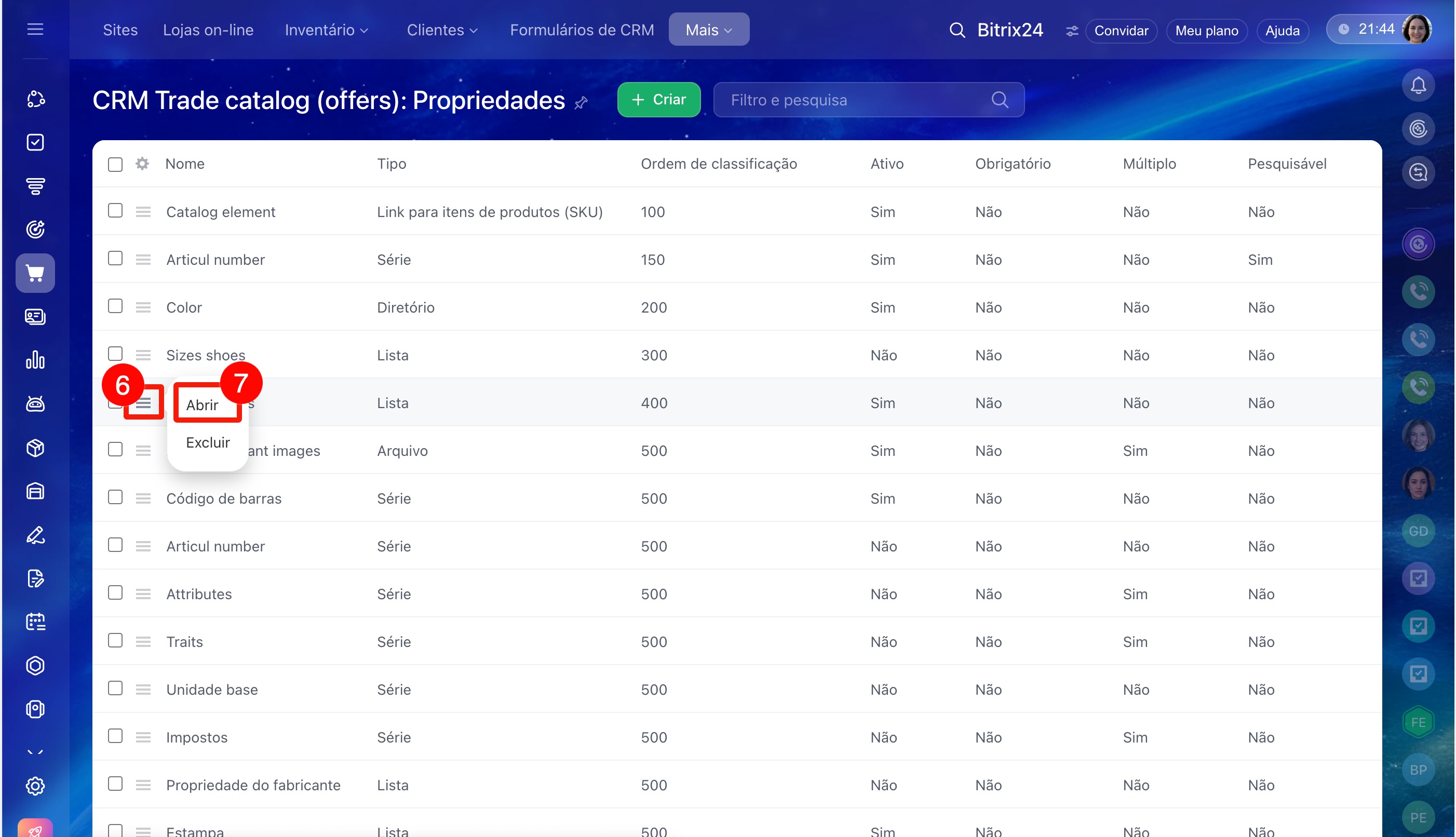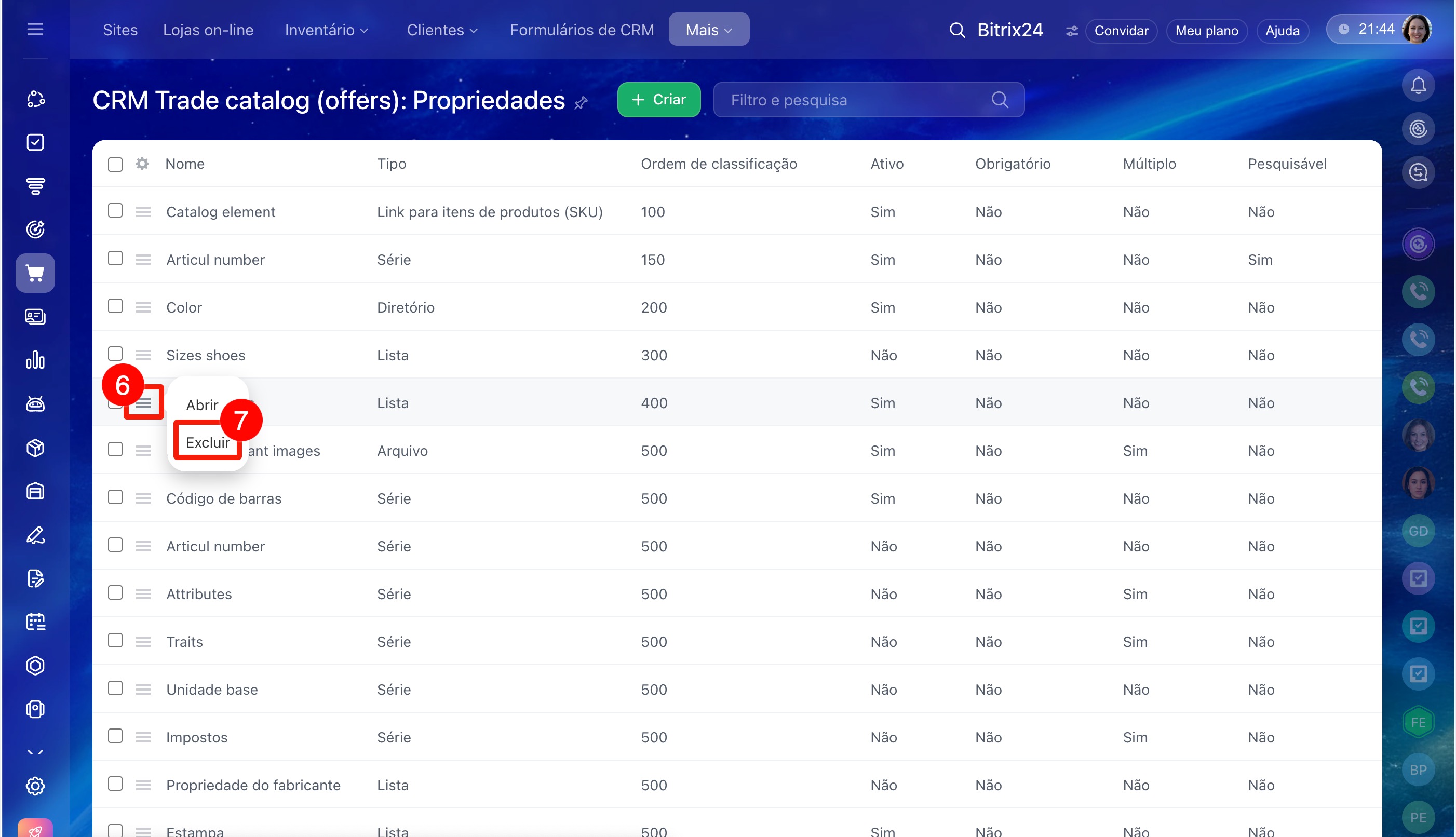 Podem excluir uma propriedade de variação o administrador do Bitrix24 e um colaborador com acesso às configurações do catálogo de produtos.