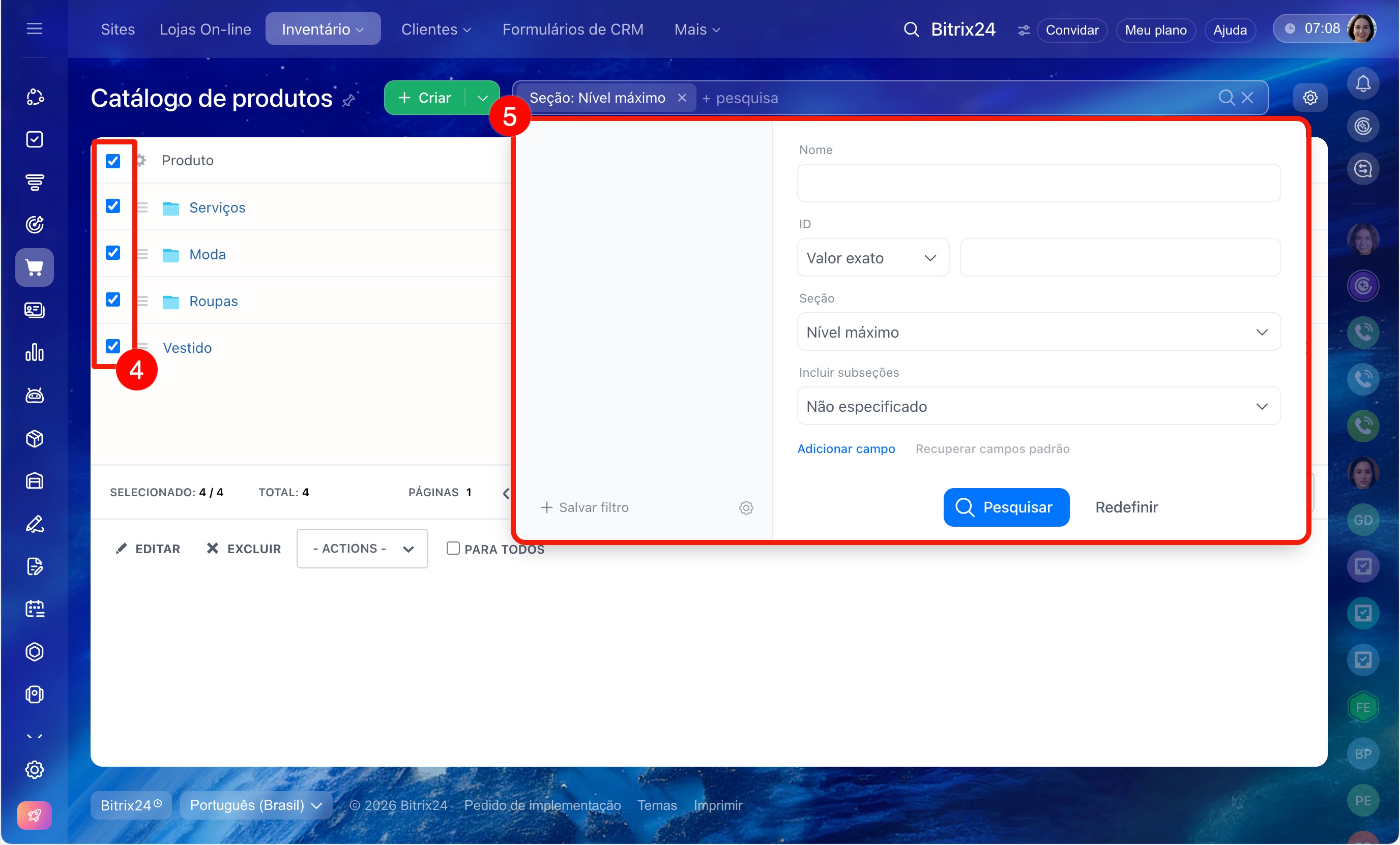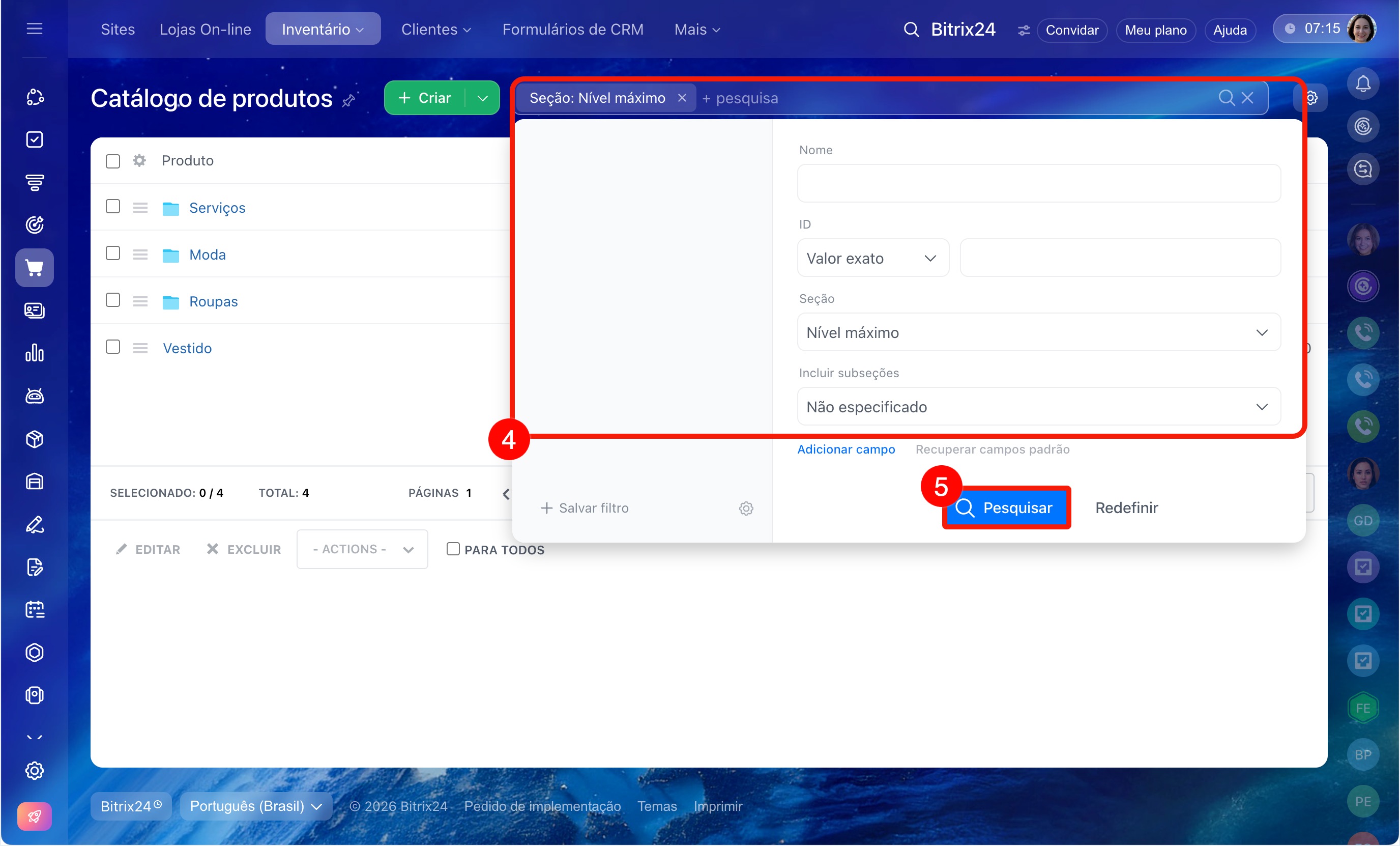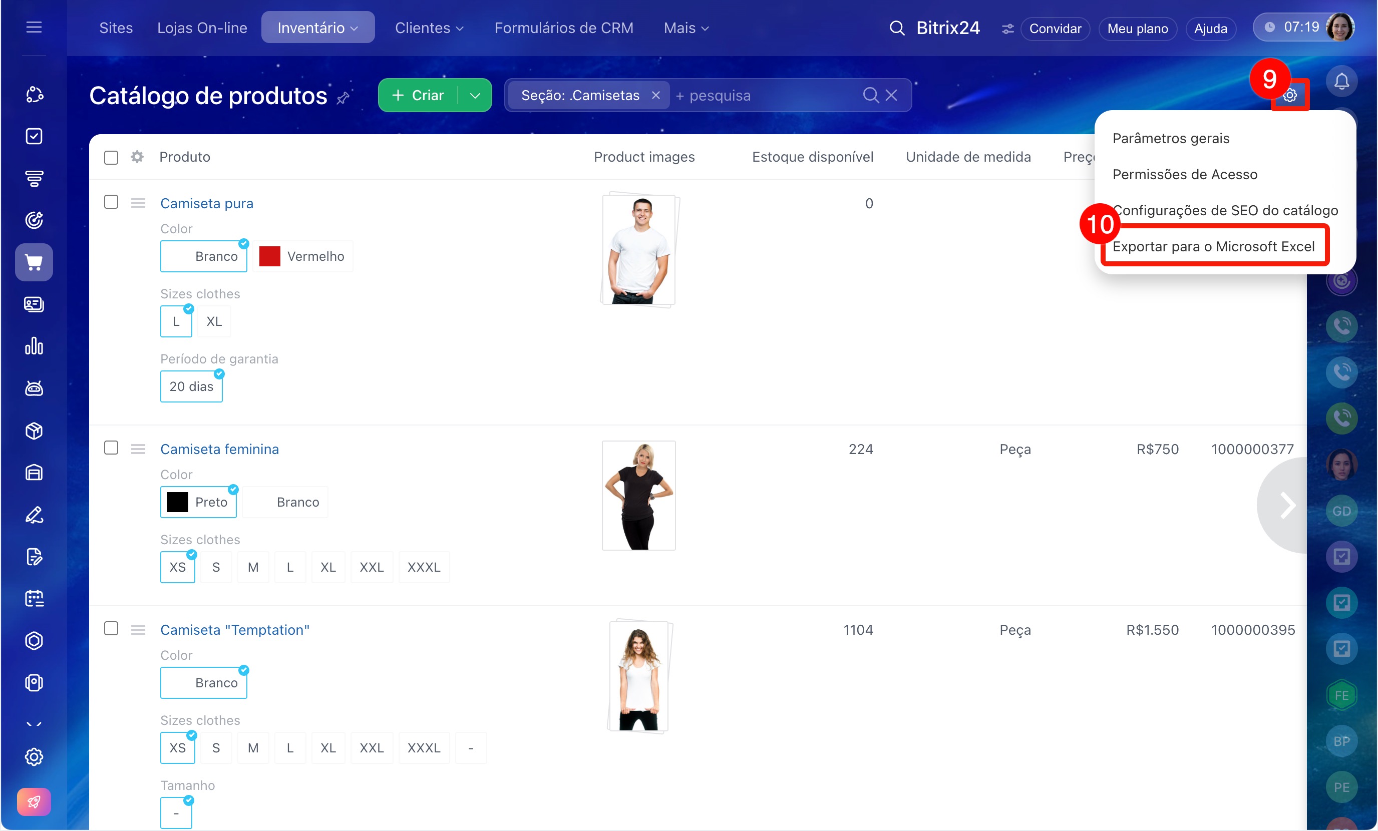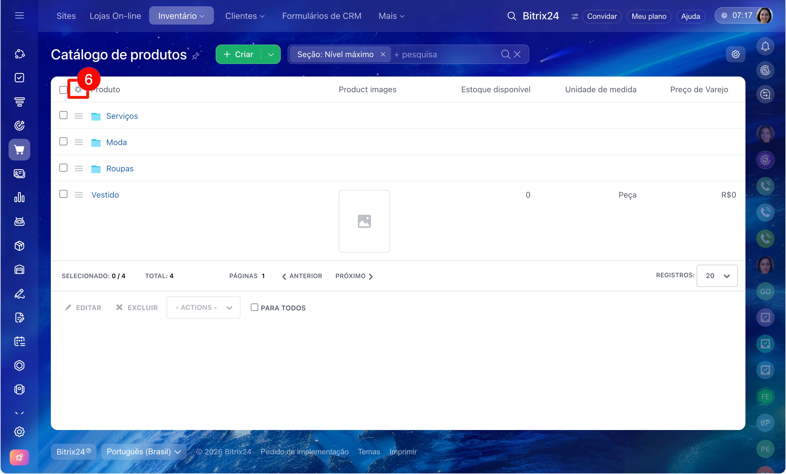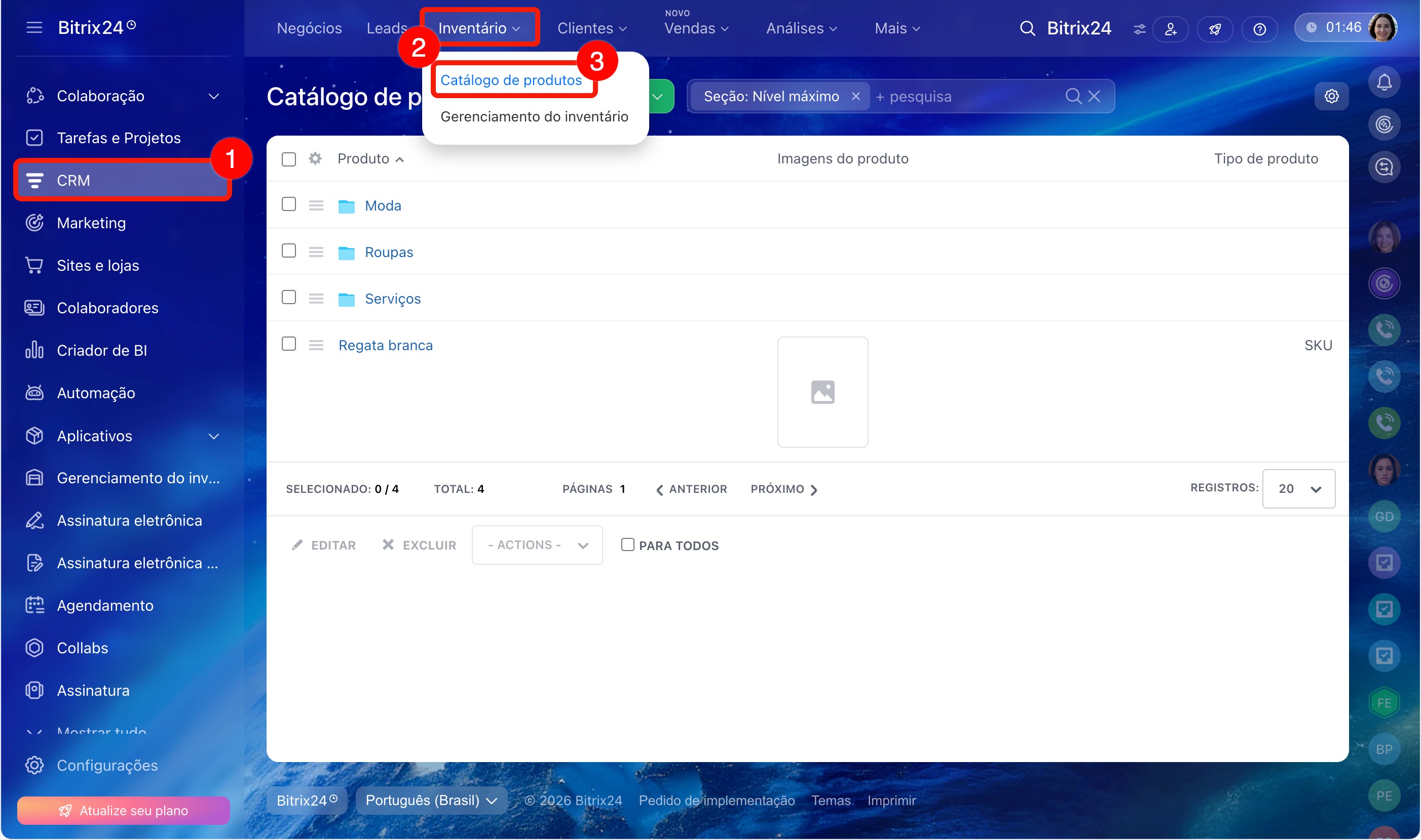 1-3. Acesse a seção CRM > Produtos e Estoques > Catálogo de produtos.