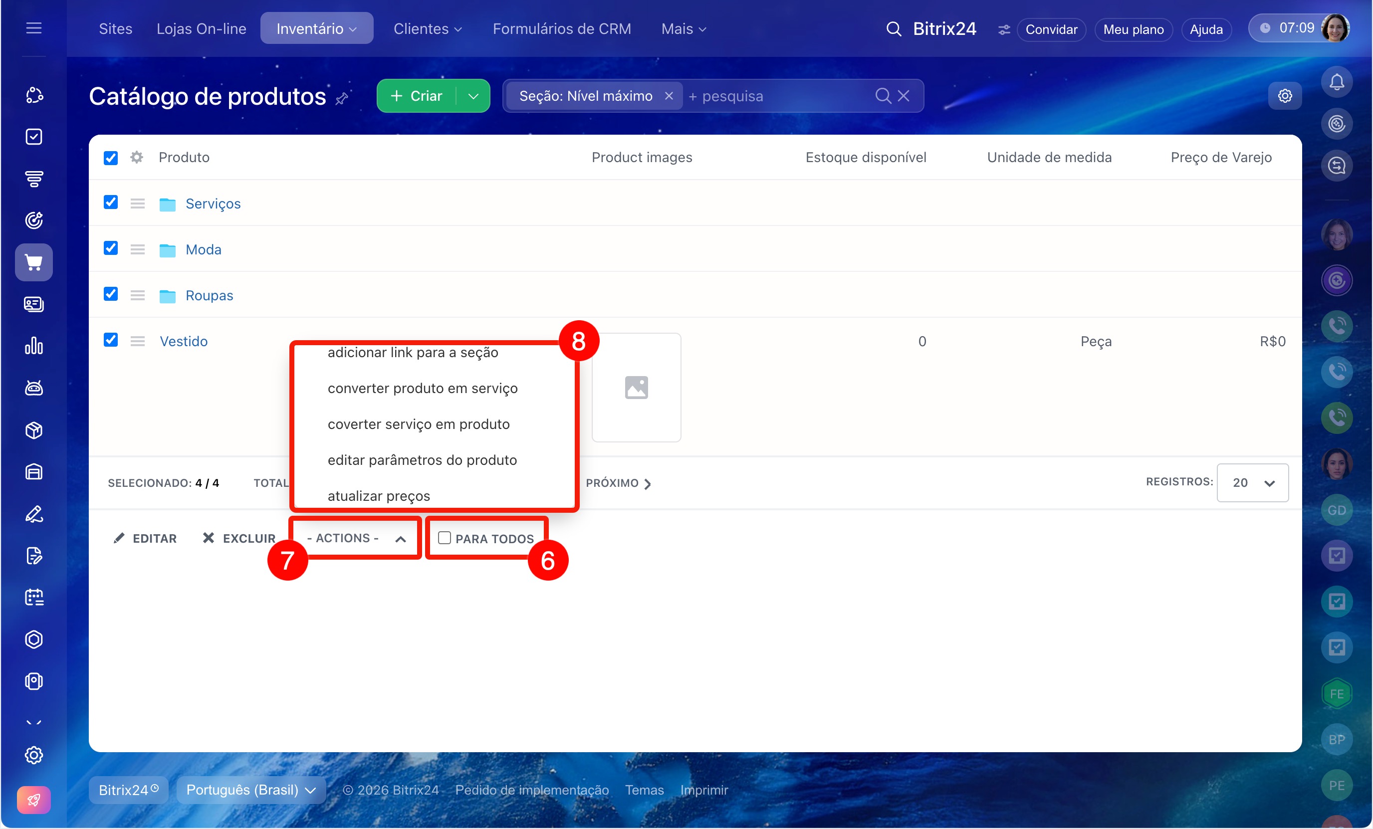 - Para edição em massa, abra o catálogo de produtos, selecione os itens desejados, clique em Ações, escolha a ação necessária, defina os parâmetros e salve as alterações.