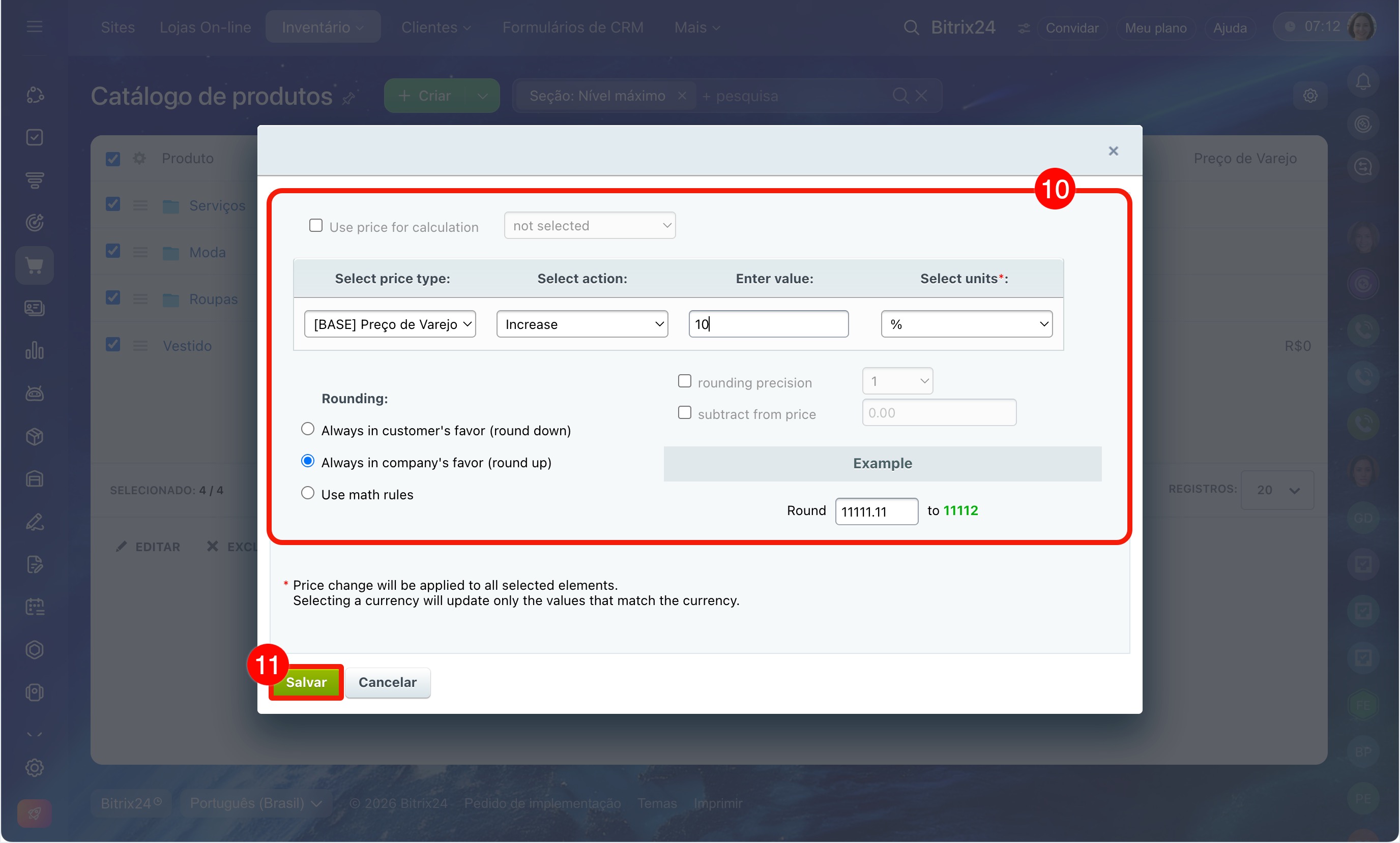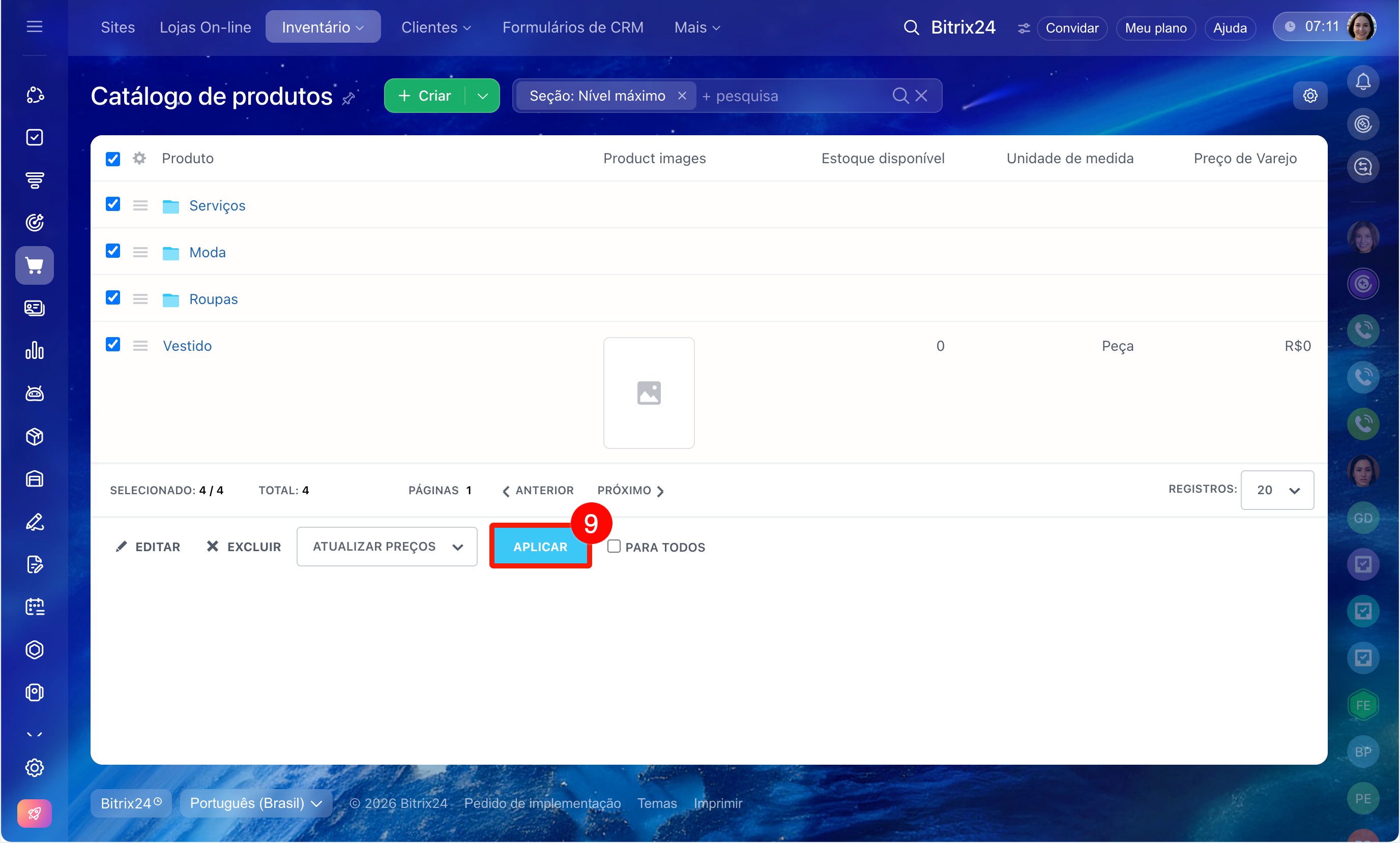 Apenas o administrador do Bitrix24 e o colaborador com permissões para visualizar e editar produtos podem alterar produtos. Para alterar preços, é necessária uma permissão específica.