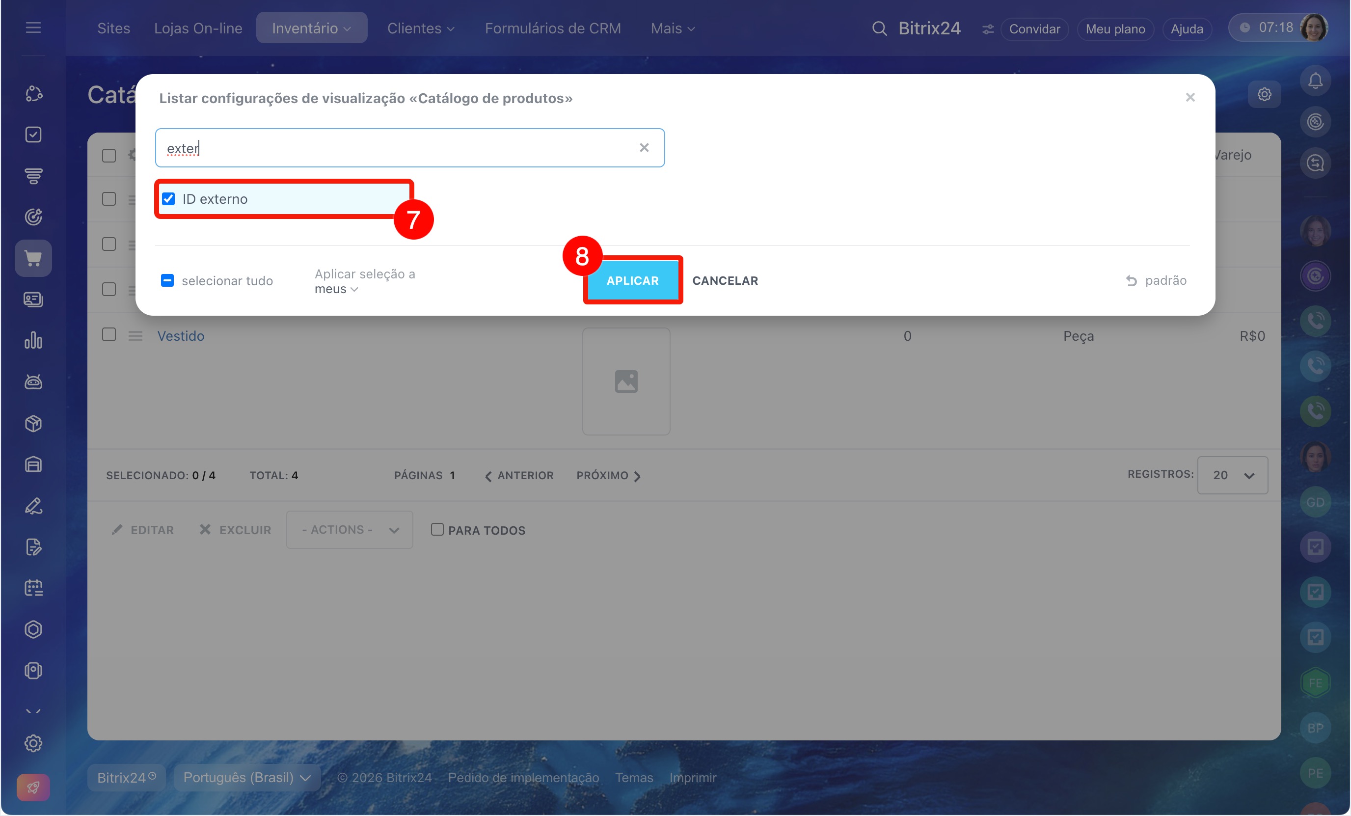 6-8. No canto superior esquerdo, clique em Configurações (⚙️) e certifique-se de exibir o campo Código externo (este é o identificador exclusivo do produto). Sem ele, o Bitrix24 não conseguirá atualizar os produtos existentes.
