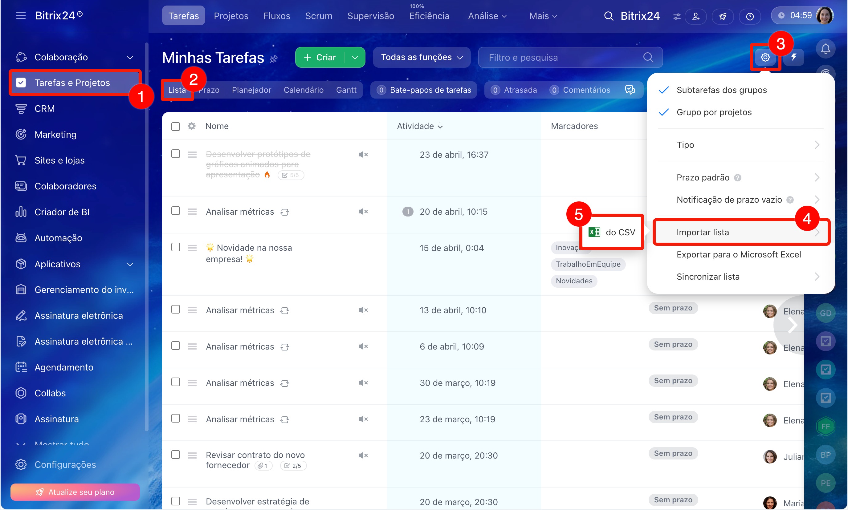 A importação é o processo de carregar tarefas no Bitrix24. Ela permite transferir rapidamente uma grande lista de tarefas sem precisar inserir os dados manualmente.
