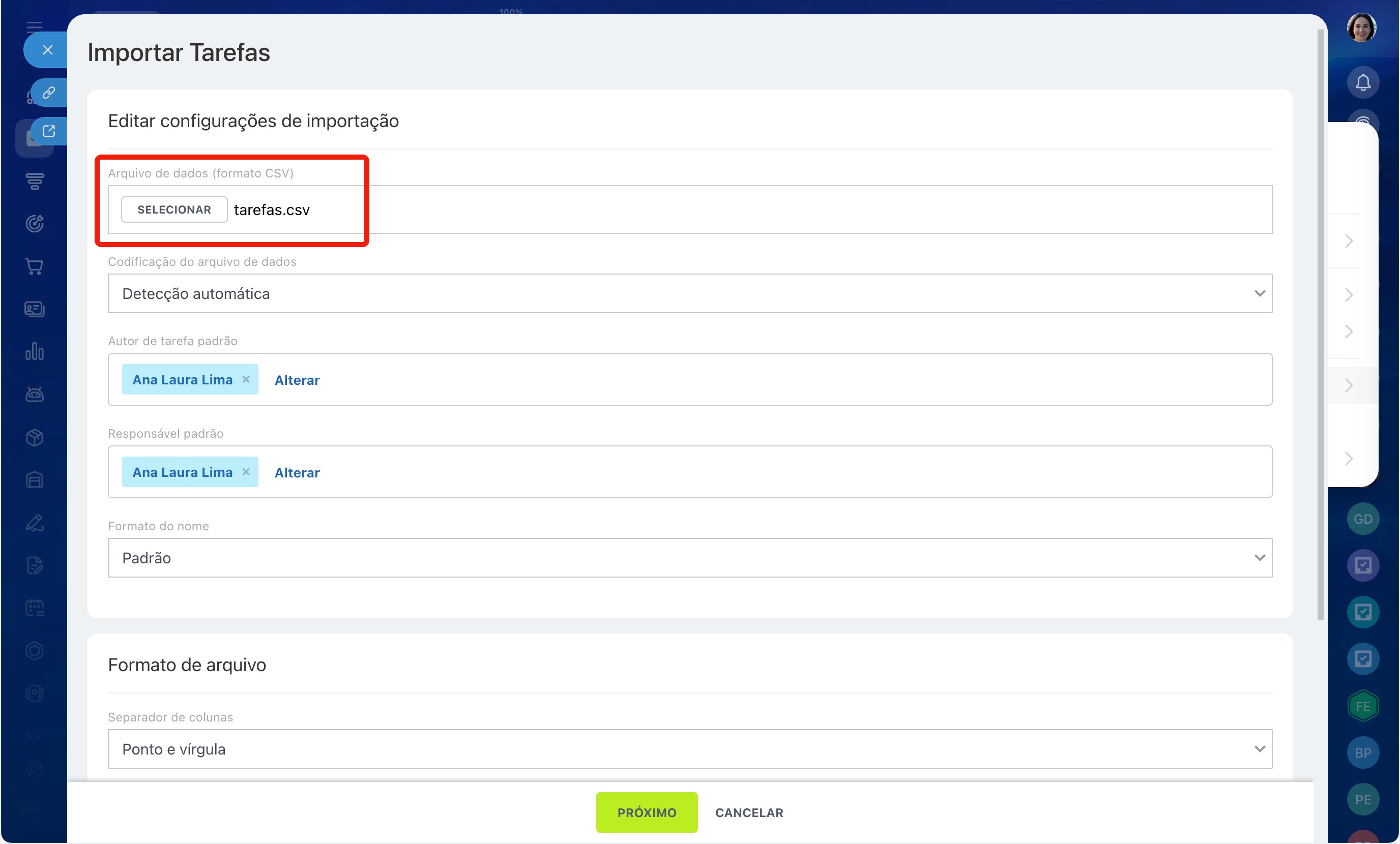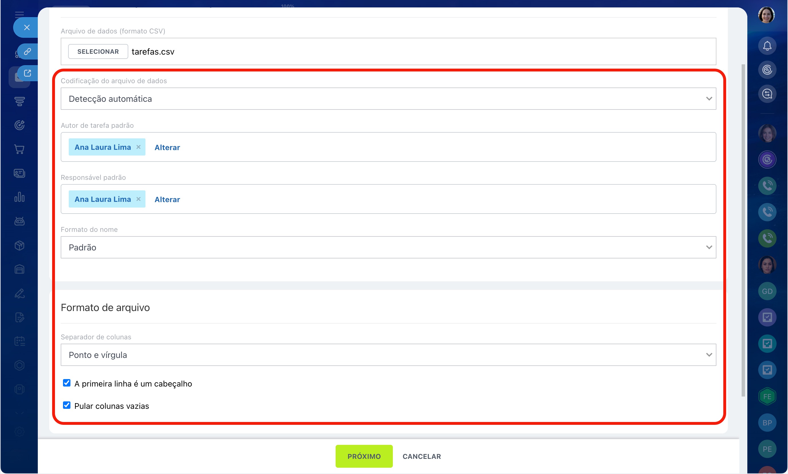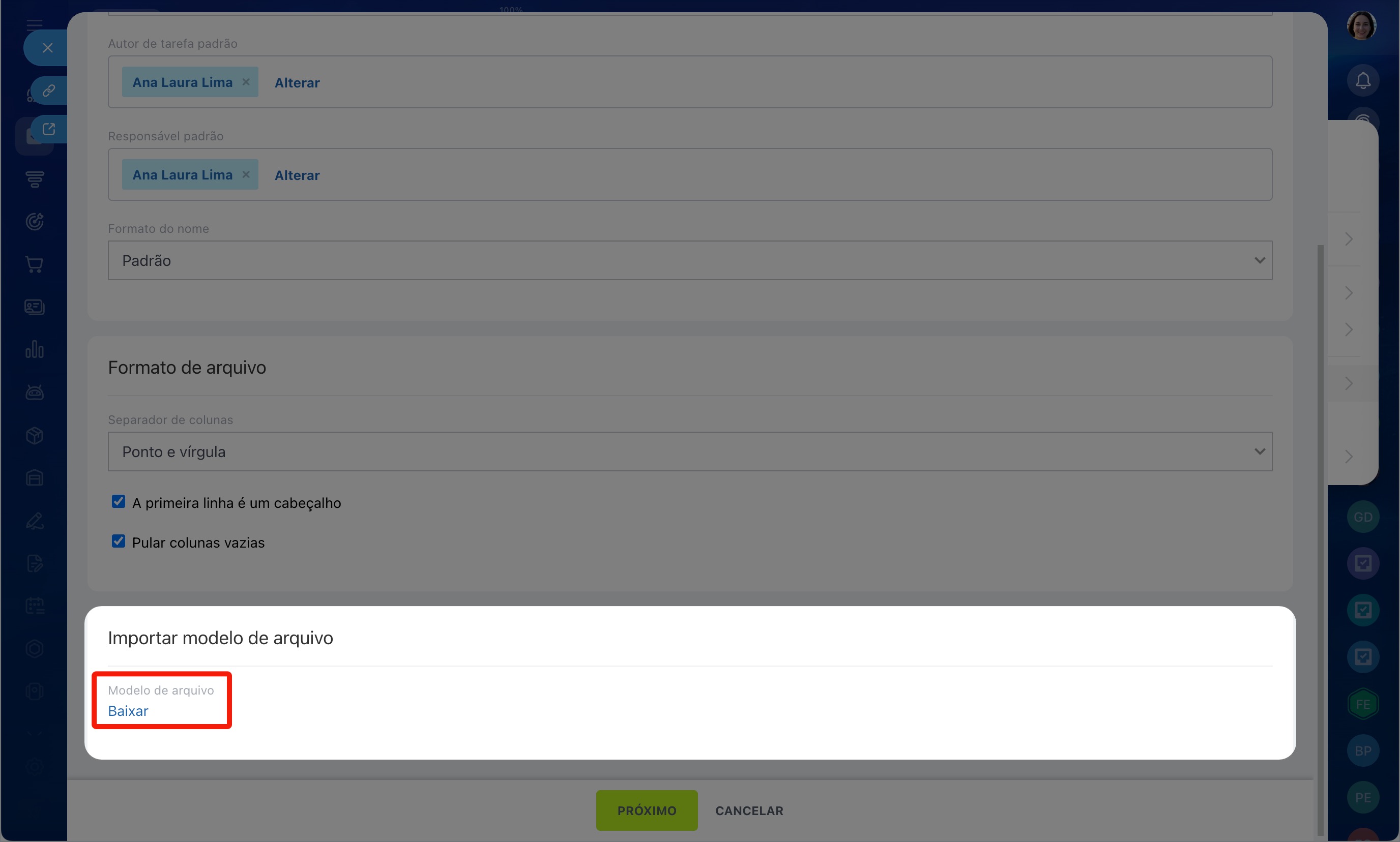 - Responsável padrão: indique o colaborador que se tornará o responsável se ele não estiver especificado no arquivo. Após a importação, você pode delegar as tarefas aos colegas.