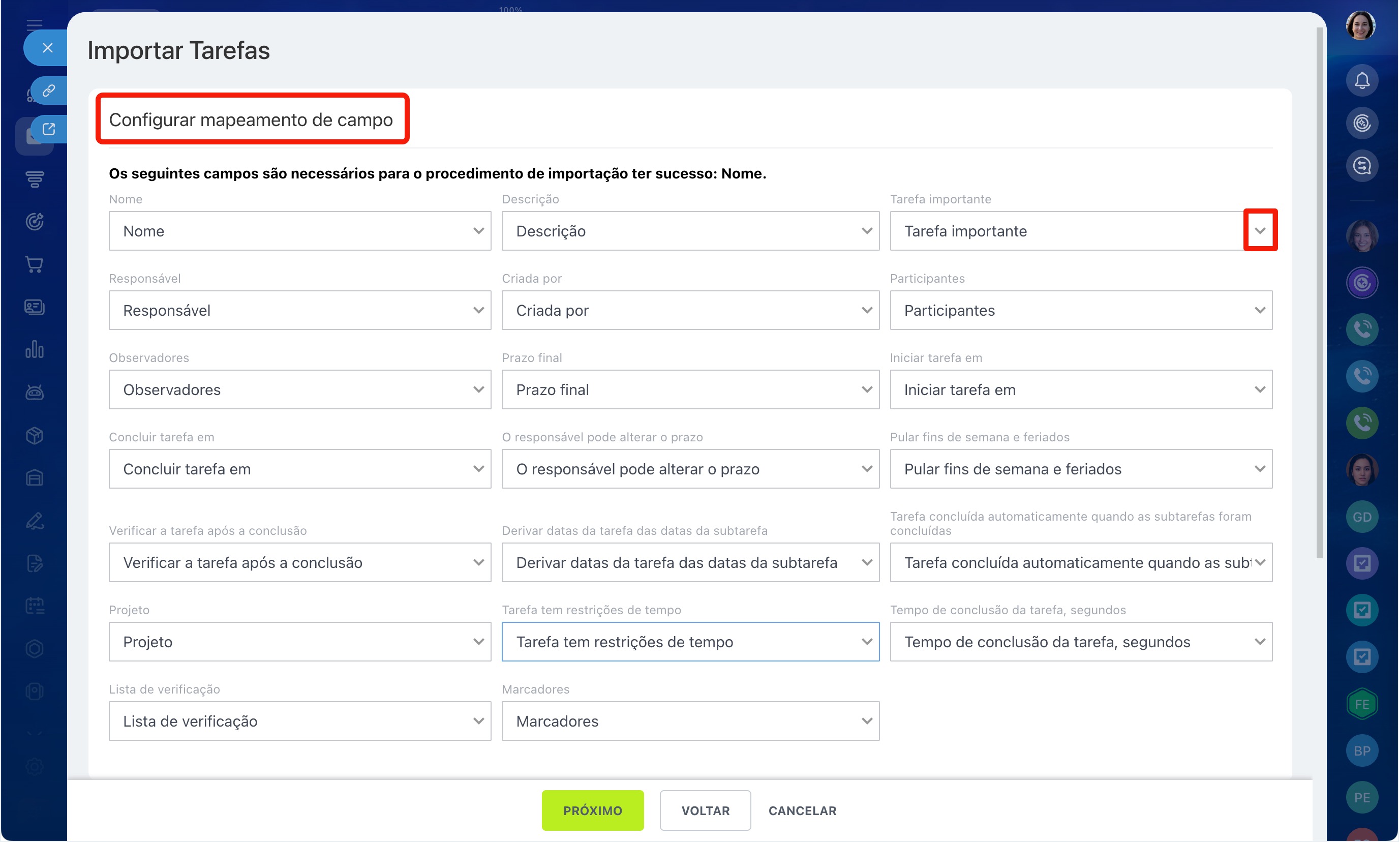 5. Verifique a correspondência dos campos. Os campos do arquivo de importação devem ser corretamente mapeados para os campos das tarefas no Bitrix24. Por exemplo, o valor da coluna Quem faz do arquivo deve ser carregado no campo Responsável no cartão da tarefa, e o valor da coluna Prazo final deve ser carregado no campo Prazo. Se você estiver usando o modelo do arquivo de importação, os campos são mapeados automaticamente.