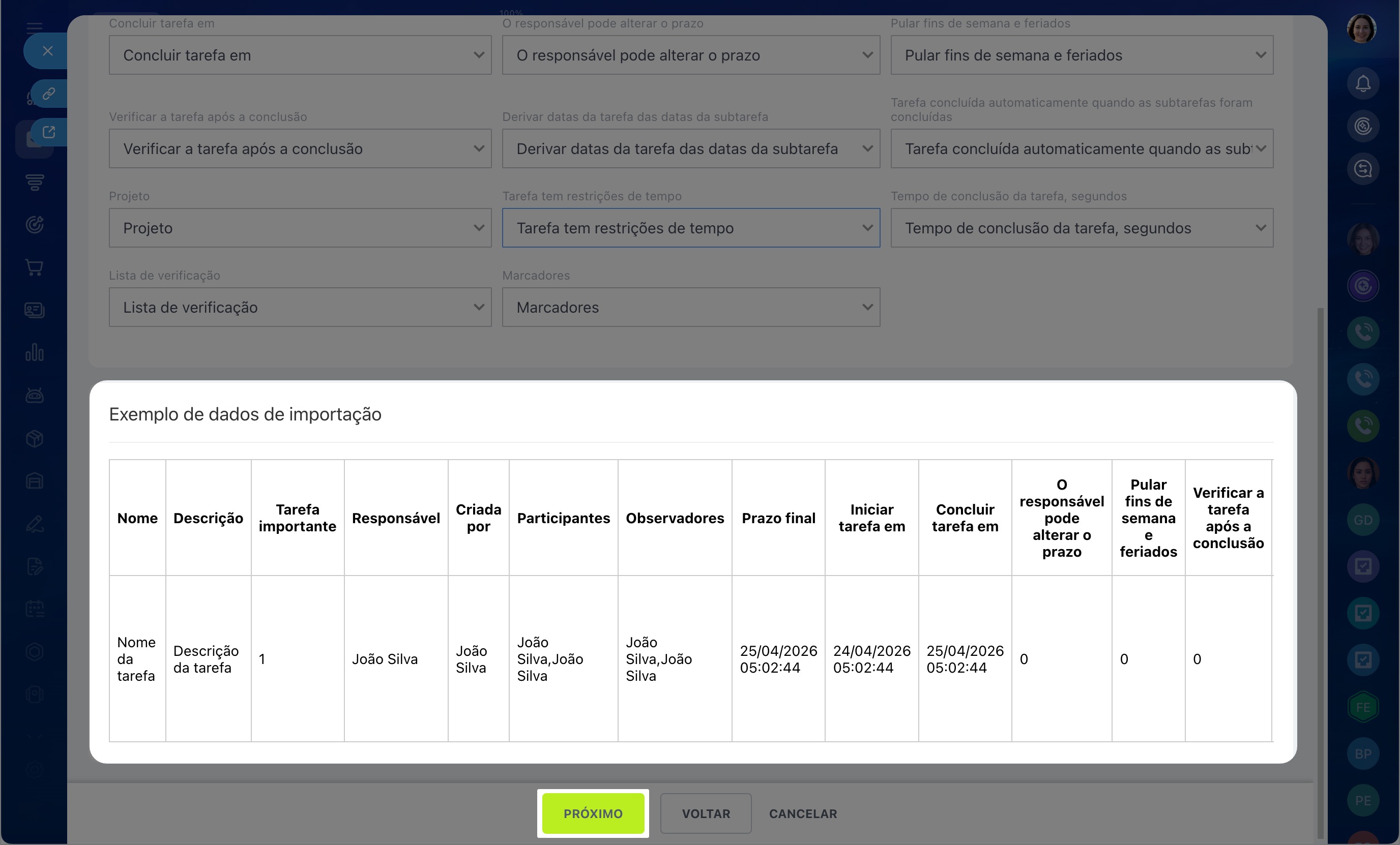 Na seção Exemplo dos dados a serem importados são exibidos os dados do seu arquivo. Isso ajuda a verificar se as colunas foram reconhecidas corretamente e se serão vinculadas adequadamente aos campos da tarefa antes da importação.