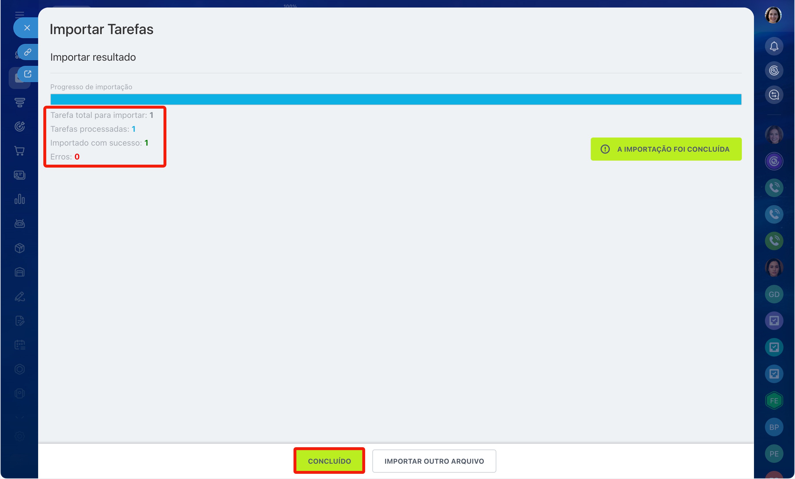 6. Quando o processo de importação for concluído, clique em Concluído.