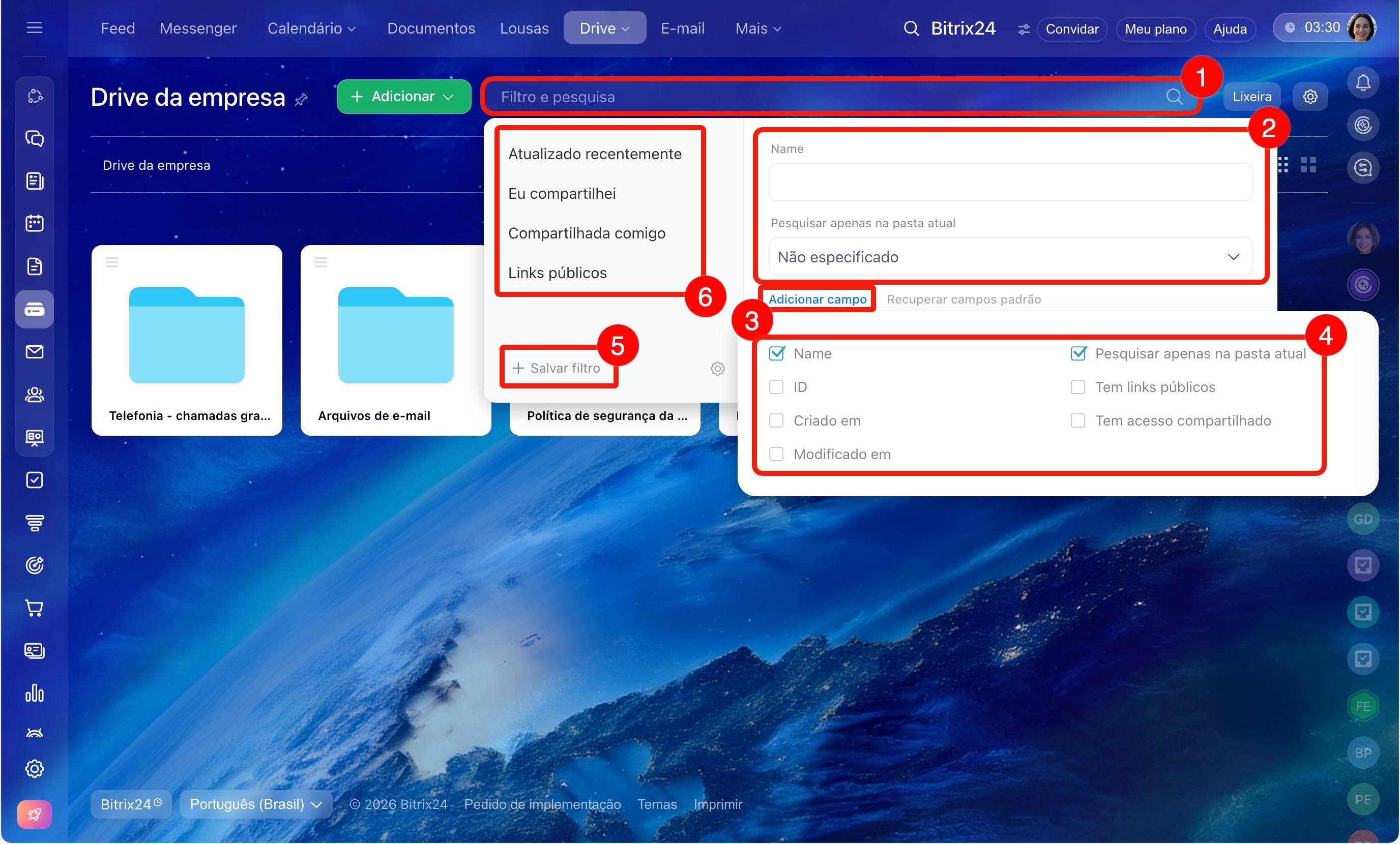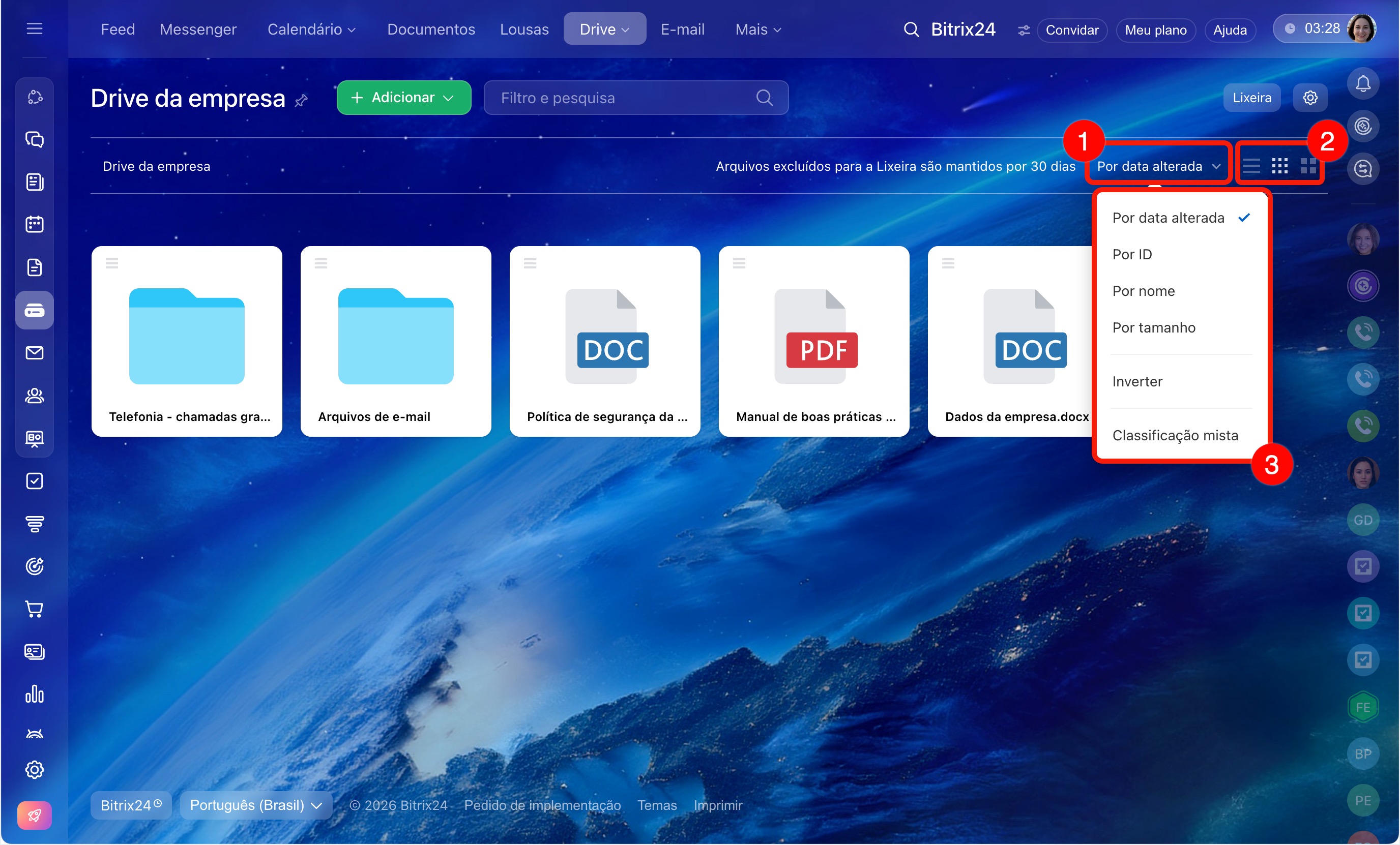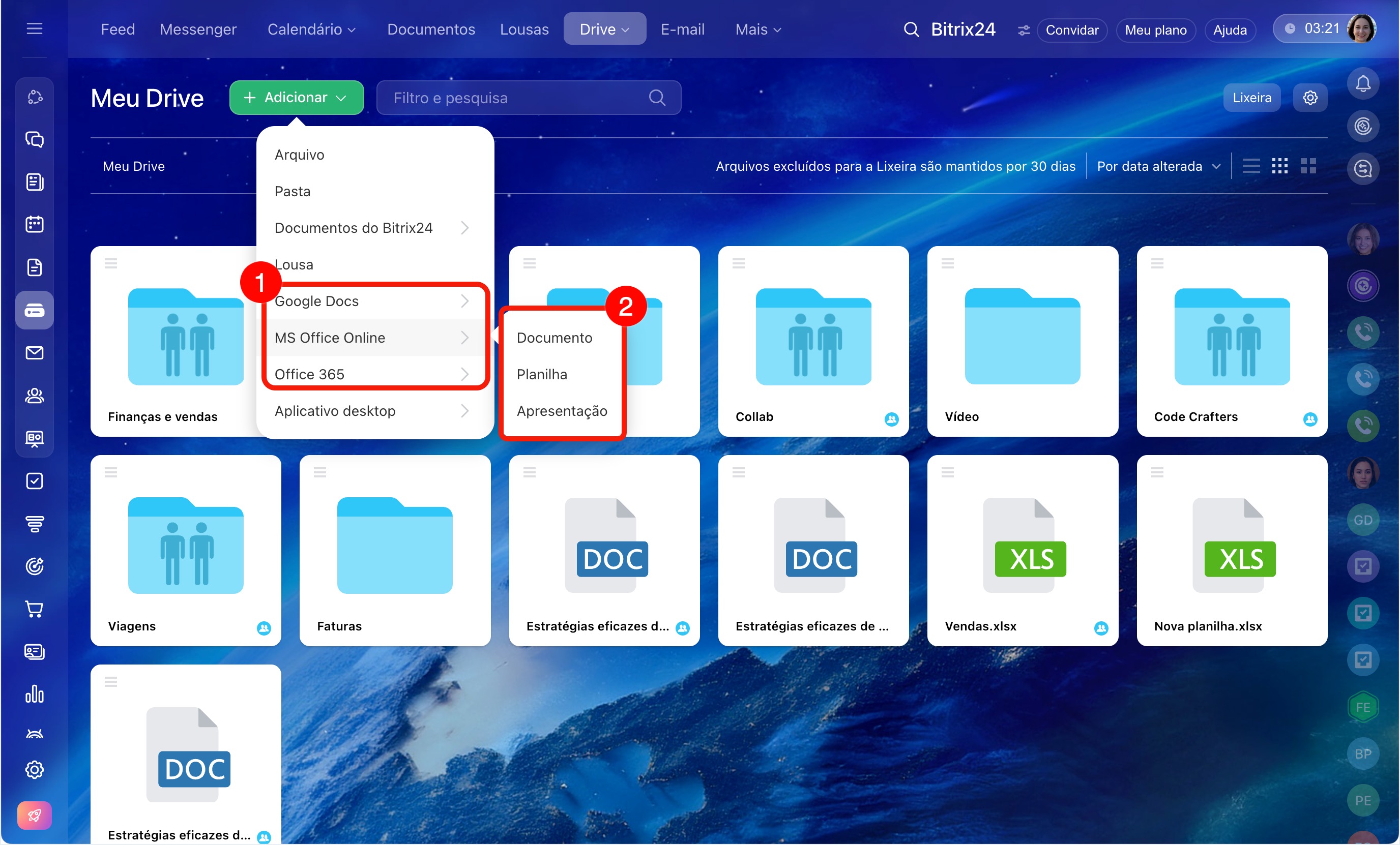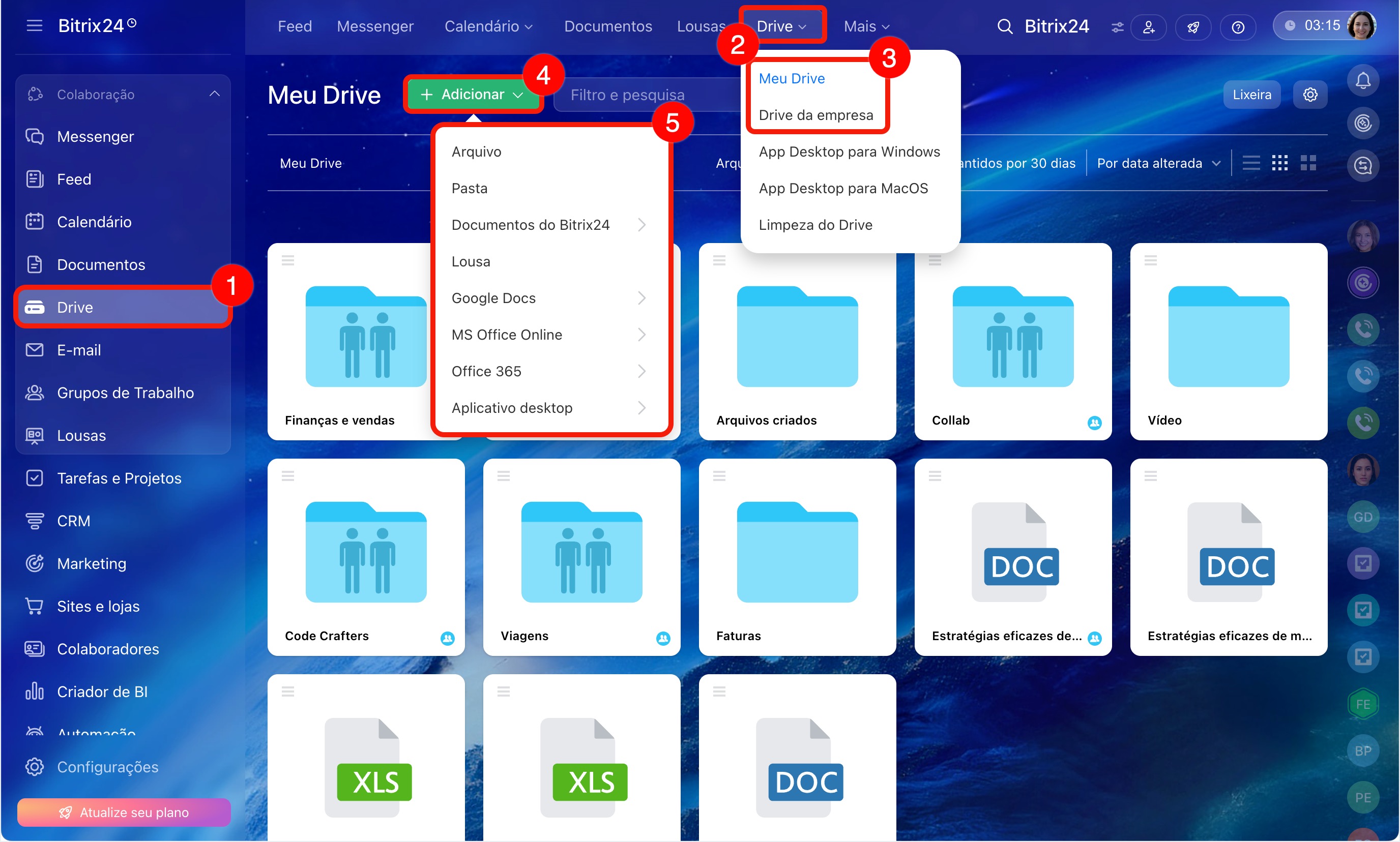 - O Bitrix24 Drive ajuda a armazenar arquivos e trabalhar neles sozinho ou com outros usuários do Bitrix24 no computador e no aplicativo móvel.