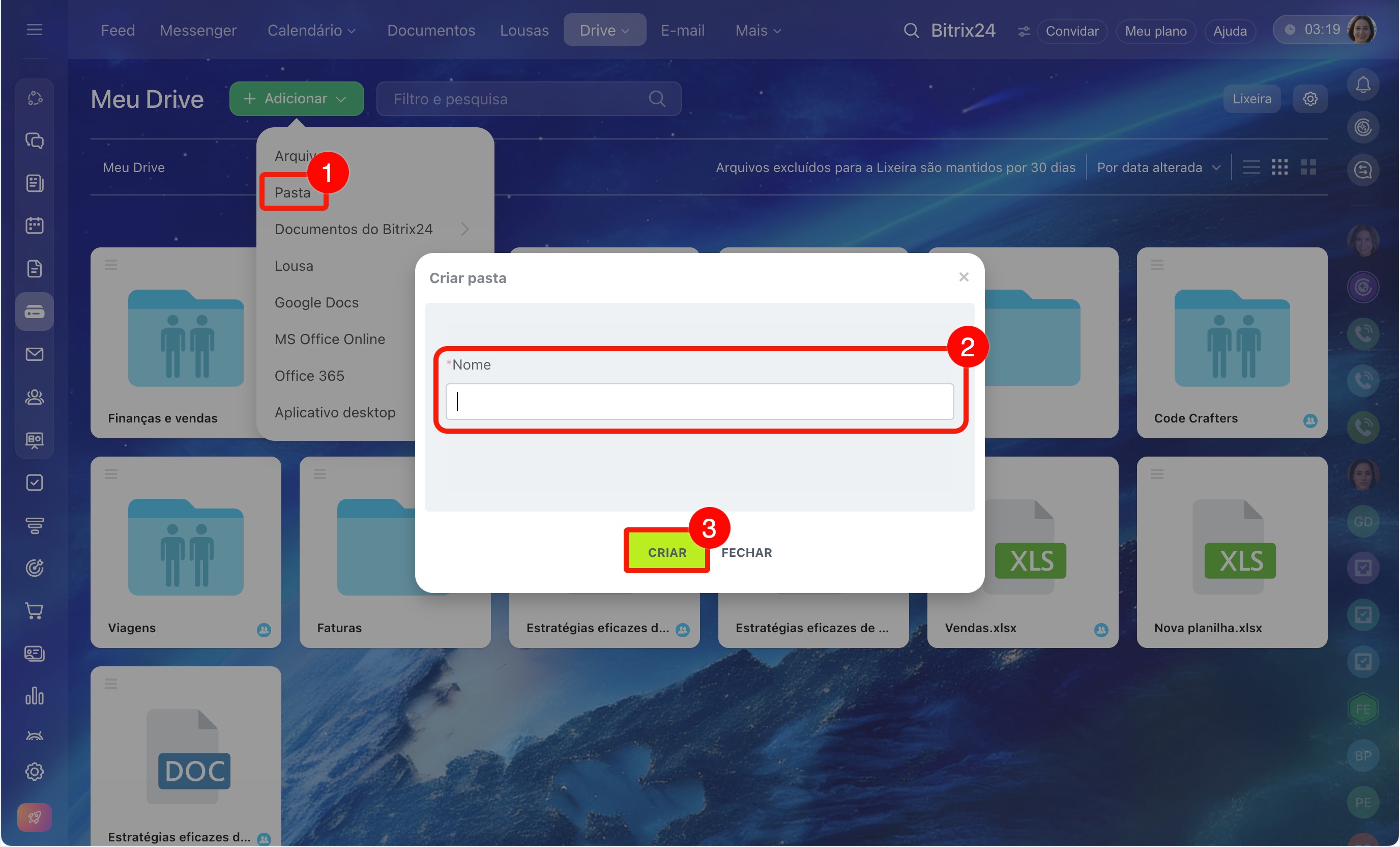 Pasta. Permite criar uma pasta no Drive para organizar os arquivos. Escolha um nome e clique em Criar.