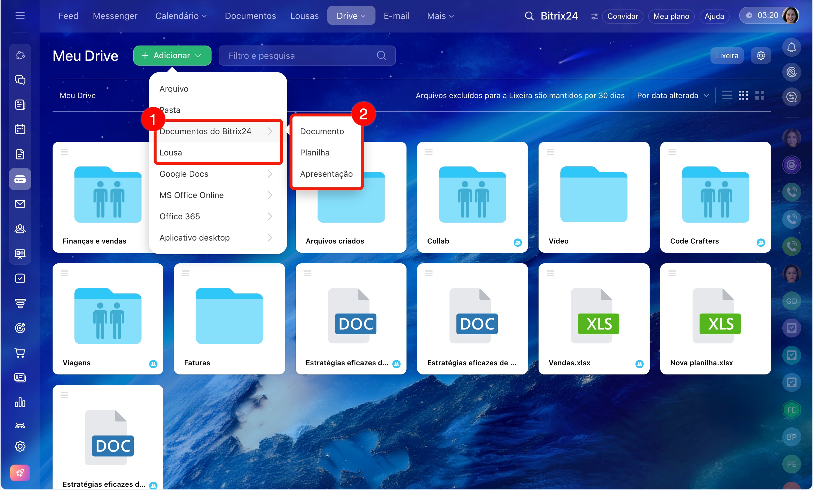 Bitrix24 Docs, Lousa. Permitem criar um documento de texto, planilha, apresentação ou quadro e continuar trabalhando neles imediatamente no editor integrado do Bitrix24.