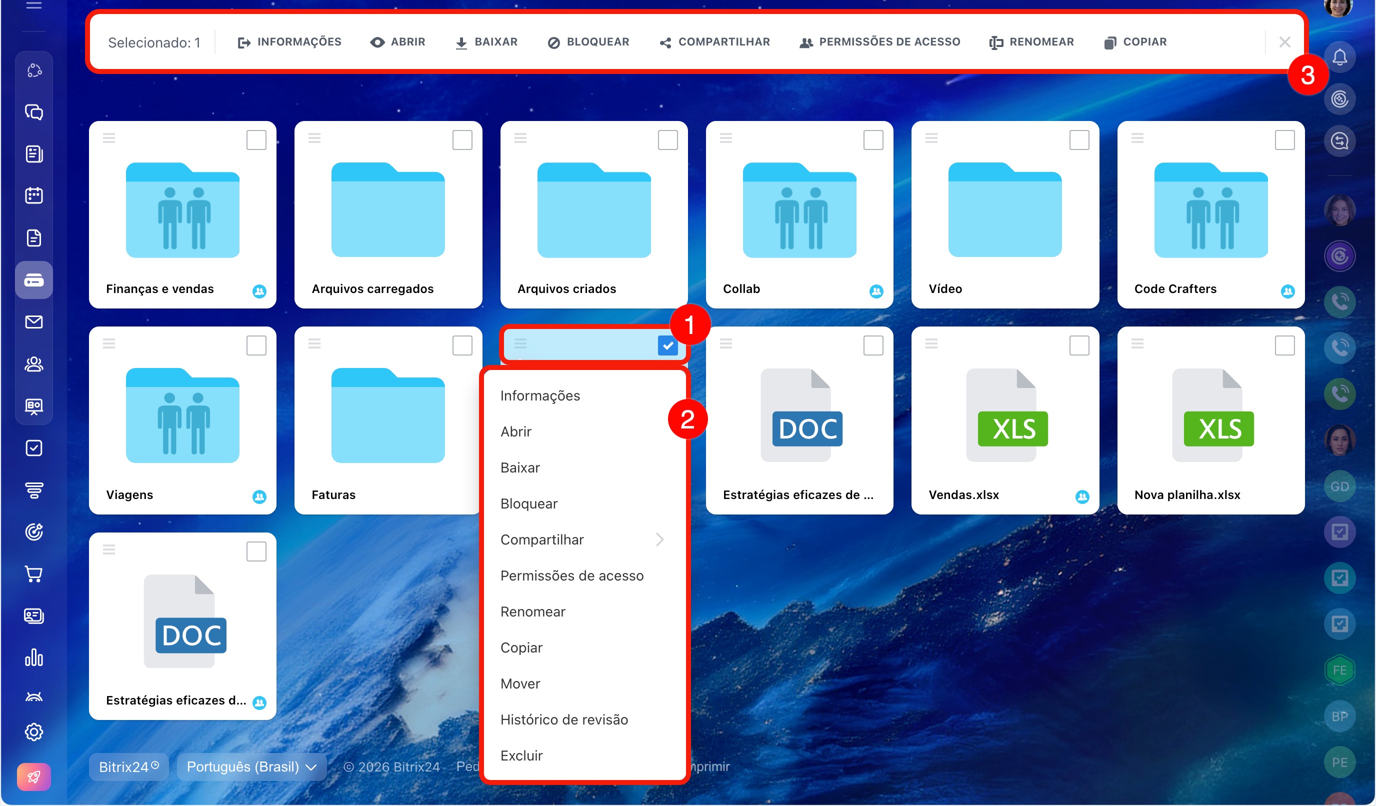 - Para gerenciar um arquivo ou pasta no Bitrix24 pelo computador, selecione-os e escolha as ações. No aplicativo móvel, toque e segure o arquivo desejado.
