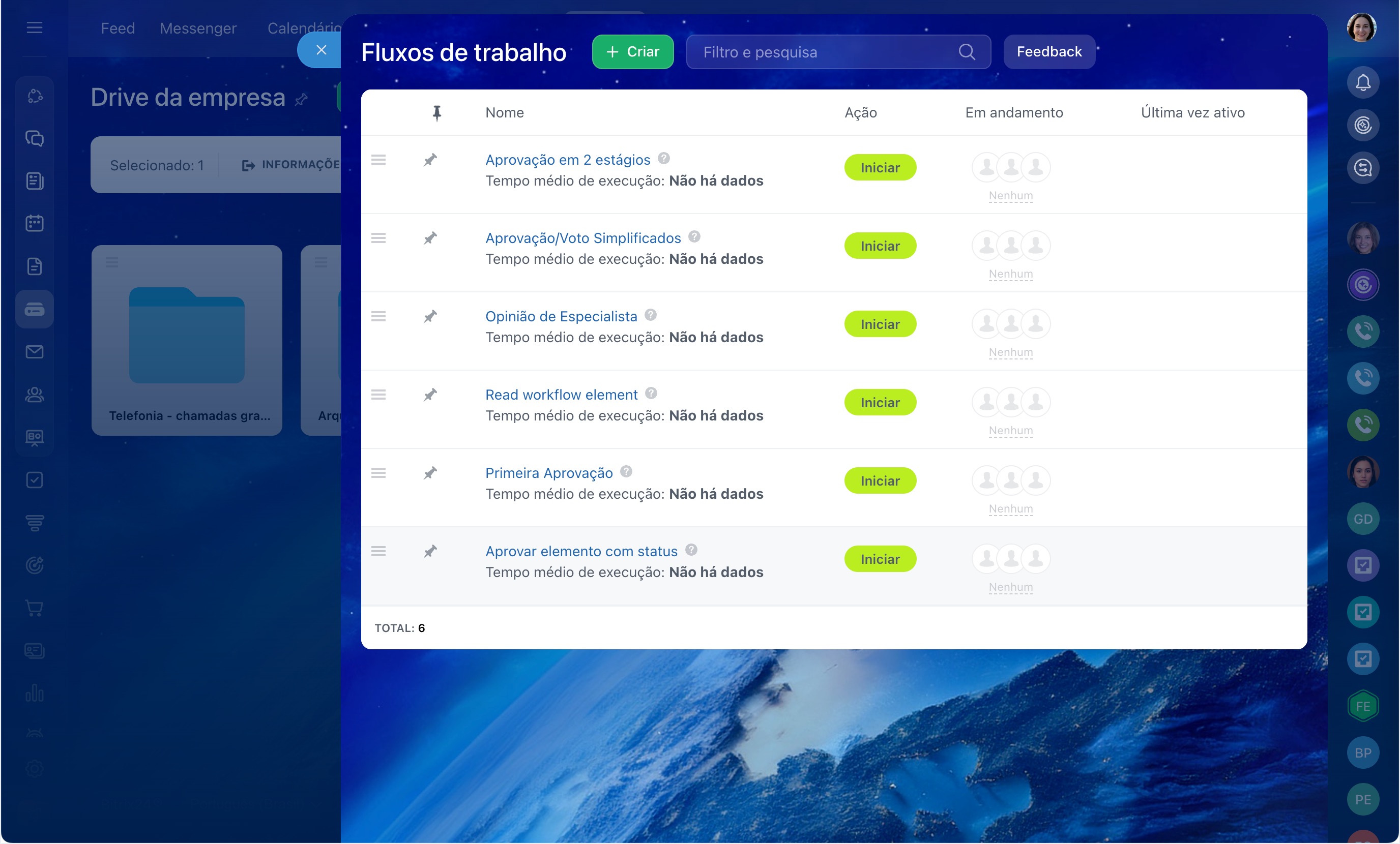 Fluxos de trabalho. Disponível apenas para arquivos no Drive Geral — permite automatizar o trabalho com arquivos, como a aprovação de documentos ou o processamento de solicitações.