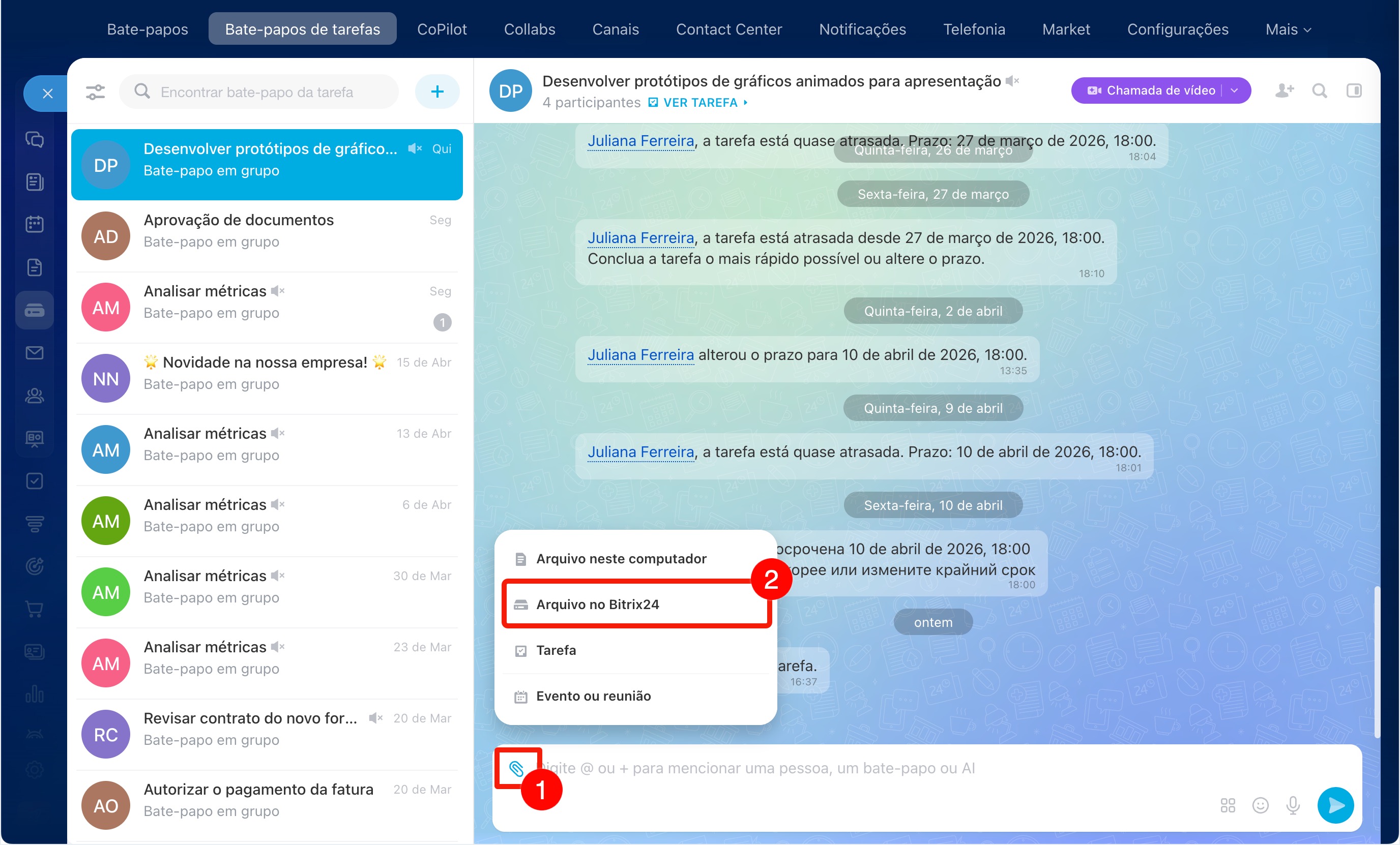 Anexar um arquivo a uma mensagem, tarefa, publicação no Feed de Atividades e assim por diante. Isso é útil quando você precisa enviar um arquivo para colegas darem continuidade ao trabalho — por exemplo, discutir um documento em um chat ou anexá-lo a uma tarefa.