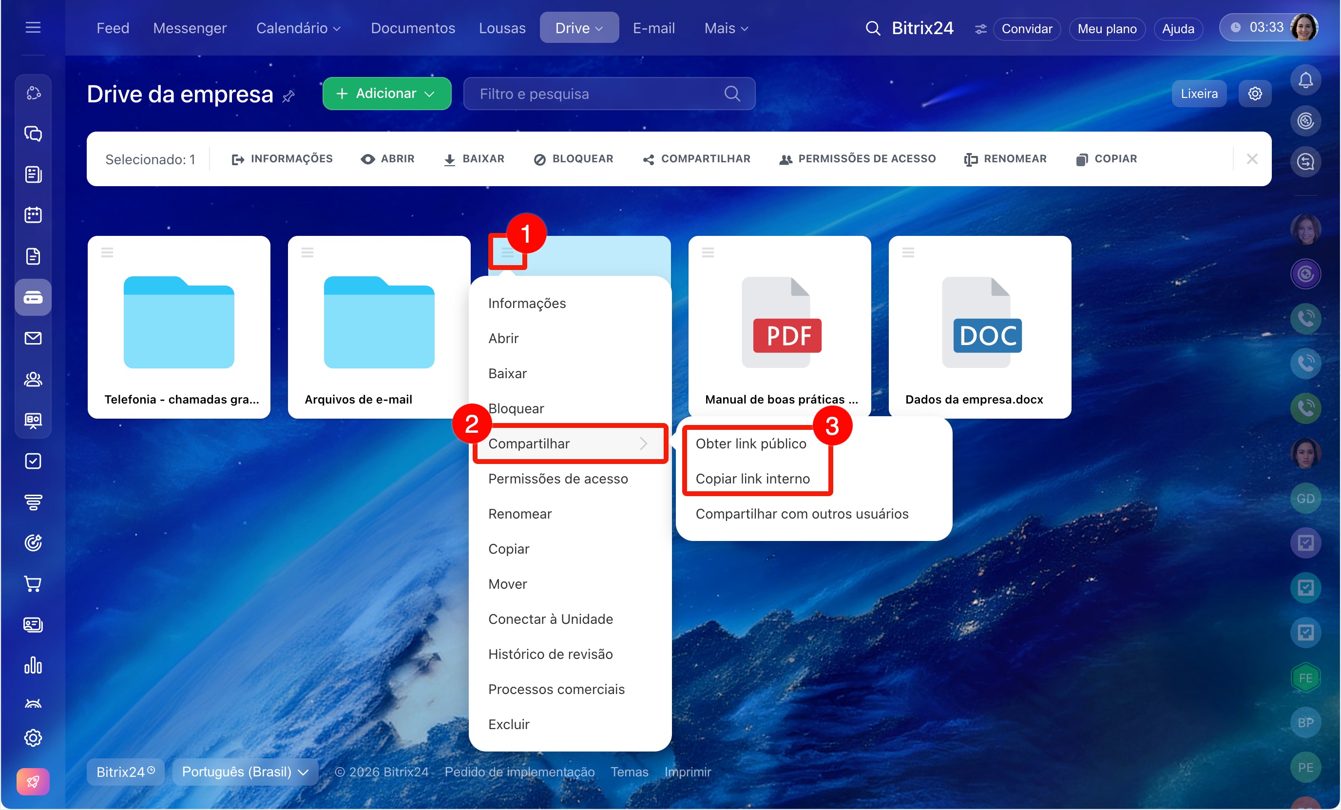 Enviar um link de uma pasta ou arquivo para um chat do Bitrix24, mensageiro externo, SMS ou e-mail. Use links internos para colegas e links públicos para quem não trabalha na sua empresa.