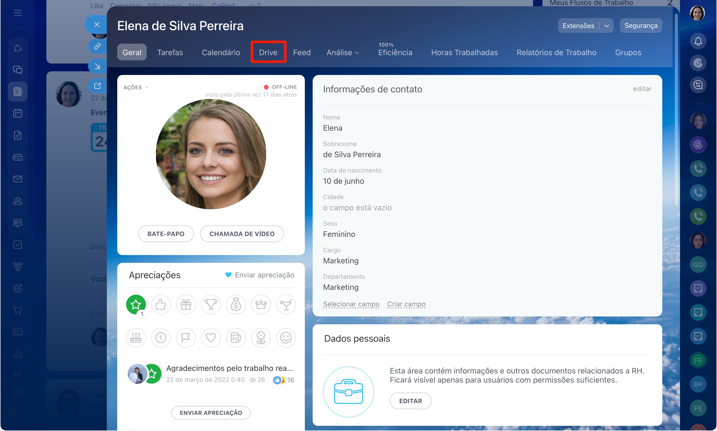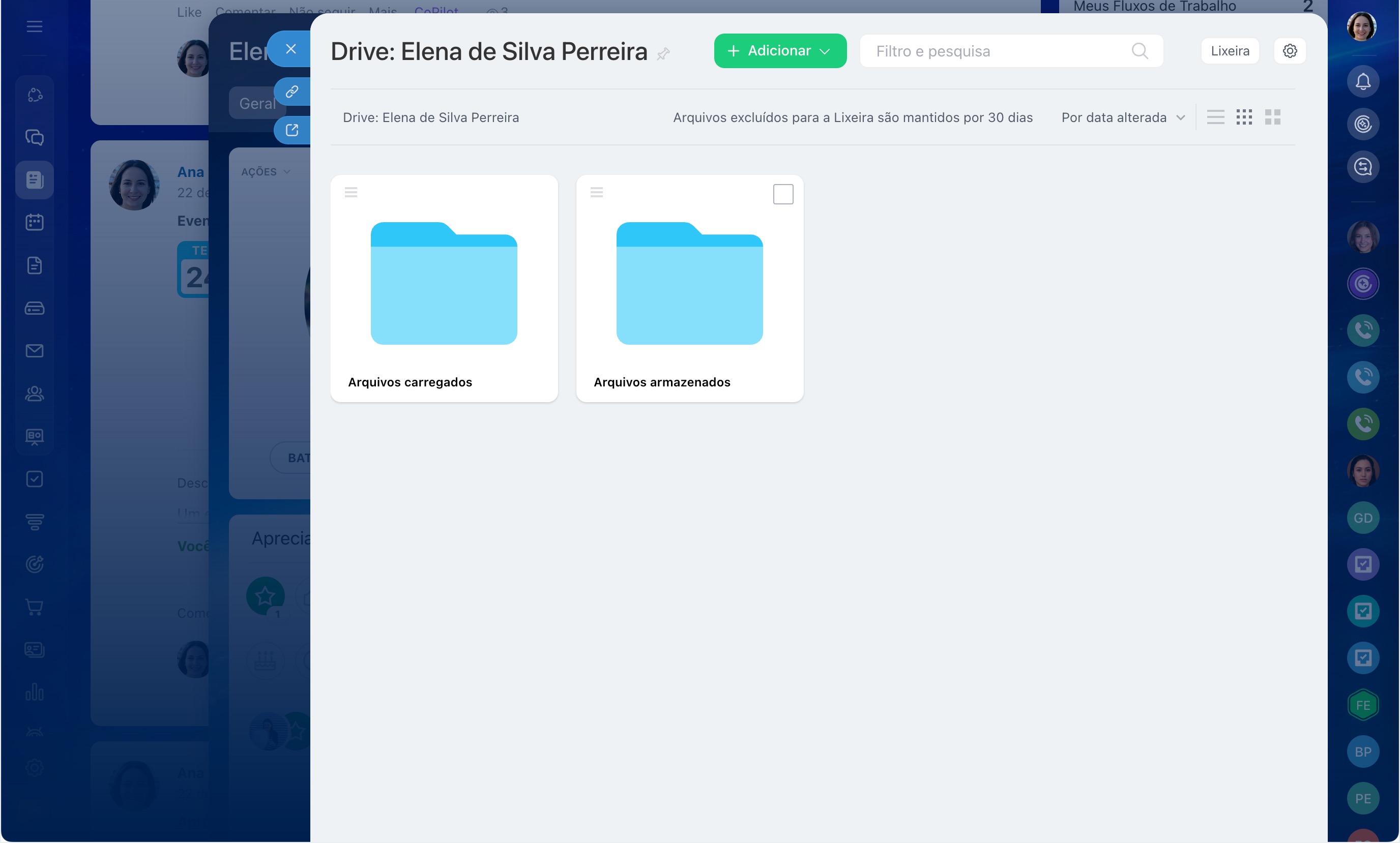 Após a configuração, o colaborador não receberá uma notificação. Para encontrar os arquivos disponíveis, é necessário acessar o perfil do colaborador e abrir a guia Drive — nela serão exibidos os elementos aos quais ele tem acesso.