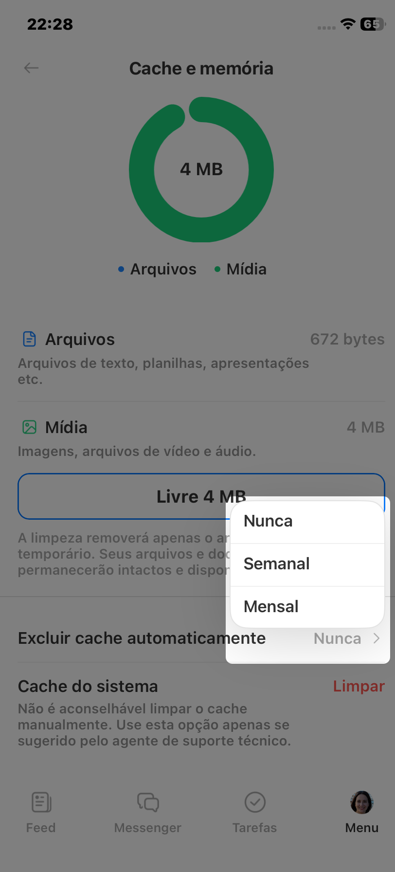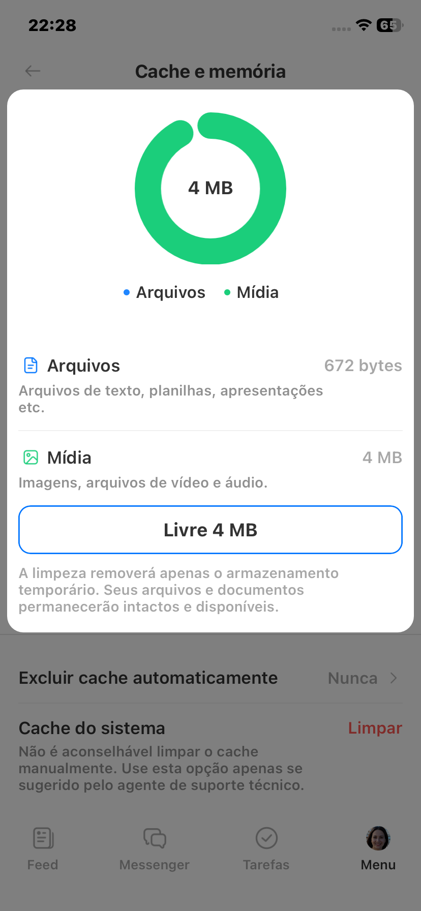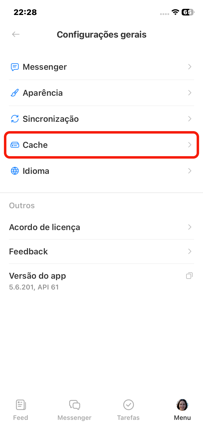 Cache é um conjunto de dados salvos no seu dispositivo que ajudam o aplicativo móvel do Bitrix24 a funcionar mais rápido. Por exemplo, fotos, vídeos, planilhas e outros arquivos que você abriu no aplicativo. Com o tempo, o cache se acumula e pode ocupar muito espaço no dispositivo.