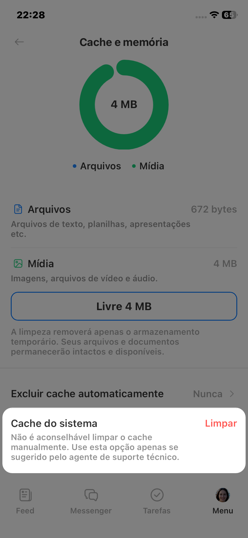 Limpar o cache do sistema. São dados técnicos que ajudam o aplicativo a funcionar corretamente. Limpe o cache do sistema somente sob orientação do suporte técnico, se for necessário resolver um problema específico no aplicativo. Para isso, toque em Limpar; a ação será executada imediatamente e uma confirmação aparecerá na tela.