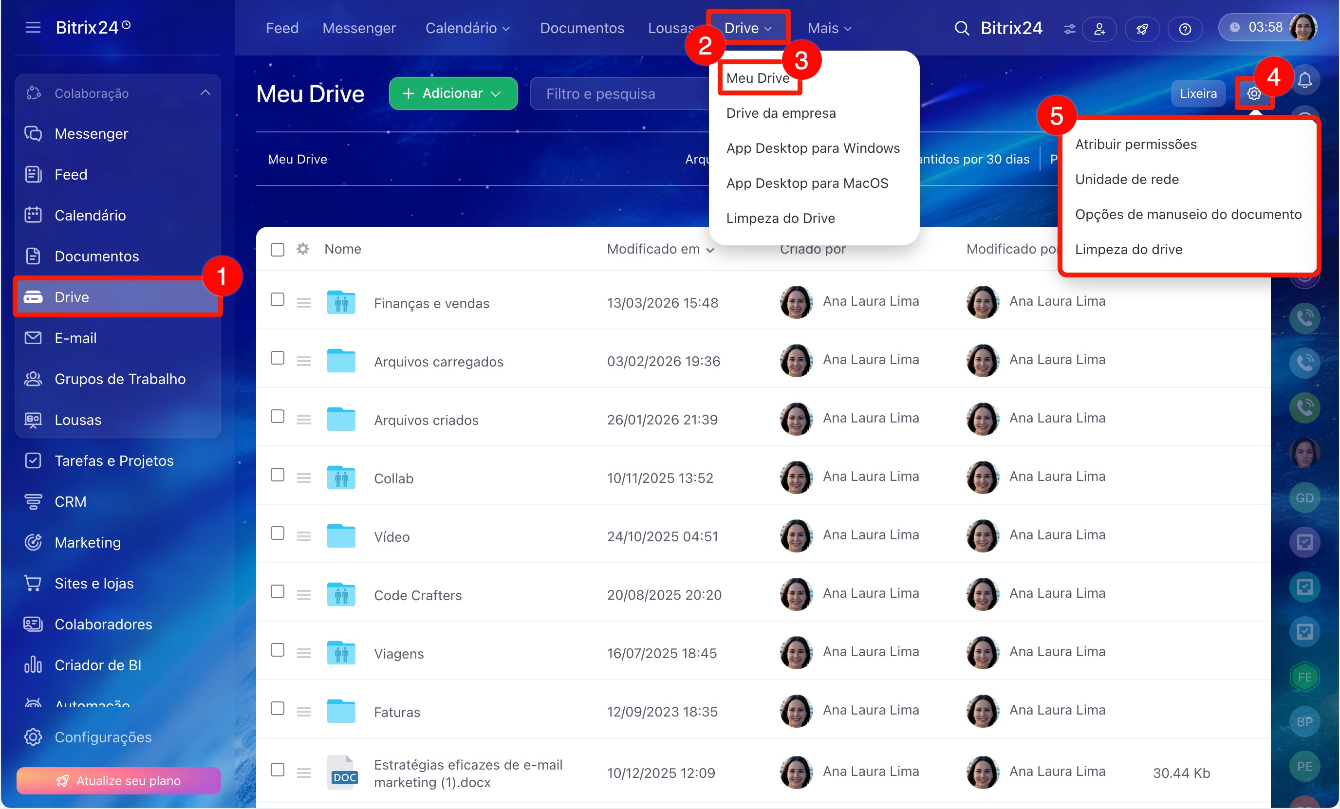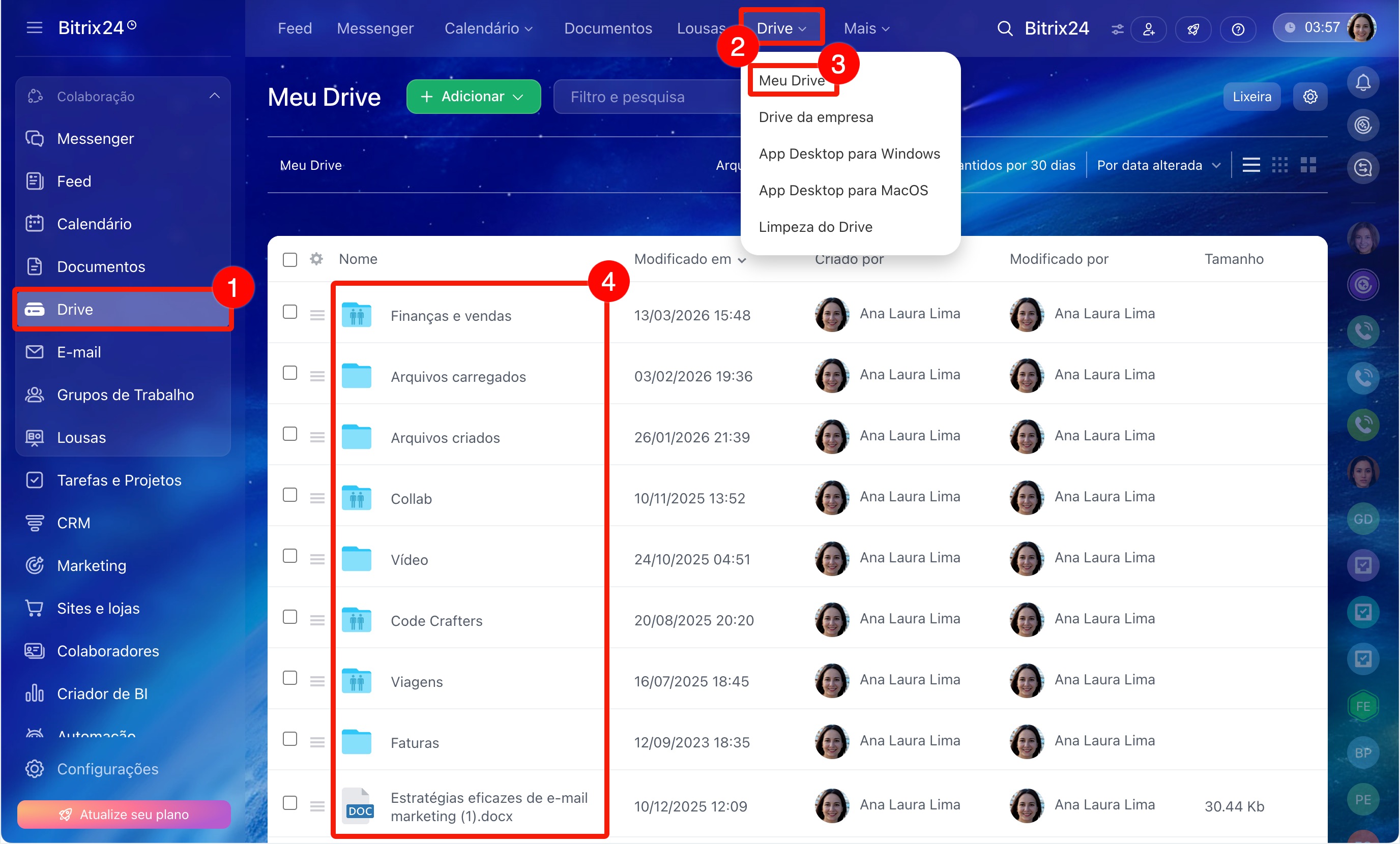 - O Meu Drive no Bitrix24 é o repositório em nuvem pessoal do colaborador. Ele está acessível no computador e no aplicativo móvel do Bitrix24.