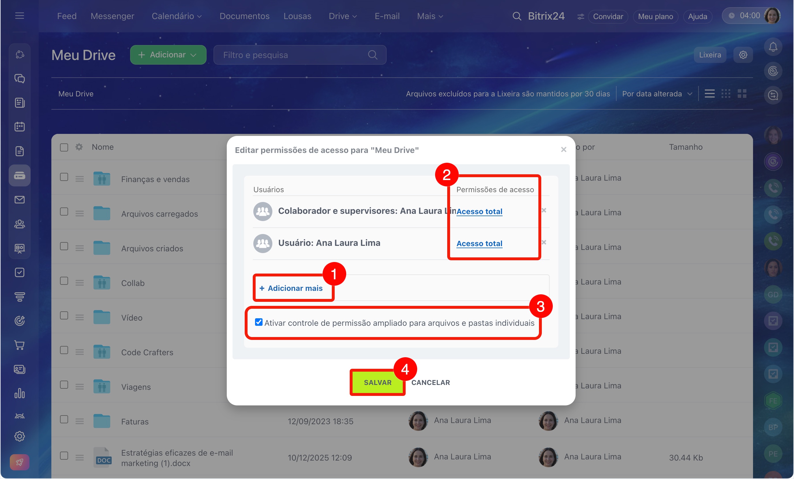 - Nas pastas do sistema do Drive, alguns arquivos de outras ferramentas do Bitrix24 são salvos automaticamente.