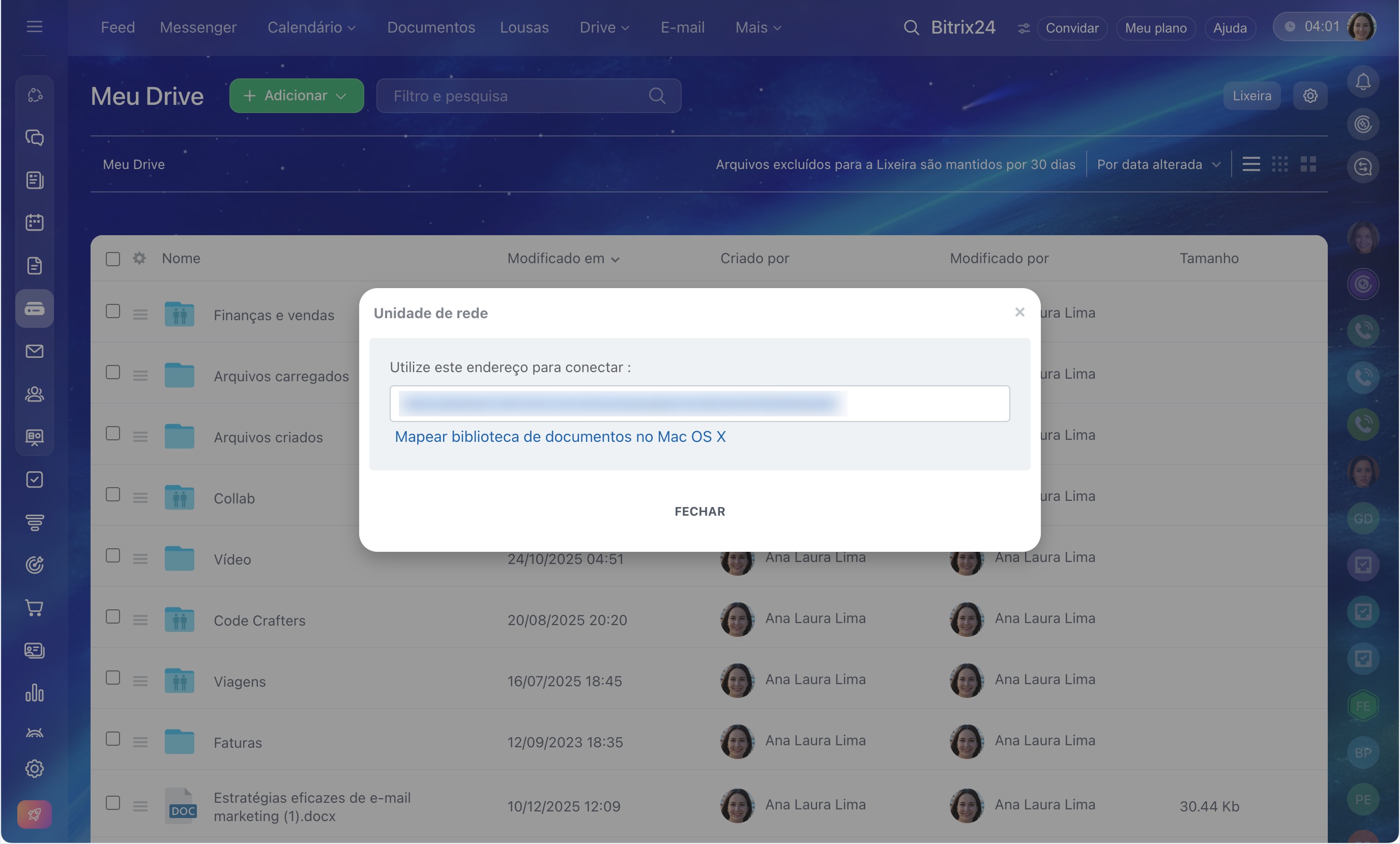 Unidade de rede. Copie o endereço para conectar o Meu Drive ao seu computador. Ele estará disponível como uma pasta comum no seu gerenciador de arquivos. Após a configuração, todas as alterações são sincronizadas em mão dupla: depois de salvar uma edição no computador, ela aparece no Bitrix24 e vice-versa.