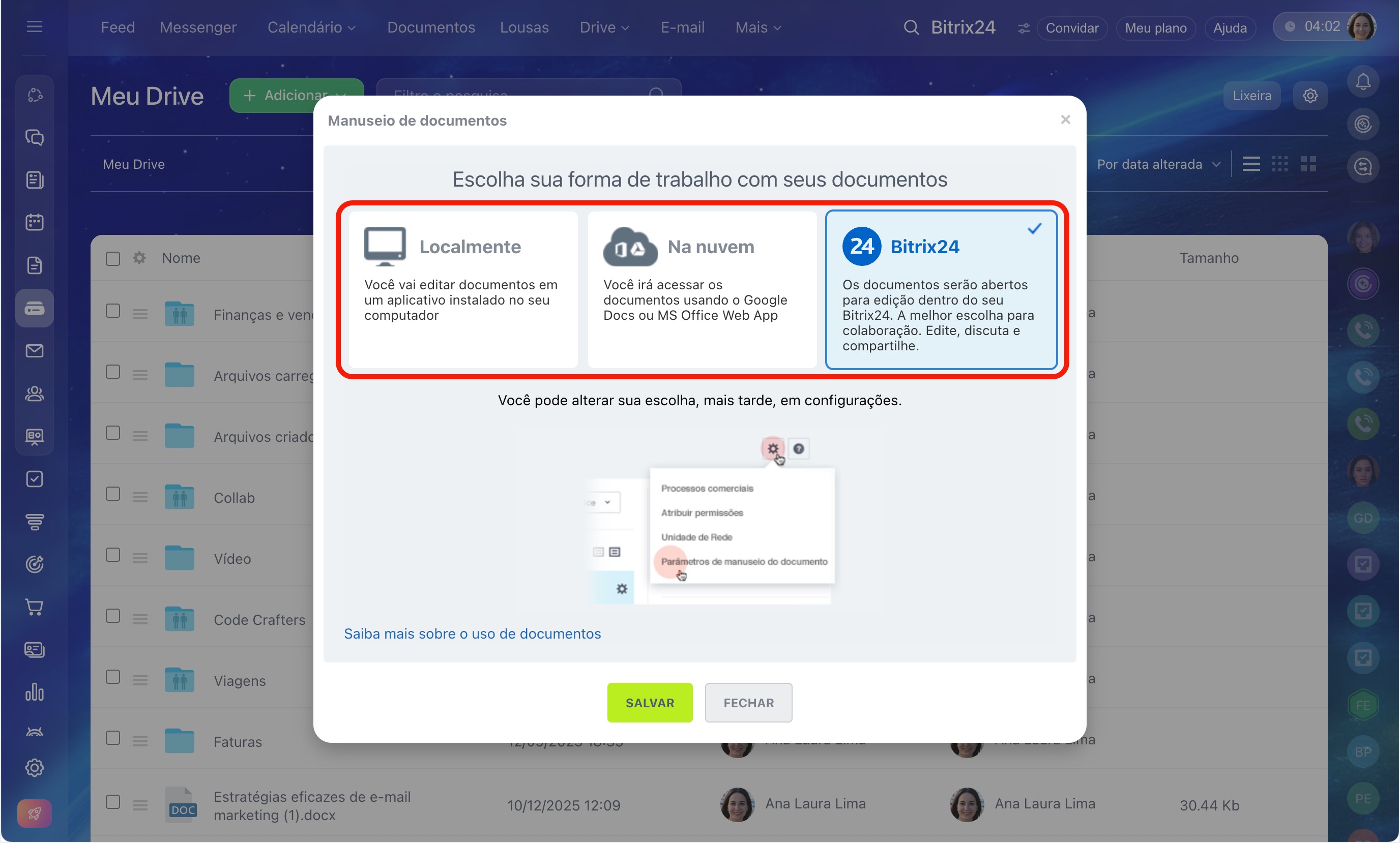 Configuração do trabalho com documentos. Escolha o método mais conveniente: local, na nuvem ou através do editor integrado do Bitrix24. Salve as alterações.