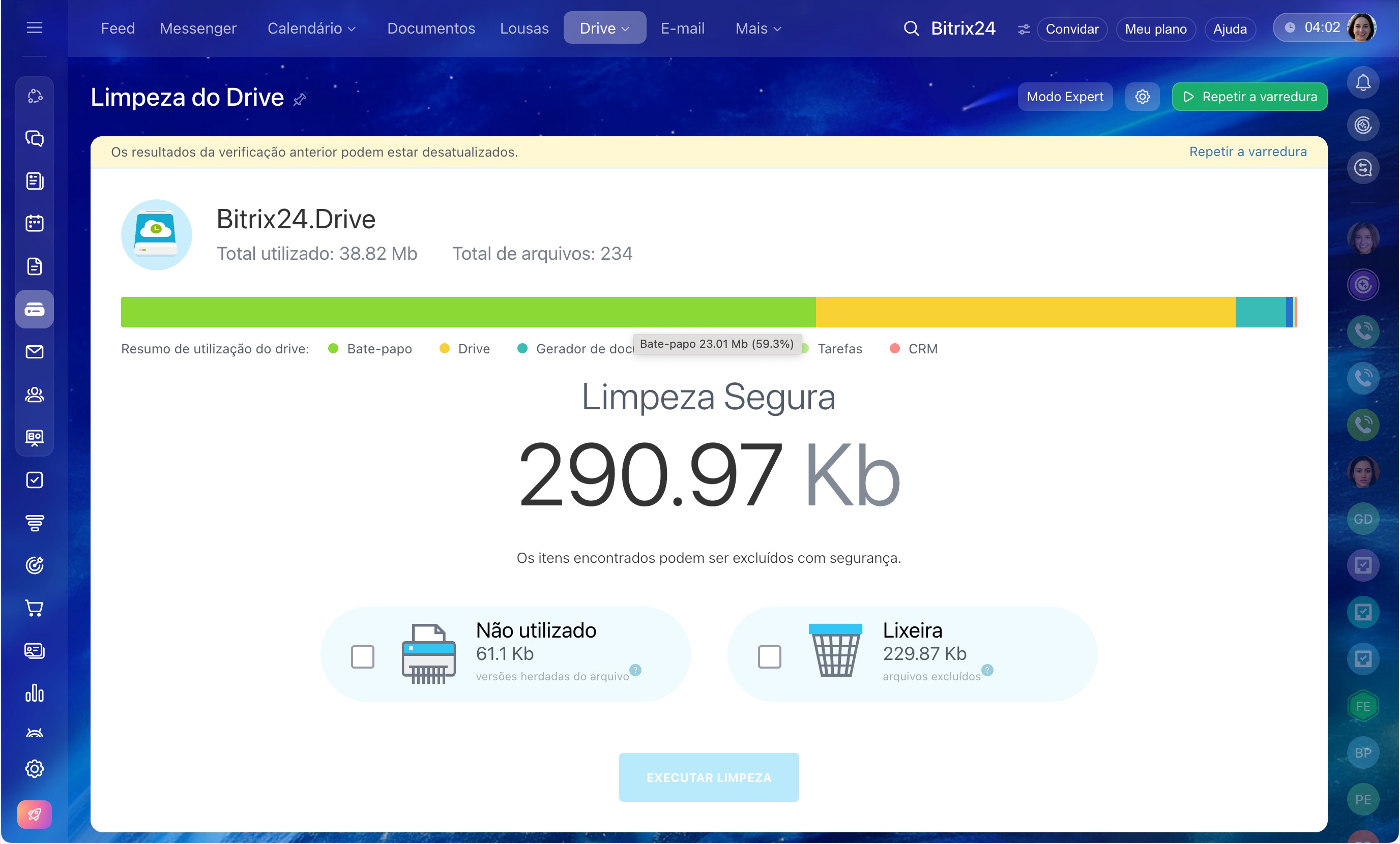 Limpeza de espaço no Drive. Inicie a verificação. O Bitrix24 mostrará quanto espaço está sendo utilizado no Drive e quais arquivos podem ser excluídos com segurança. Marque os desejados e clique em Executar limpeza.