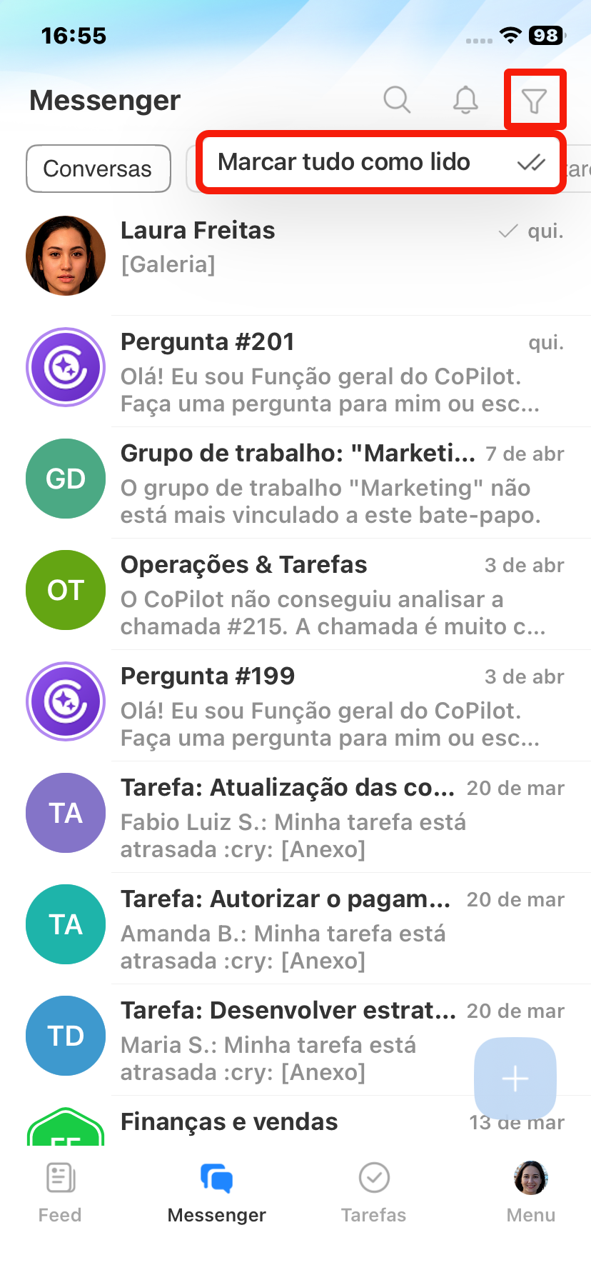 Clique no ícone de funil no canto superior direito e selecione Ler tudo.