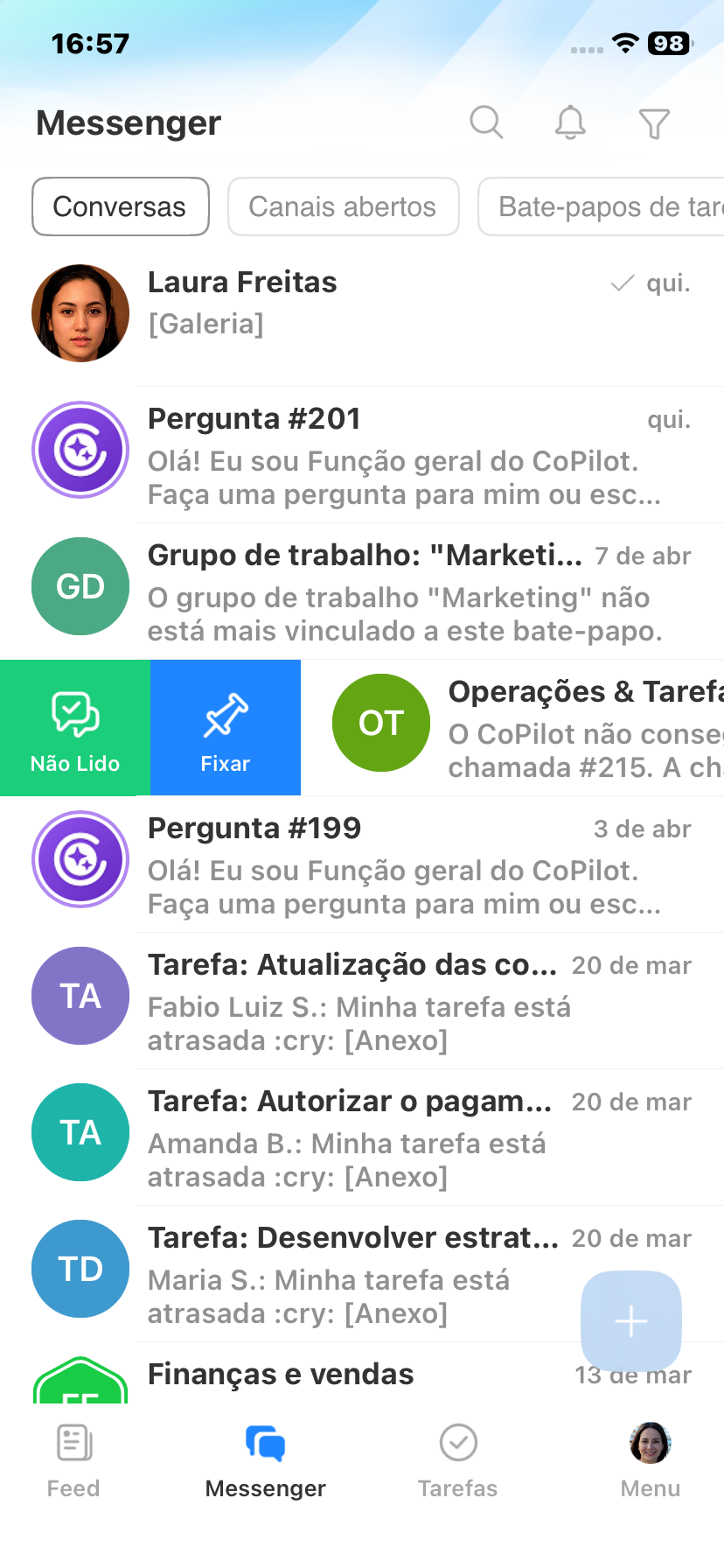 No messenger do Bitrix24, estão reunidos os chats com colegas, clientes e o assistente virtual. Na lista, você pode abrir rapidamente a conversa desejada, fixar um diálogo importante, criar um novo chat e assim por diante.