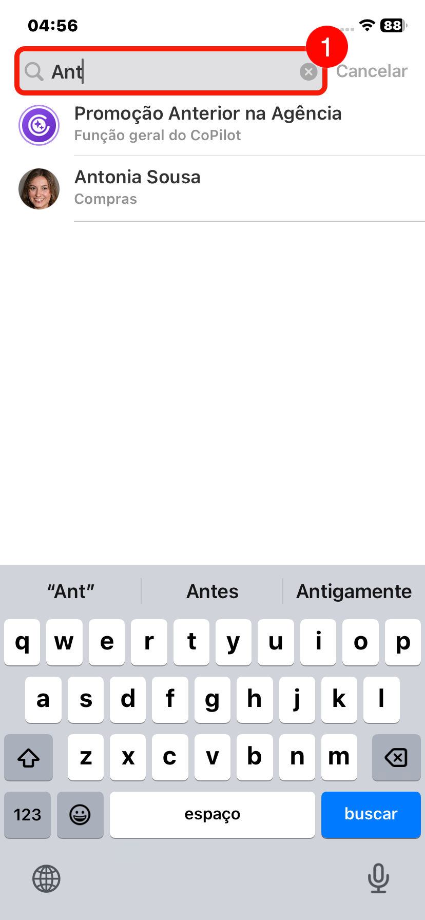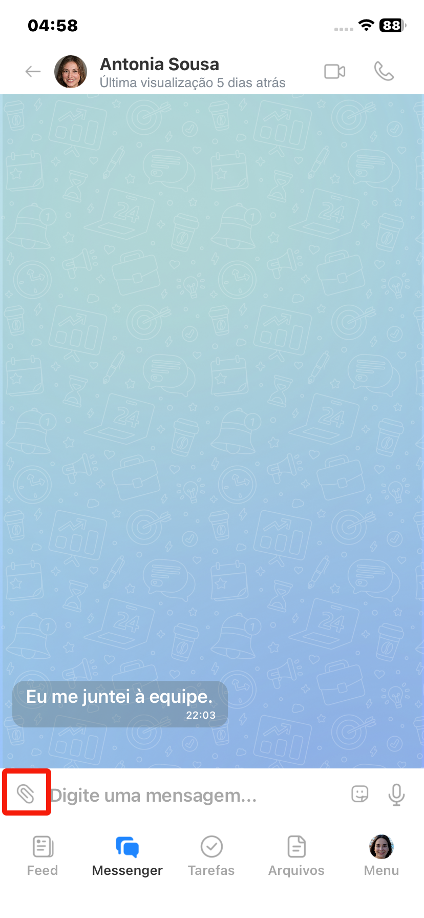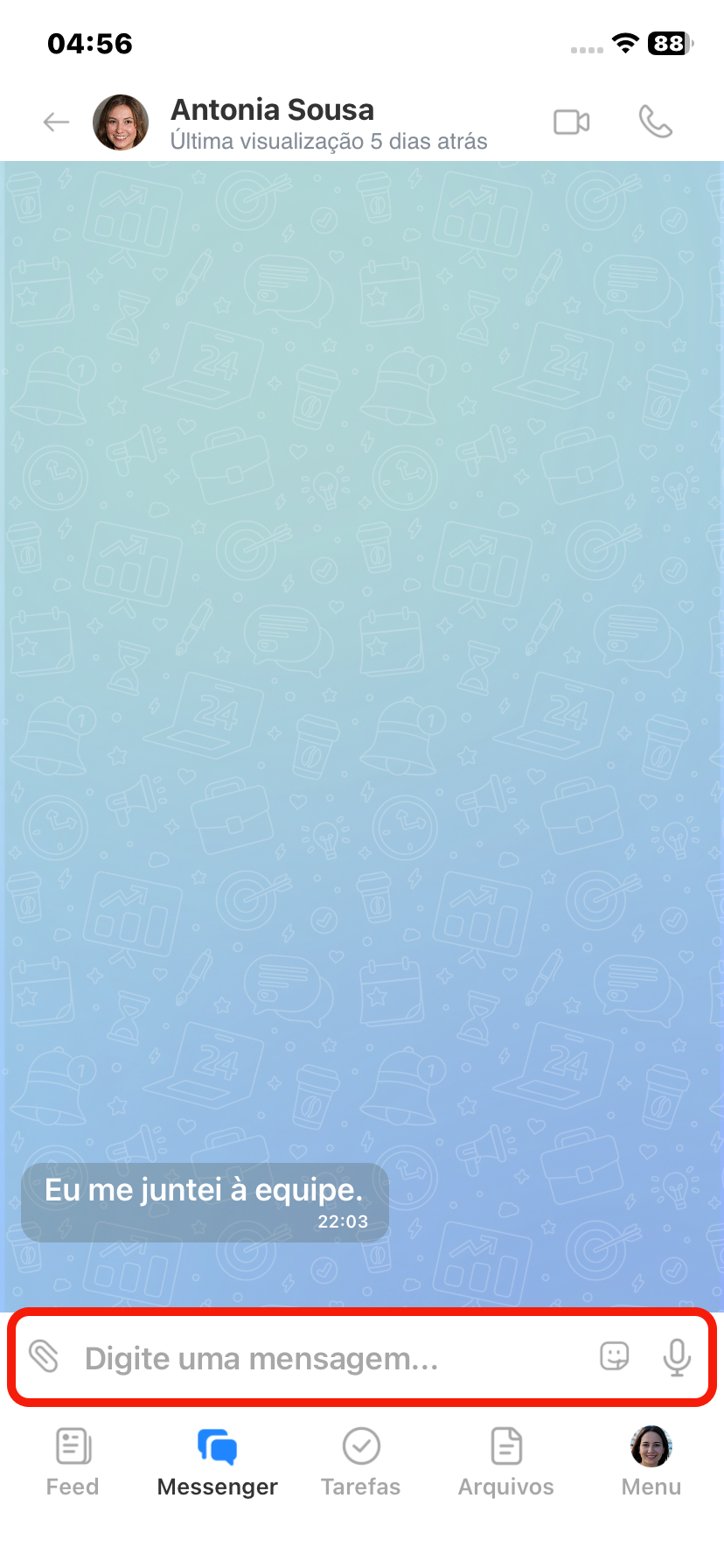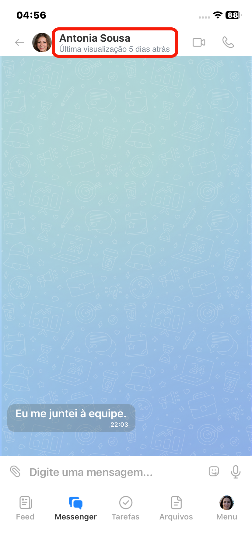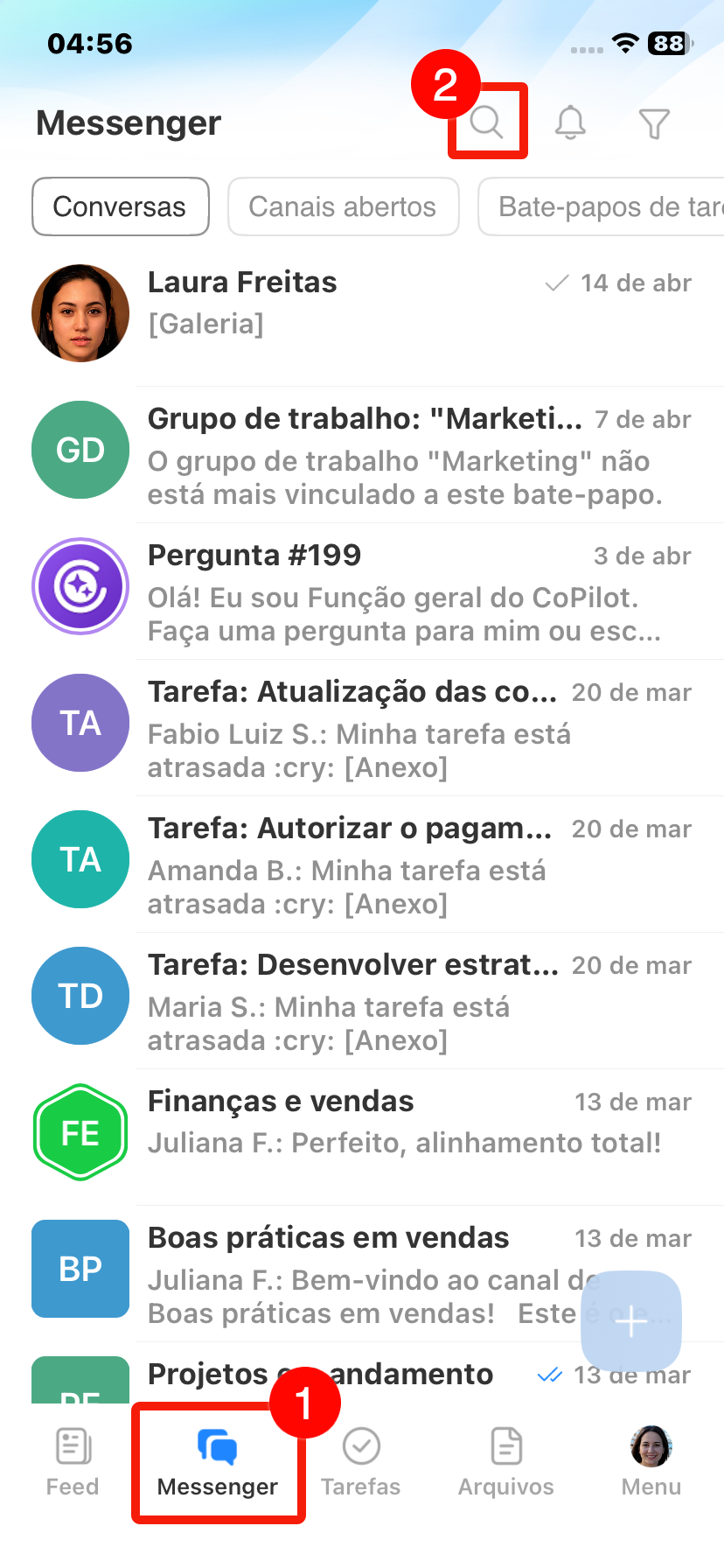 Encontrar um colega. Acesse a aba Messenger no canto inferior esquerdo. Para encontrar um colaborador, toque na lupa.