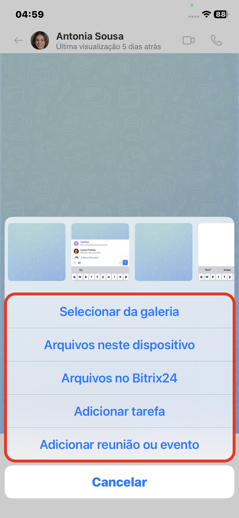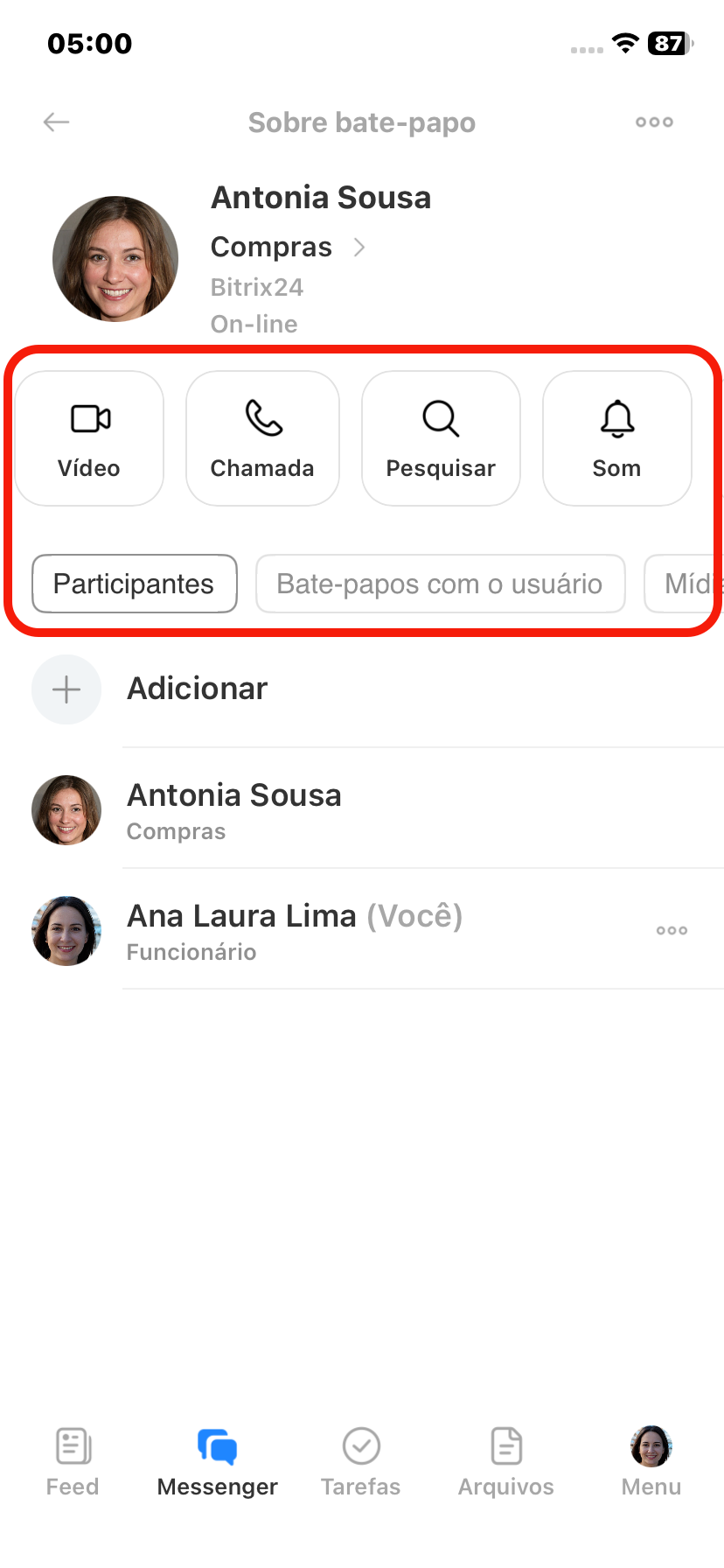 No aplicativo móvel do Bitrix24, você pode enviar uma mensagem, ligar, criar uma tarefa ou agendar uma reunião diretamente do chat com um colega, sem precisar alternar entre as seções.