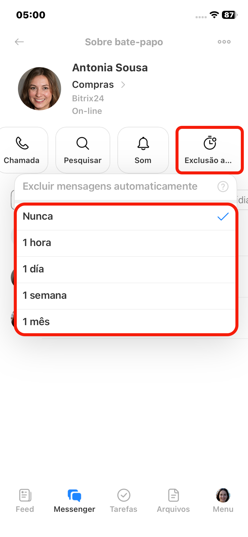 A exclusão automática é útil se dados pessoais ou confidenciais forem compartilhados na conversa. Toque em Exclusão e escolha o prazo desejado para a remoção das mensagens, como uma hora ou um mês.