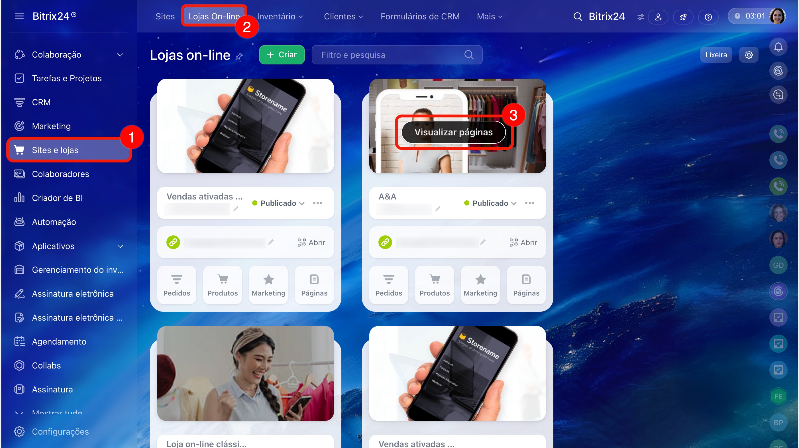 Acesse a seção Sites e lojas > Lojas. Passe o cursor sobre a loja desejada e clique em Ver páginas.