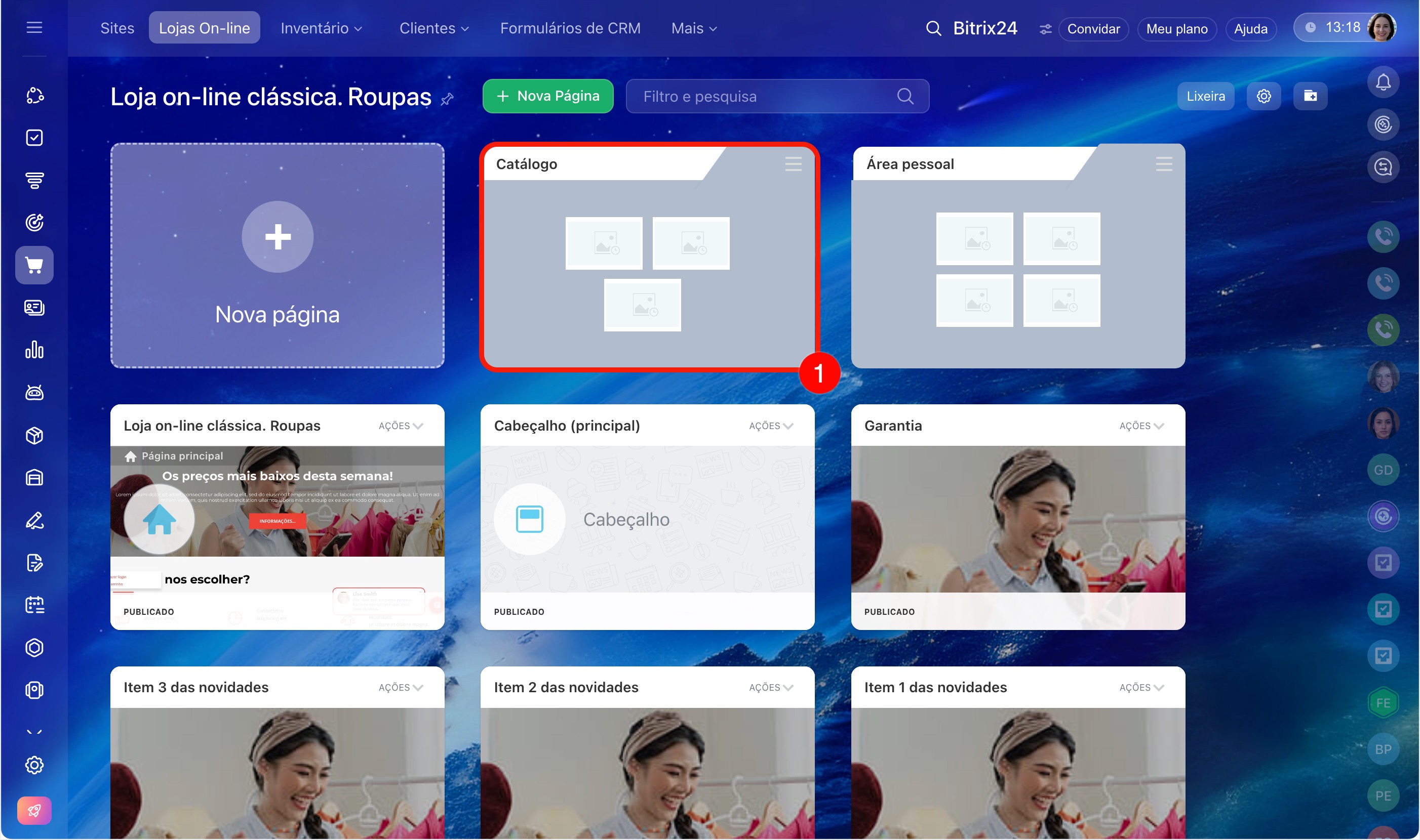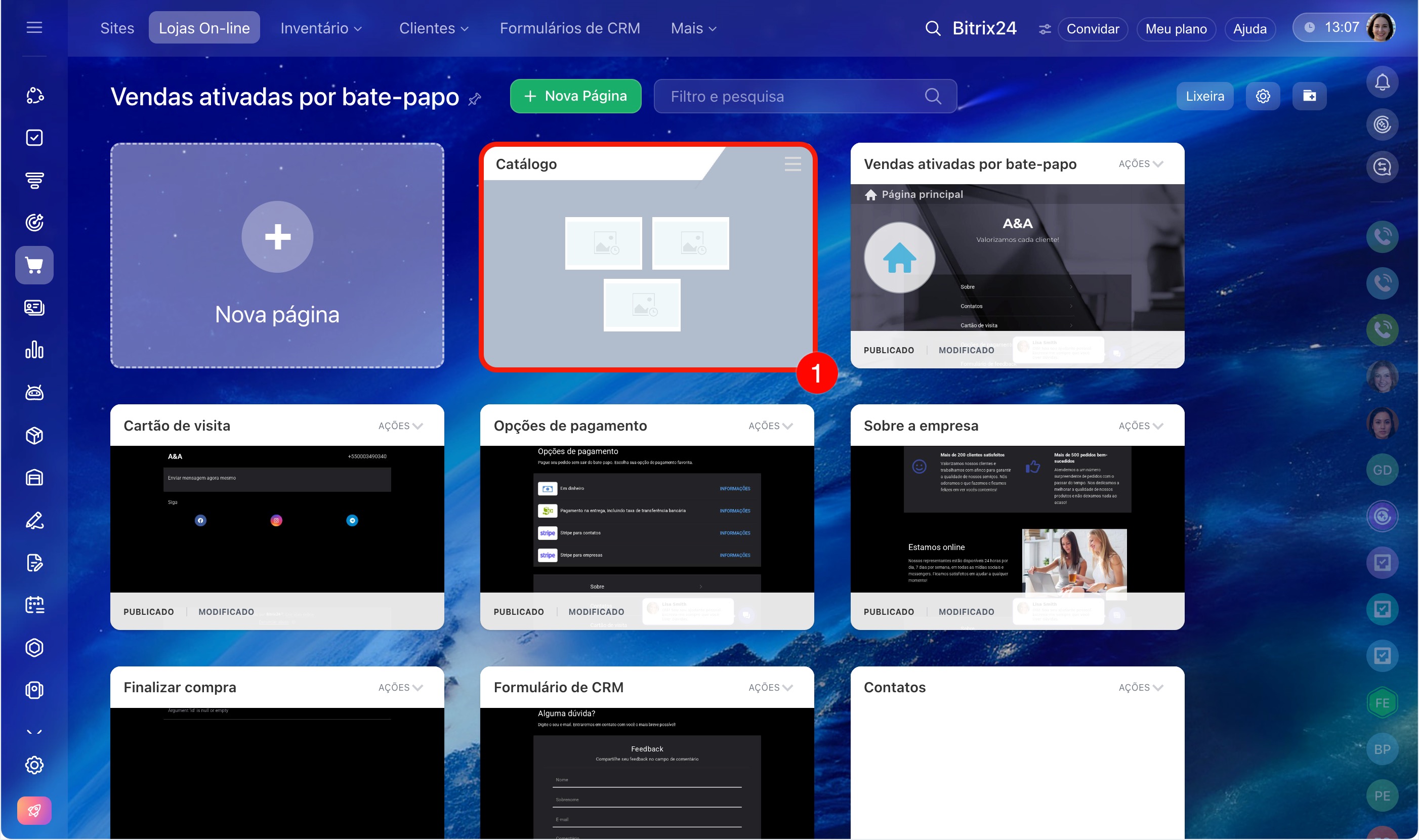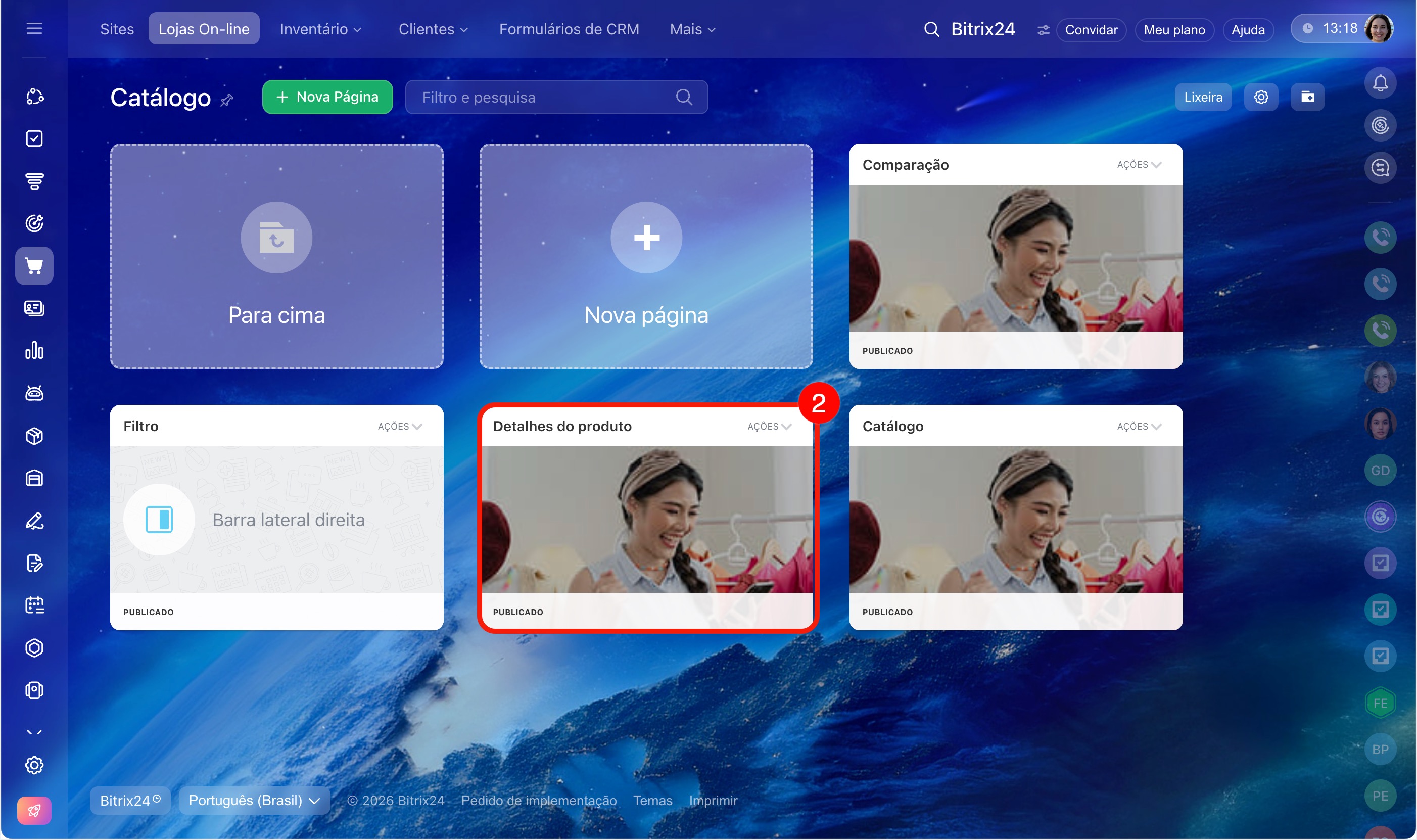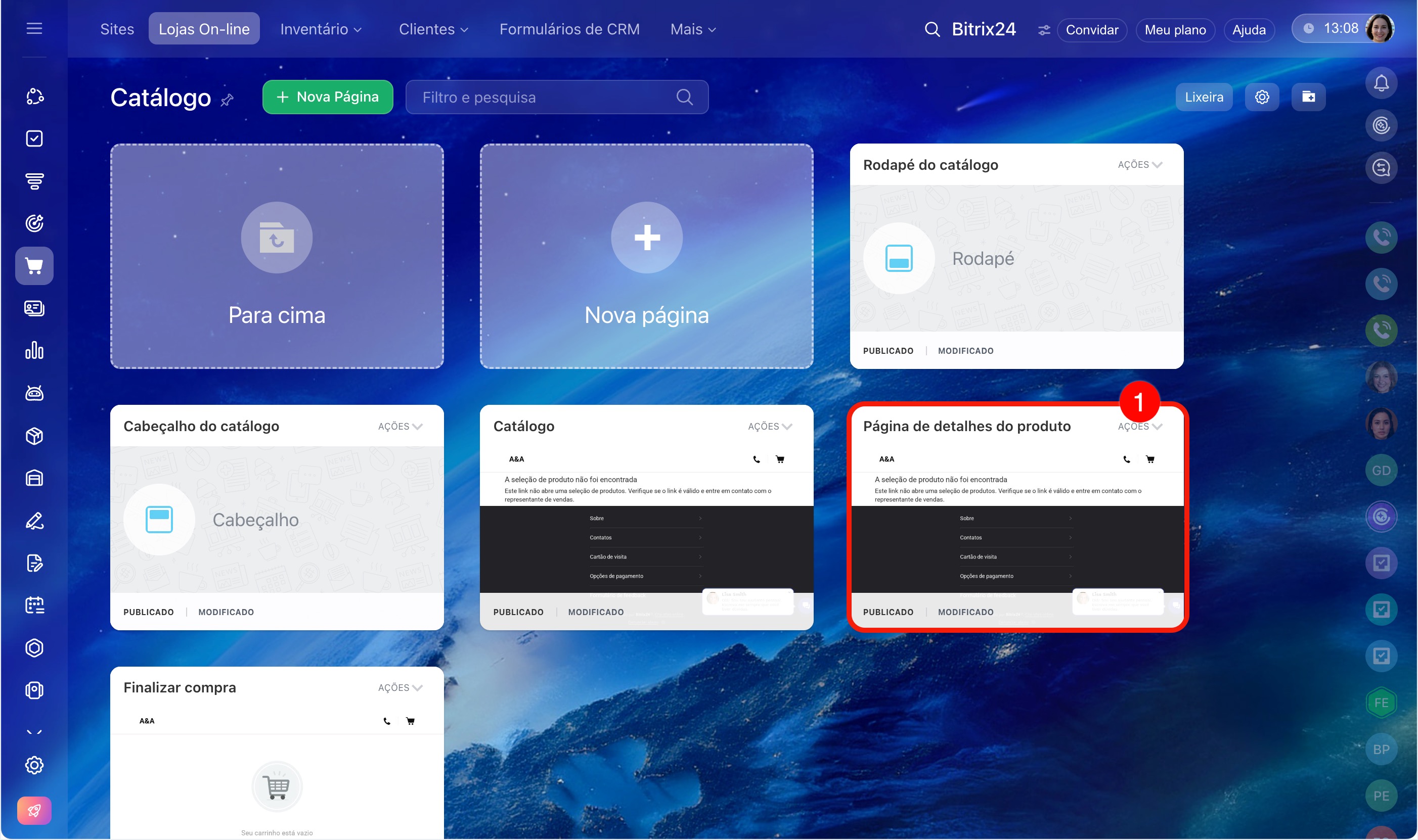 CRM + Loja online. Acesse a pasta Catálogo e clique na página Cartão de produtos para abrir o editor de sites.