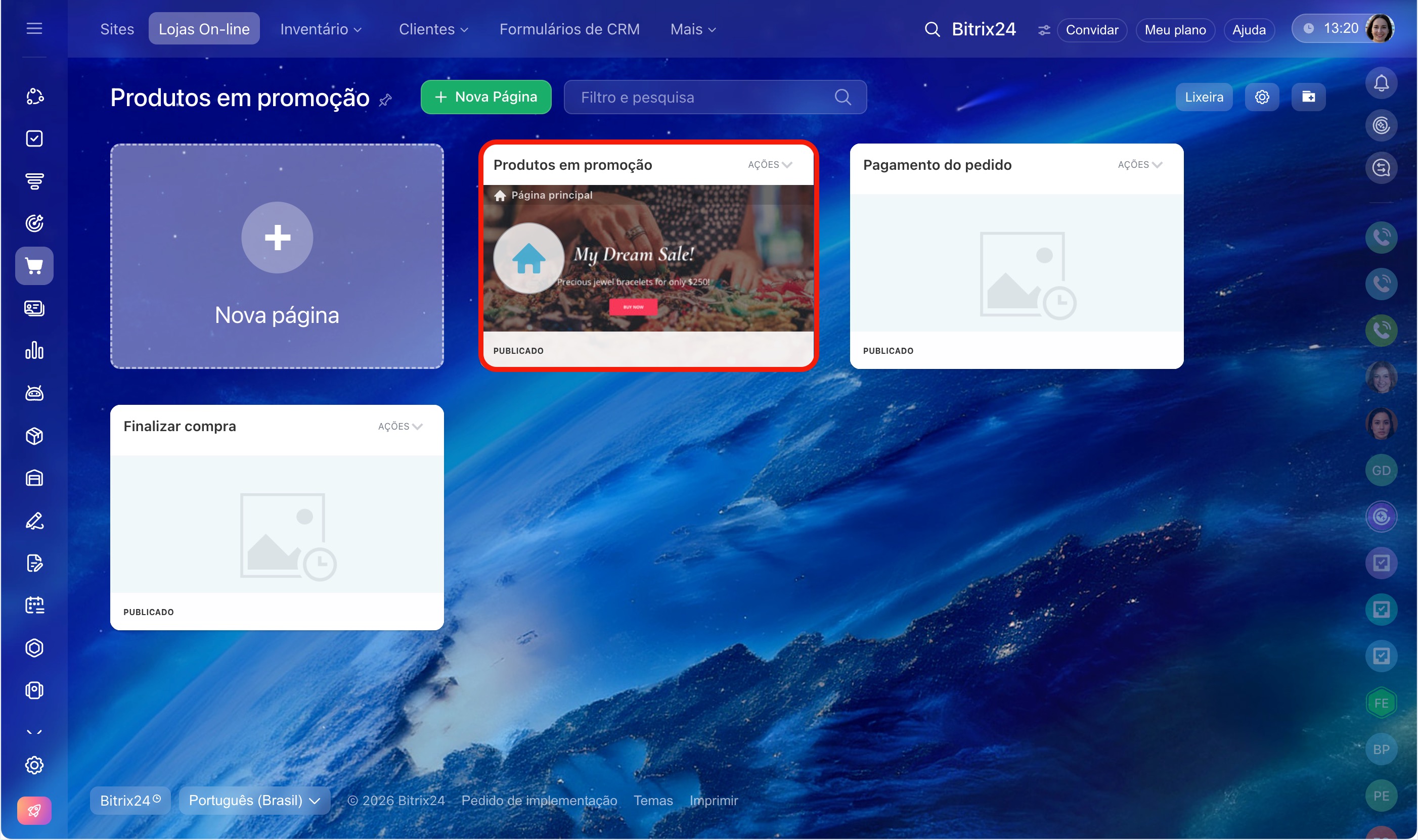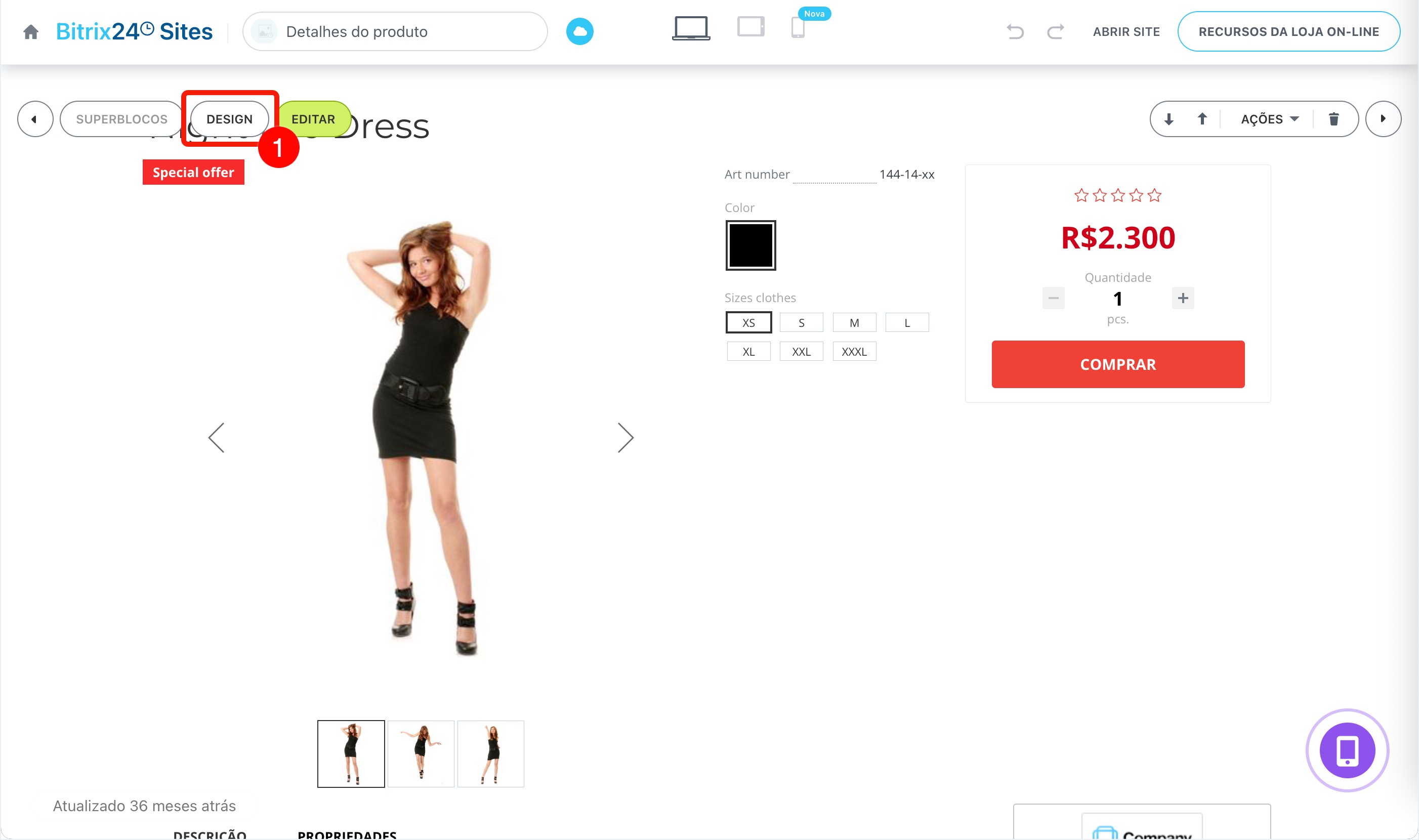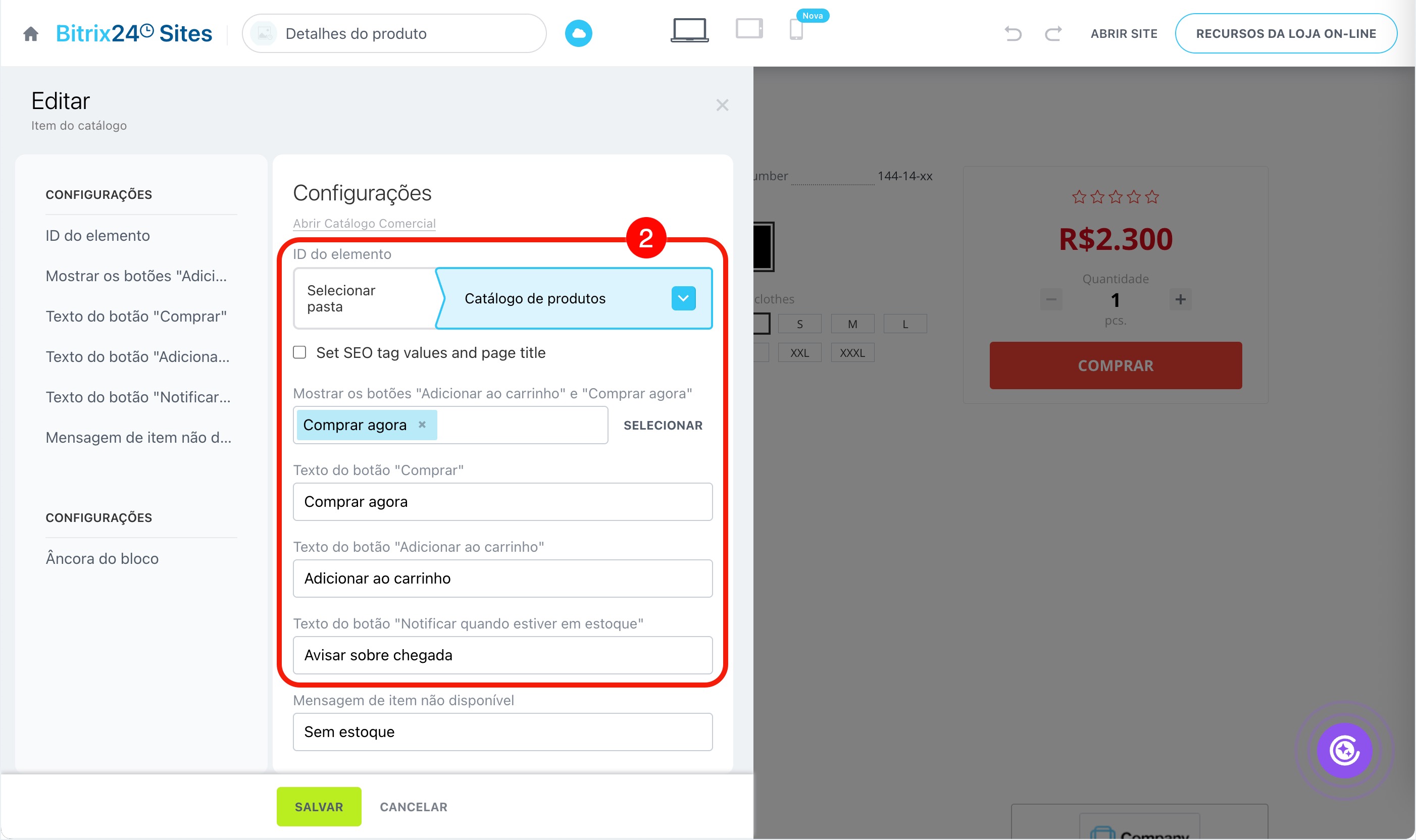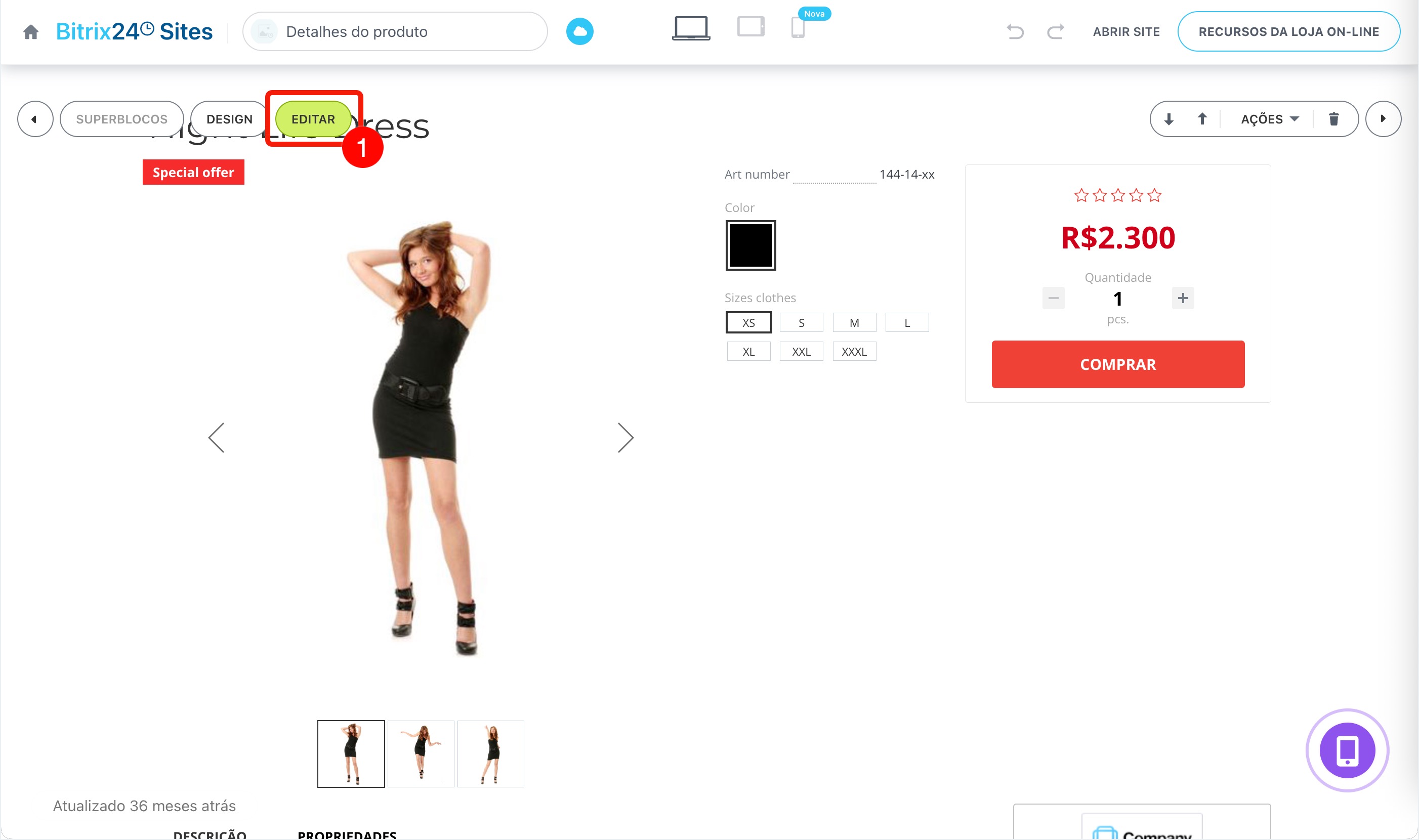 CRM + Loja online. Acesse a pasta Catálogo e clique na página Cartão de produtos para abrir o editor de sites.