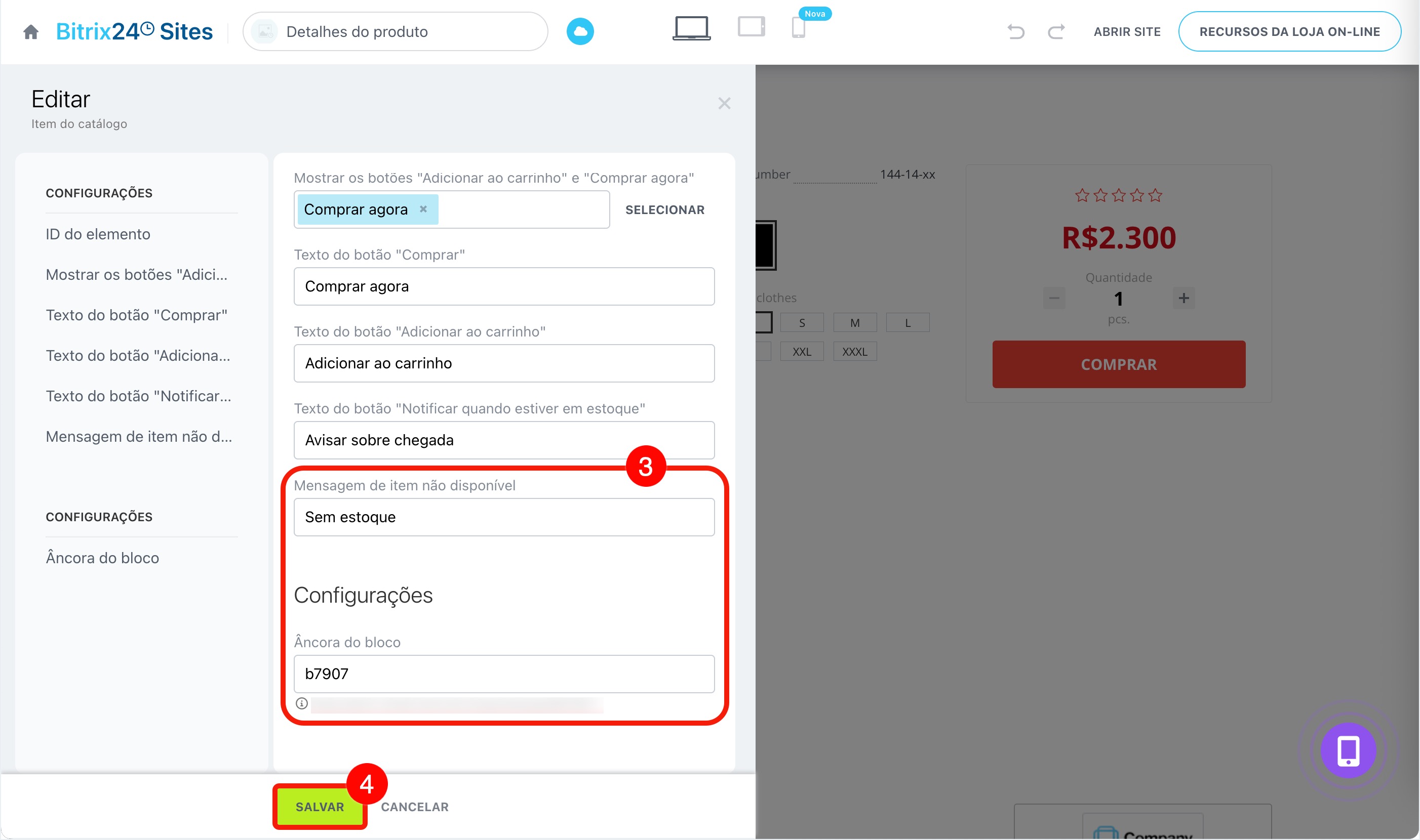 - Mensagem de produto indisponível: escreva o texto que será exibido no botão Comprar se o produto estiver temporariamente indisponível. Por exemplo, Sem estoque.