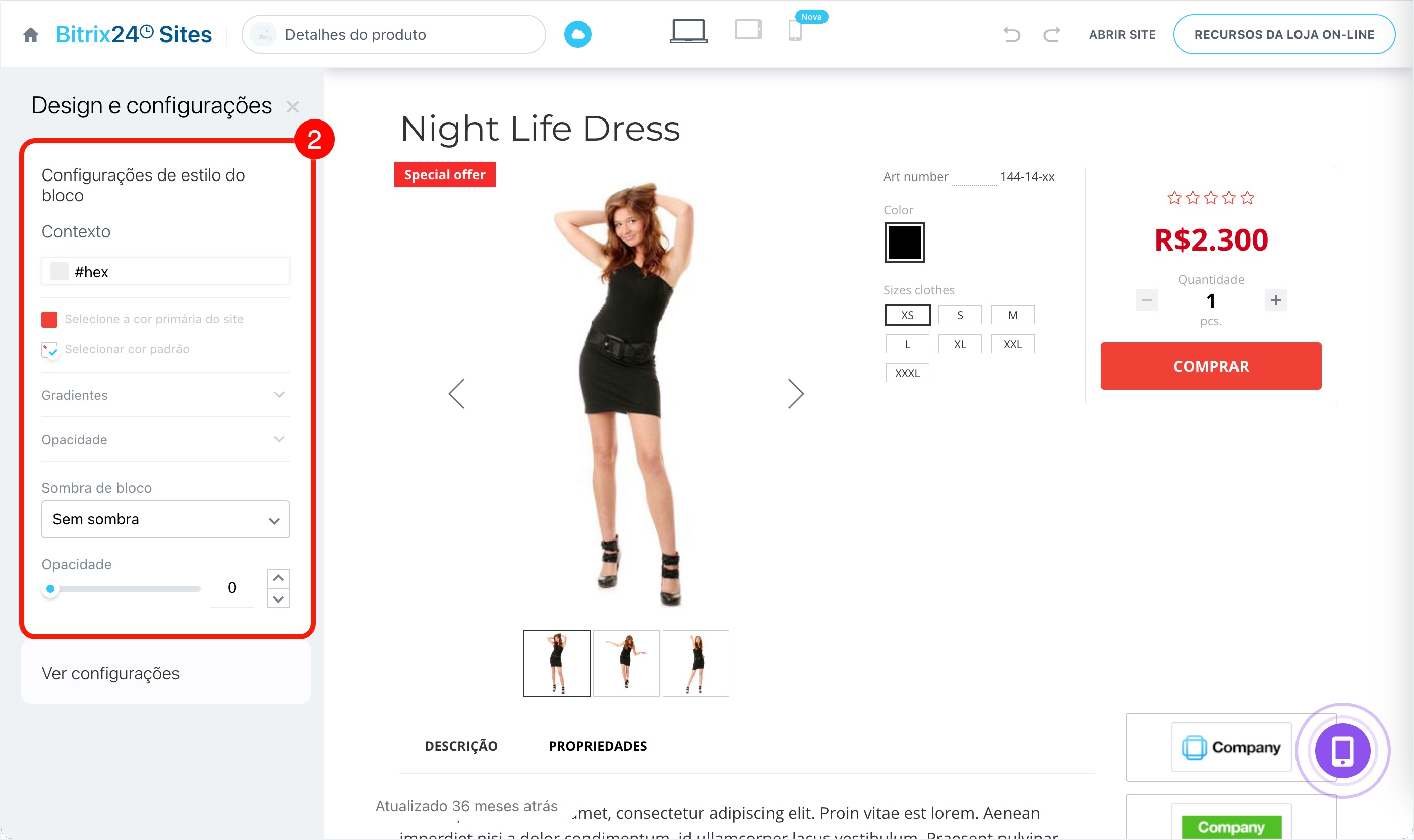 - Passe o cursor sobre o bloco e clique em Design. Ajuste a cor de fundo, a transparência, o gradiente e a sombra, bem como a posição dos selos, do desconto e dos blocos de informações.