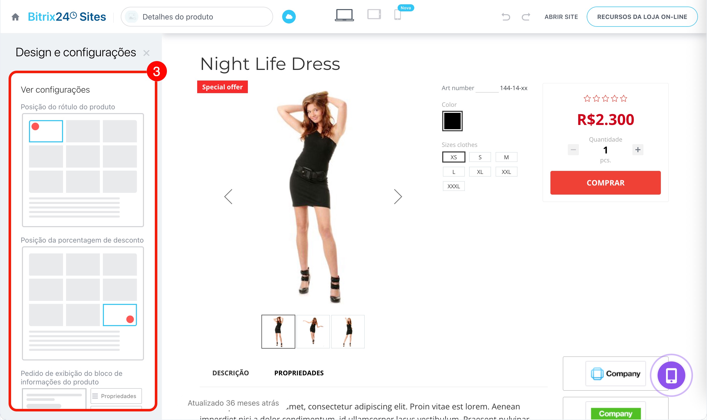 - Ordem de exibição dos blocos de informações do produto: defina a ordem dos blocos. Por exemplo, você pode exibir primeiro o preço e o botão de compra, e abaixo a descrição e as propriedades do produto.