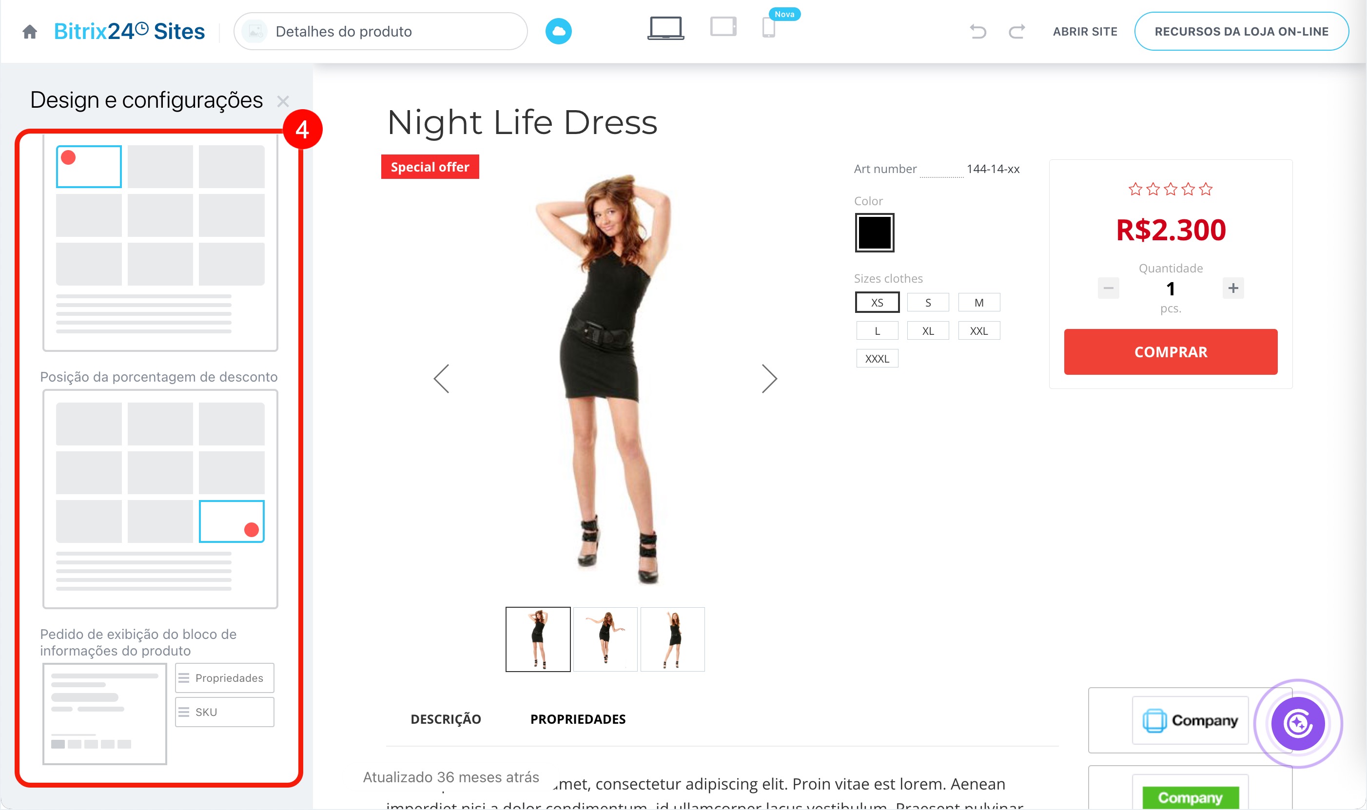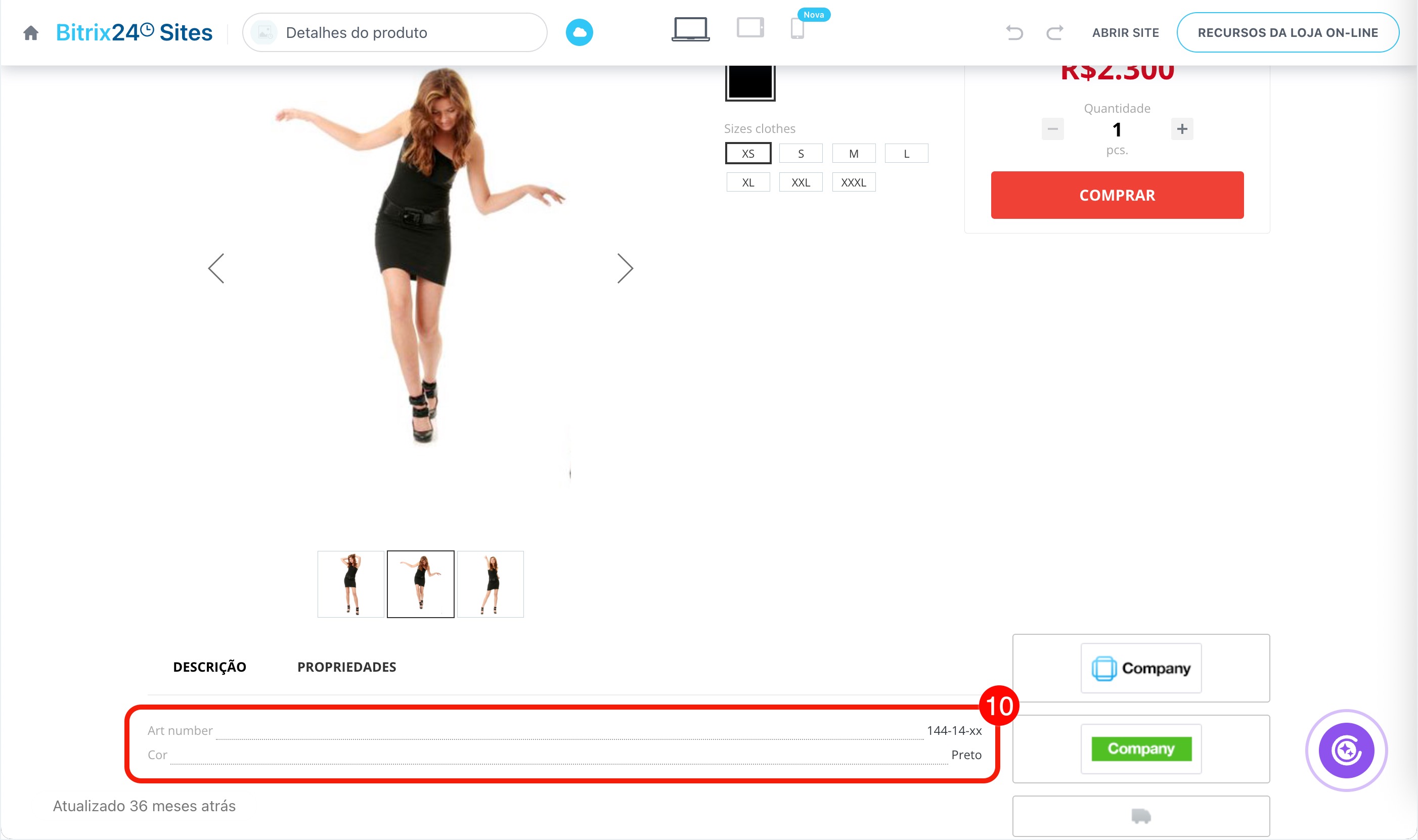 Na página detalhada, você pode exibir as características do produto, como cor, material ou modelo. Para isso, é necessário ativar a exibição dos campos do cartão do produto.