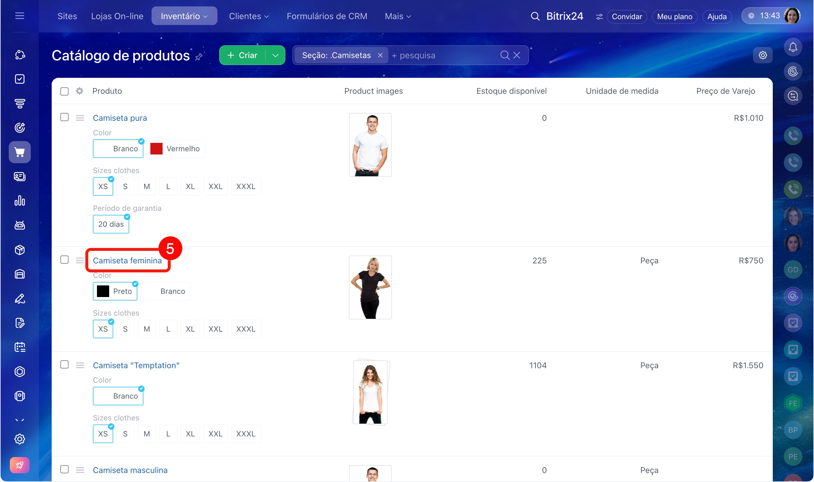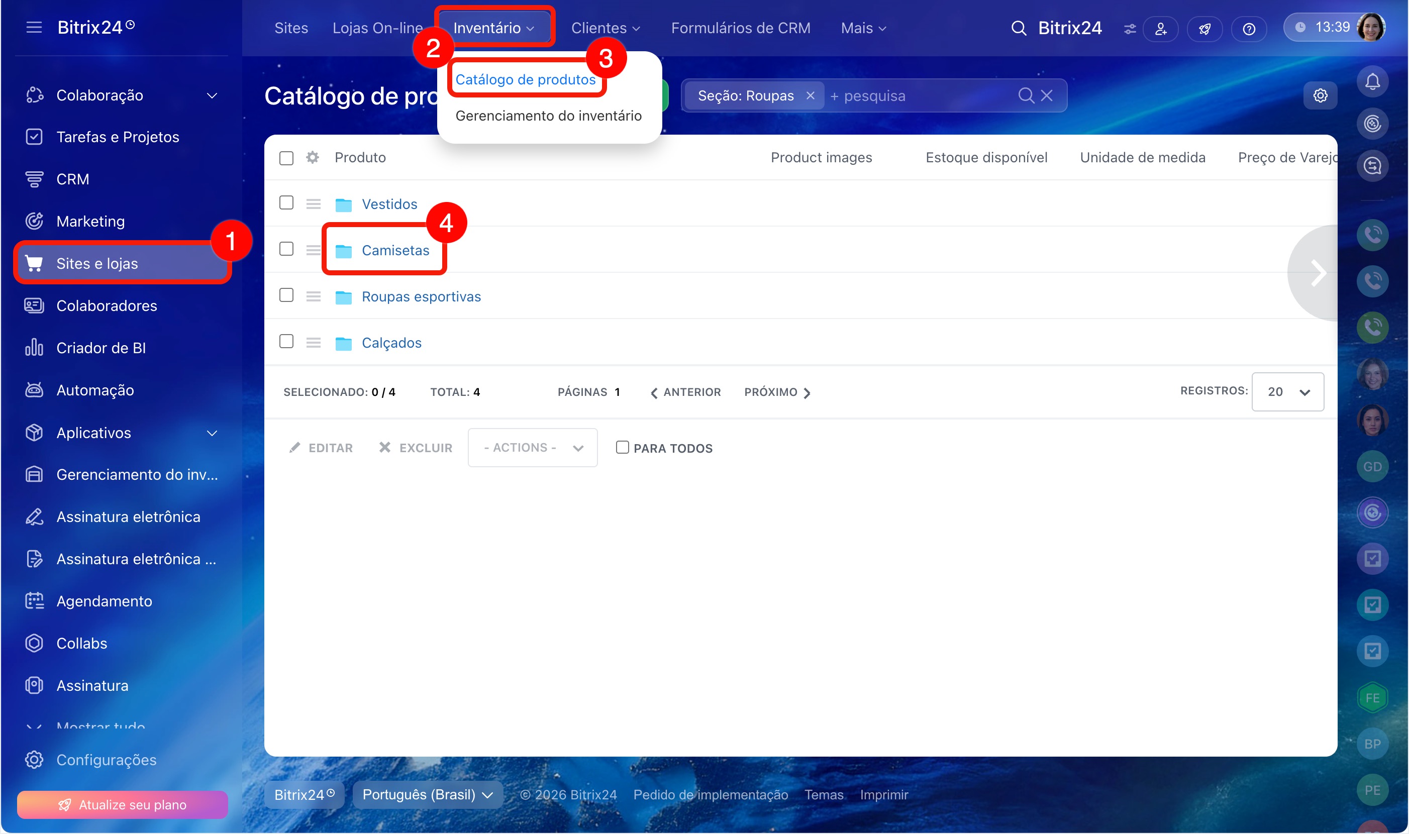 1-5. Acesse Sites e lojas > Produtos e estoques > Catálogo de produtos. Selecione a seção desejada e abra o cartão do produto.