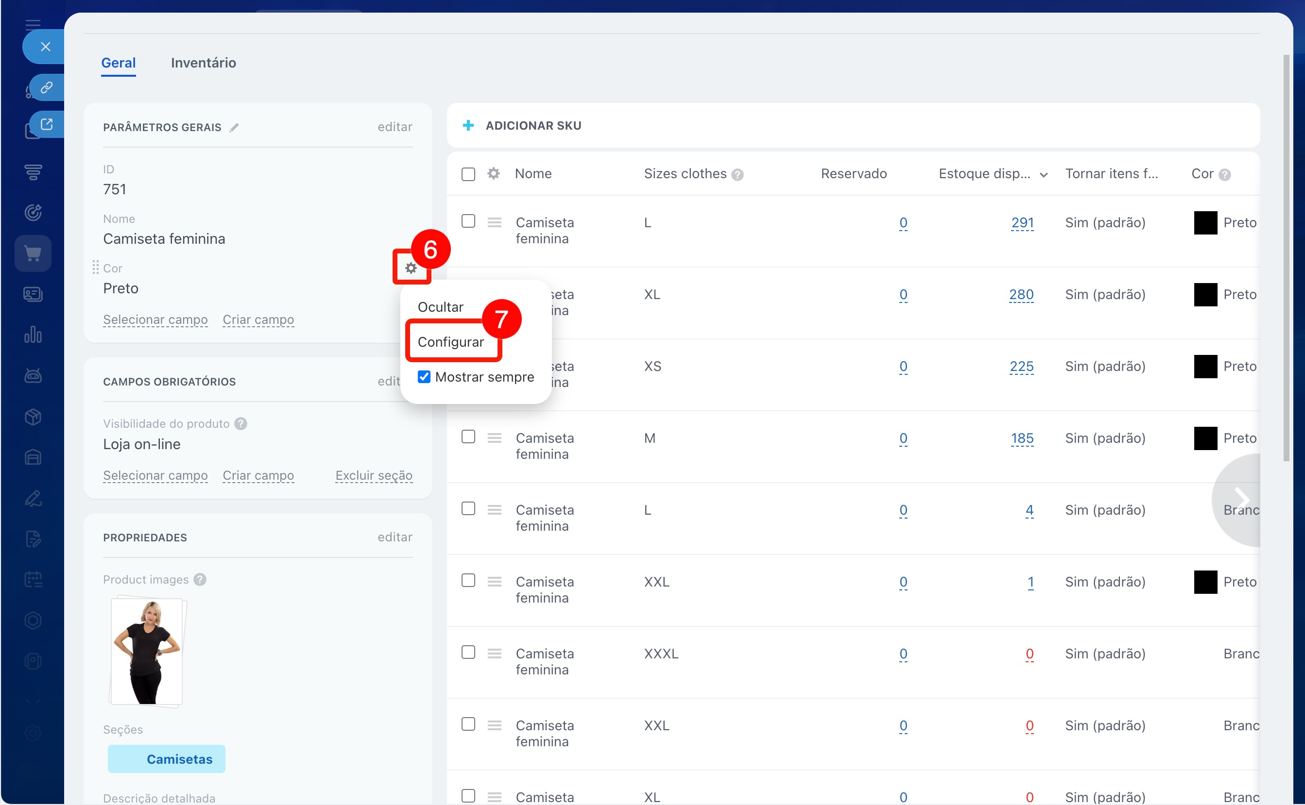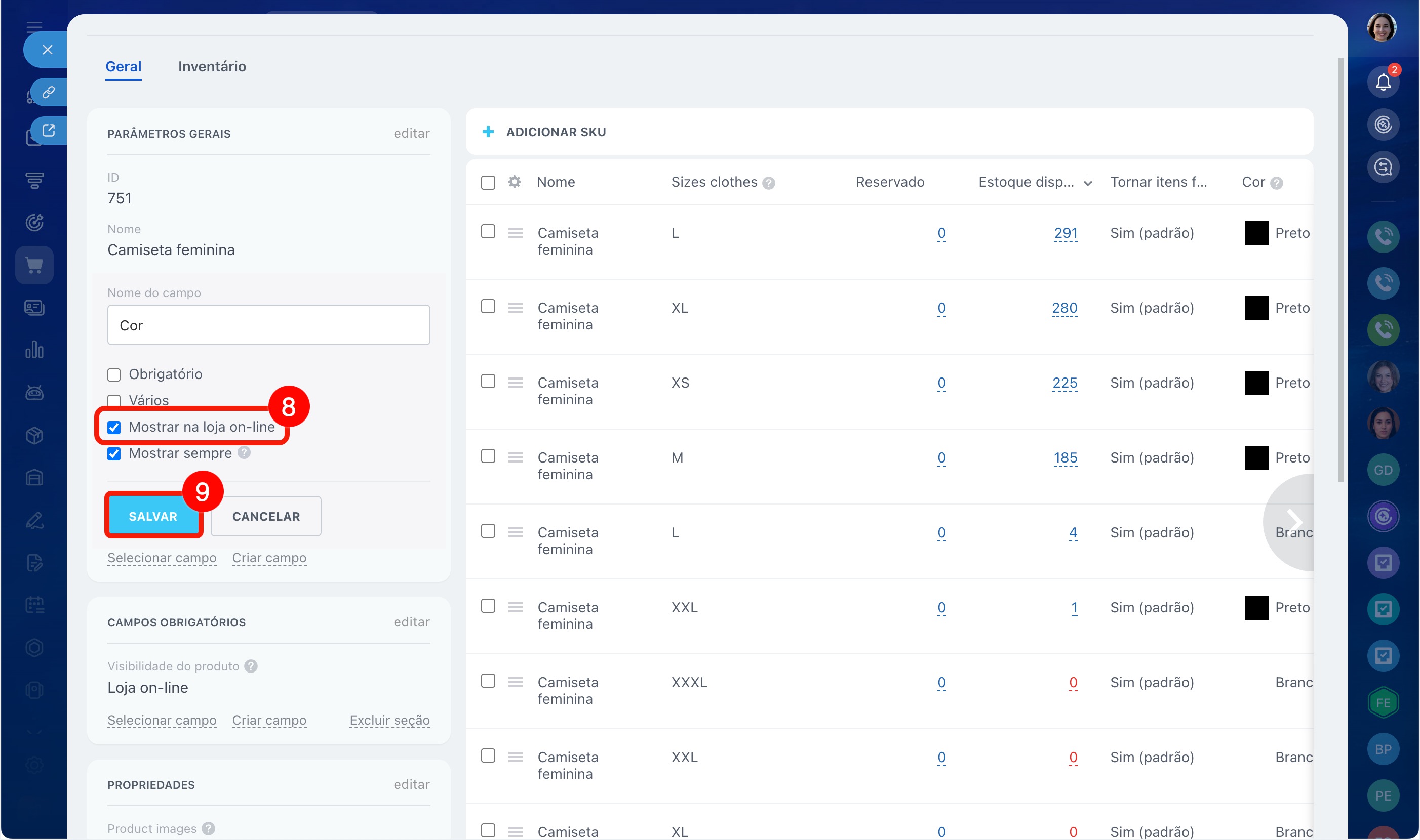 6-10. Passe o cursor sobre o campo e clique em Configurações (⚙️) > Configurar. Ative o parâmetro Exibir na loja online. Salve as alterações.