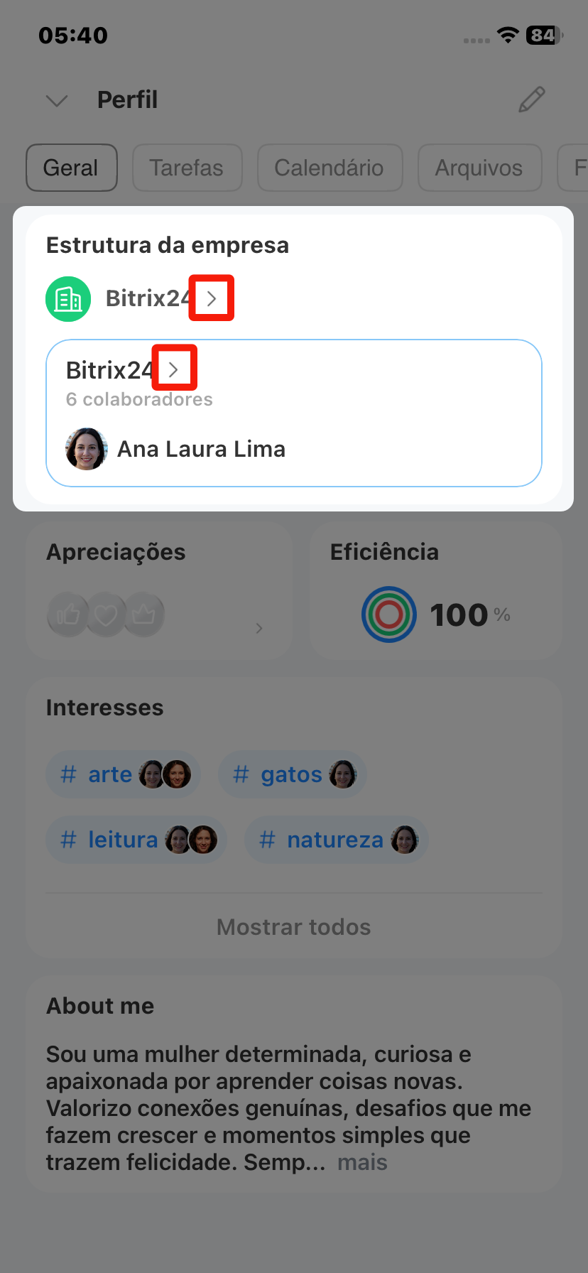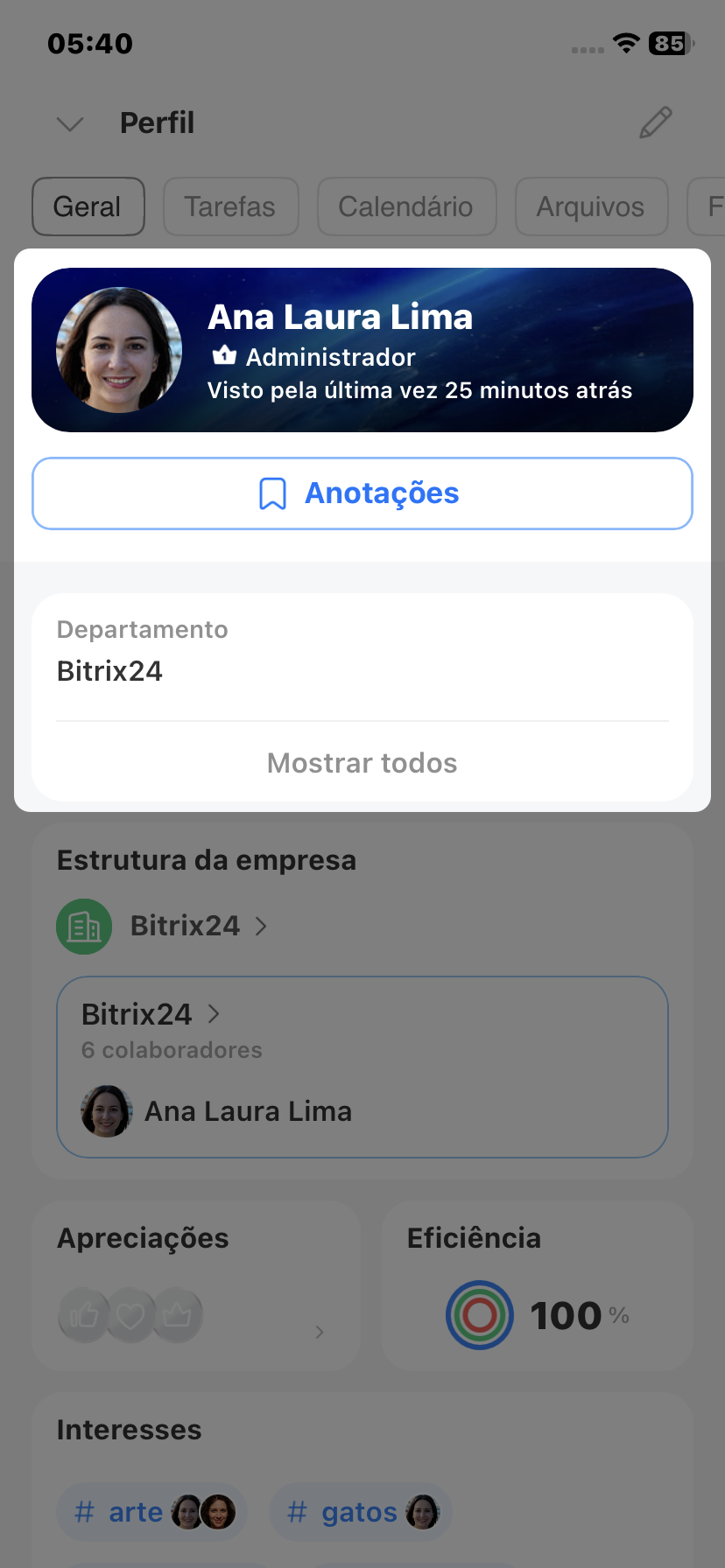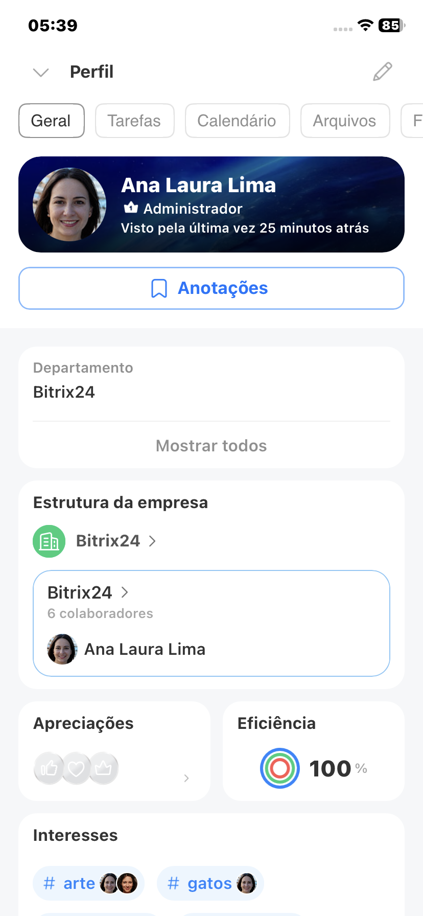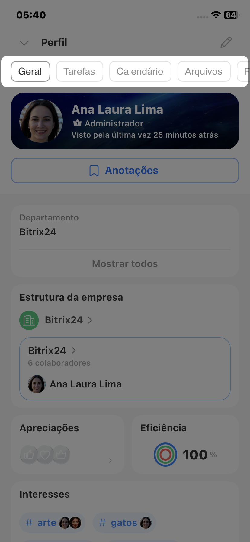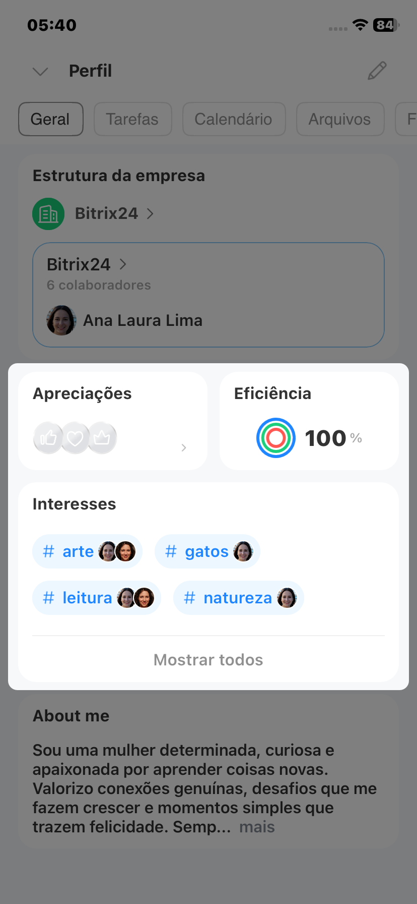 O perfil no Bitrix24 é o "cartão de visita" do colaborador dentro da empresa. Com ele, os colegas podem descobrir rapidamente em que departamento a pessoa trabalha, entrar em contato, ver interesses em comum e outras informações.