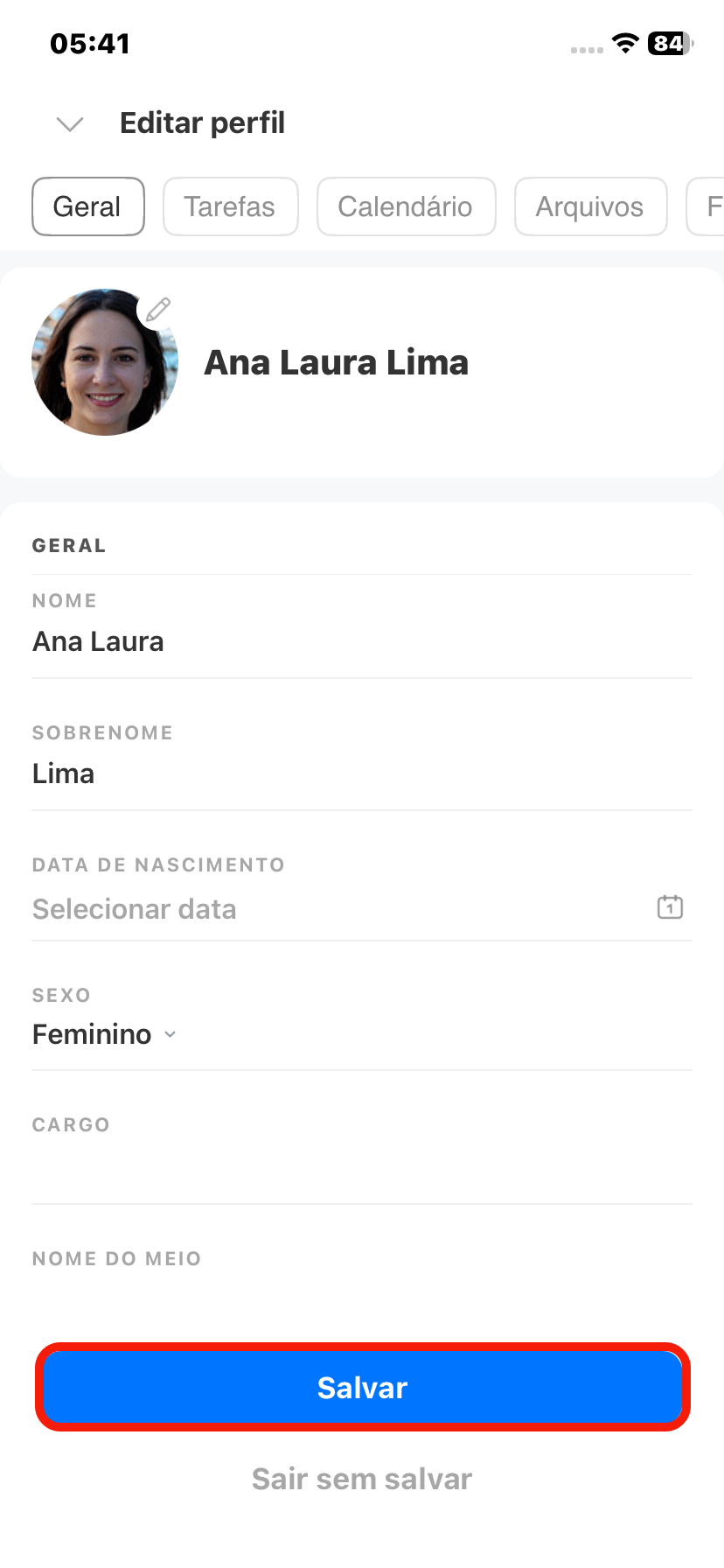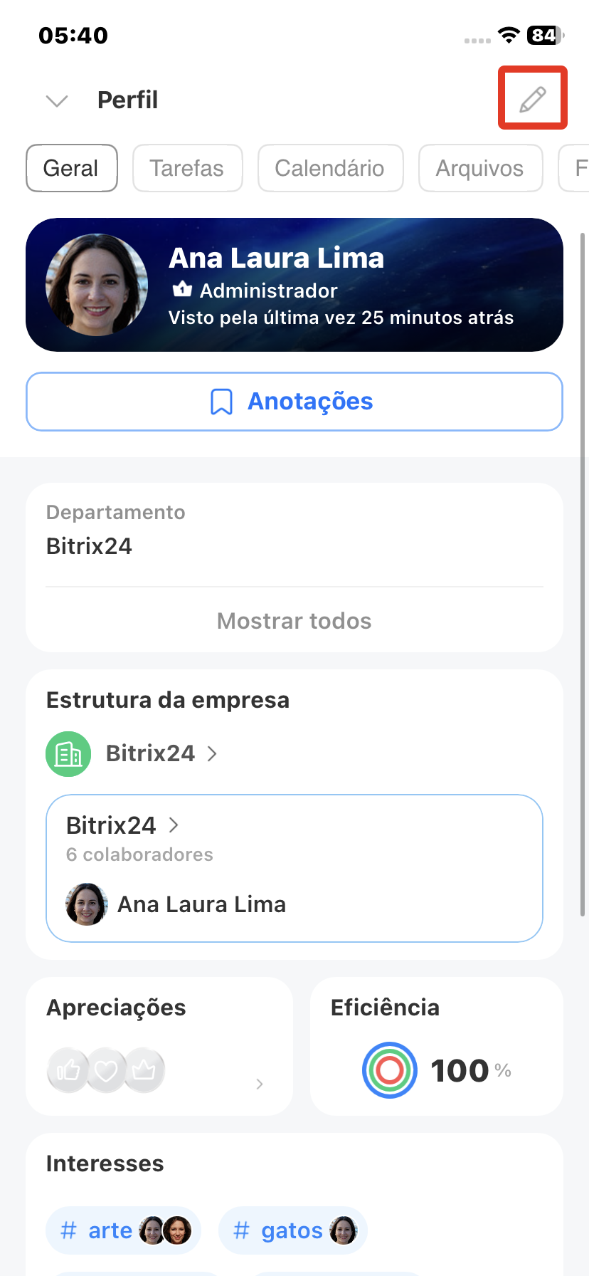 Por exemplo, você pode alterar o telefone, e-mail, cargo ou enviar uma nova foto. Para isso, clique no lápis no canto superior direito.