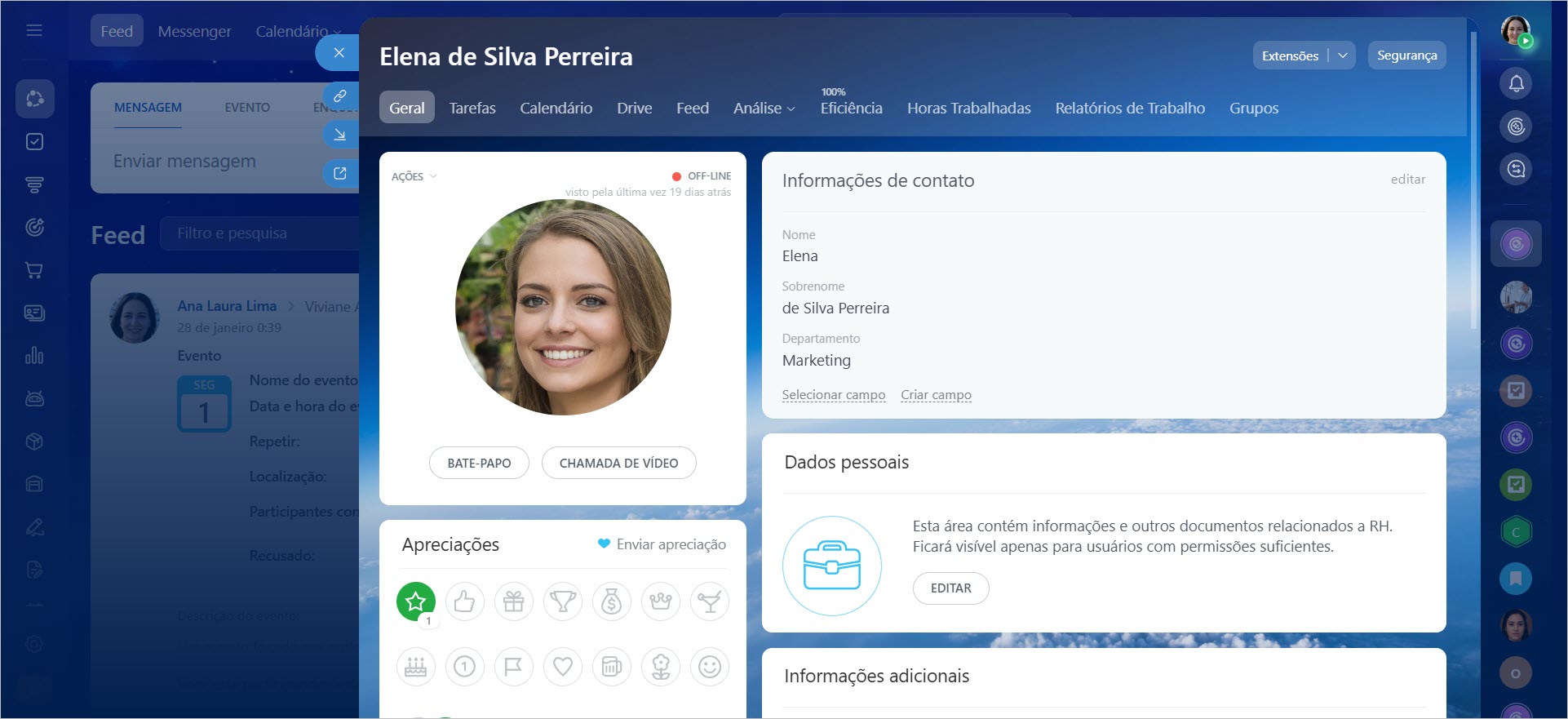 O perfil no Bitrix24 é como um "cartão de visita" do colaborador dentro da empresa. Ele permite que os colegas saibam rapidamente em qual departamento a pessoa trabalha, entrem em contato com ela, vejam interesses em comum e outras informações.