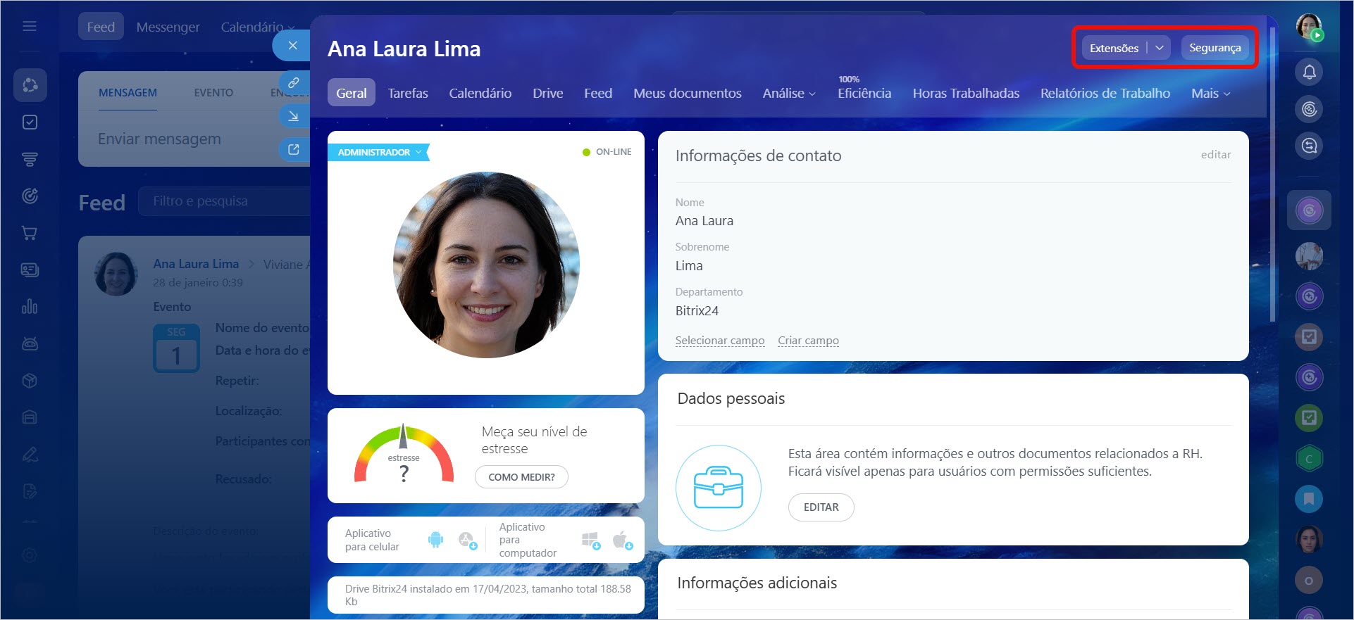 - O perfil do colaborador pode ser acessado no Bitrix24 tanto pelo computador quanto pelo aplicativo móvel.