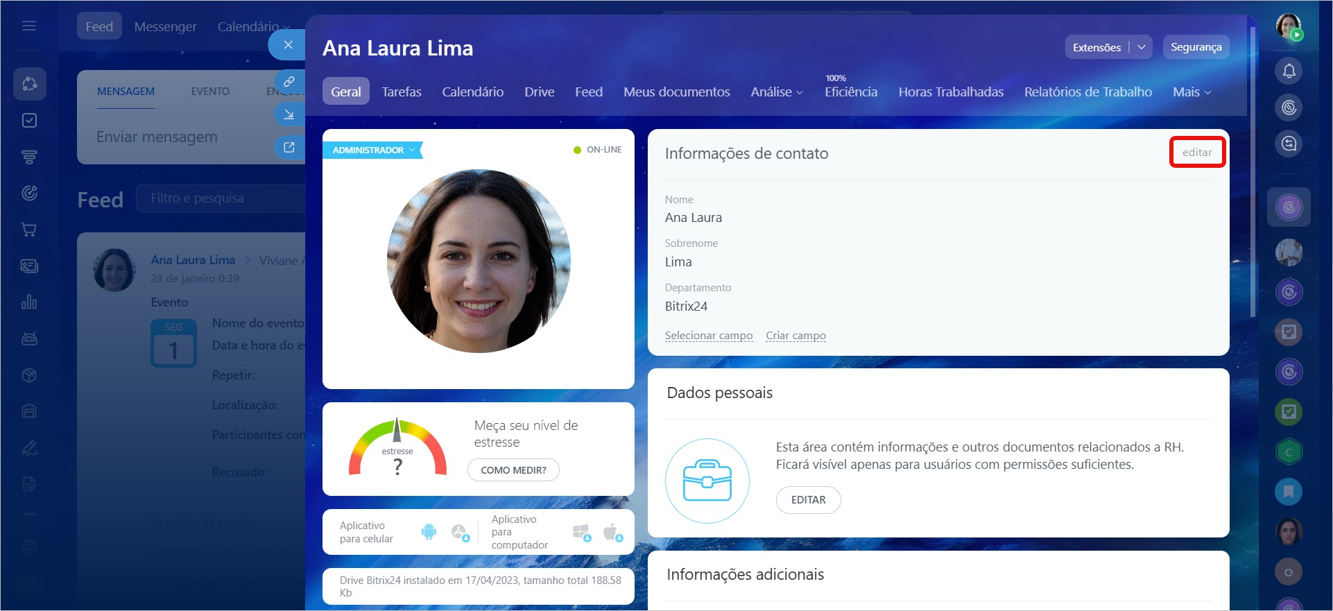 - As informações no perfil podem ser editadas a qualquer momento. Tanto o colaborador quanto o administrador do Bitrix24 podem fazer isso.