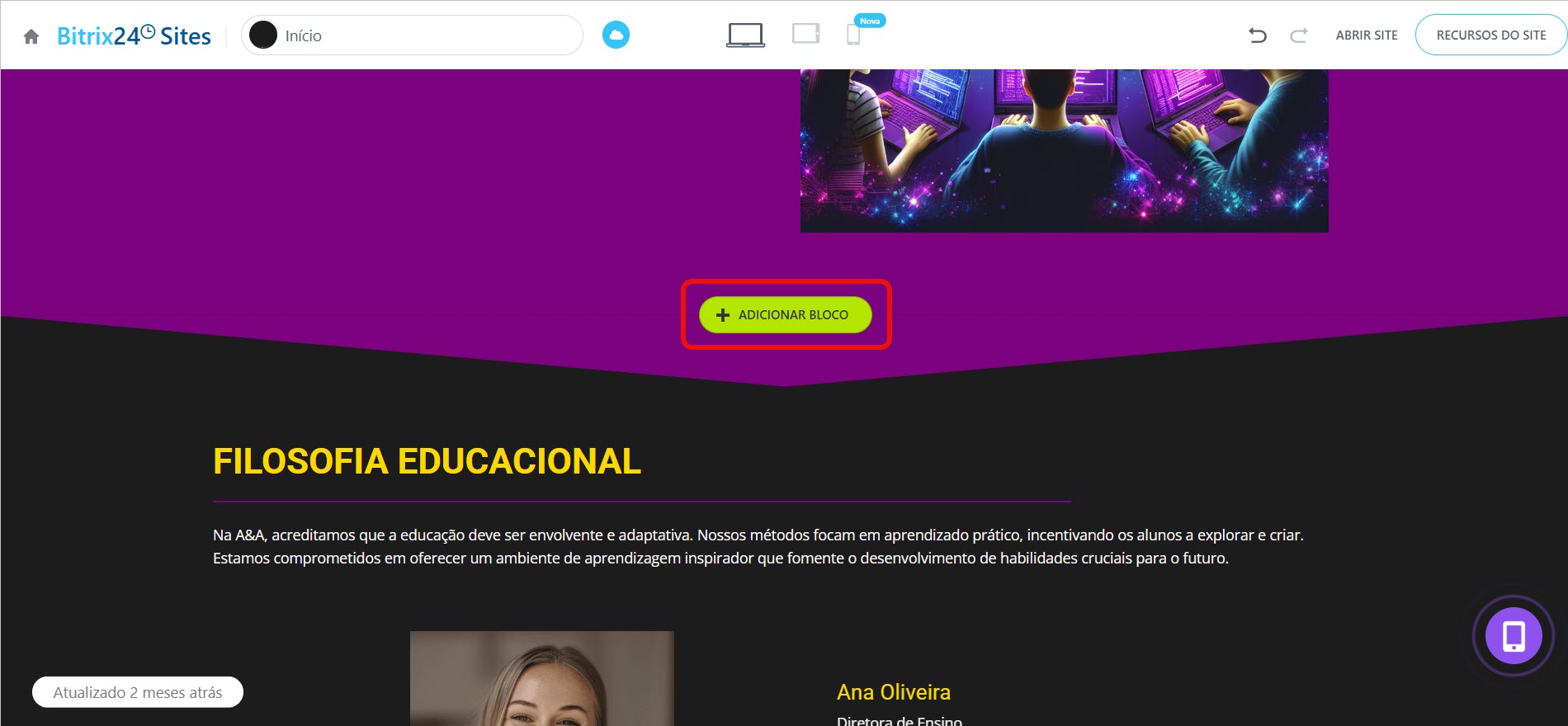 • Escolha o local onde o formulário será inserido e clique em Adicionar bloco.