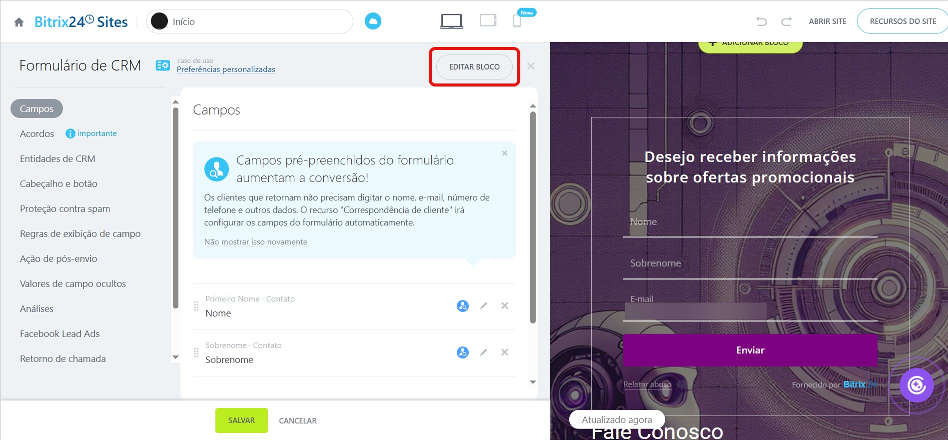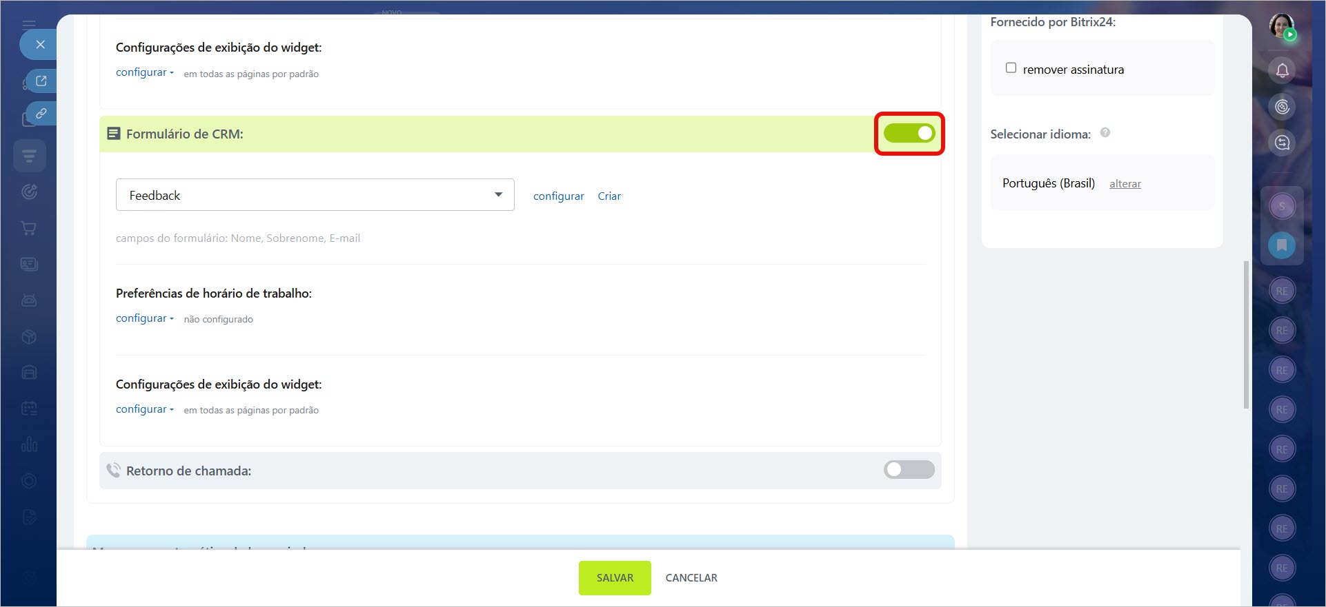 Configure os parâmetros e o design do formulário de CRM ou selecione um formulário de CRM já criado.