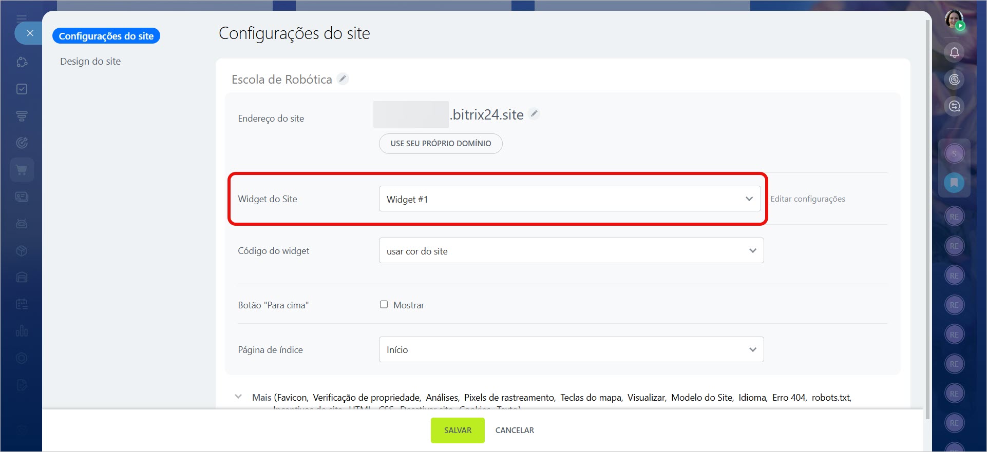 1. Acesse CRM > Vendas > Canais de vendas > Widget do site.